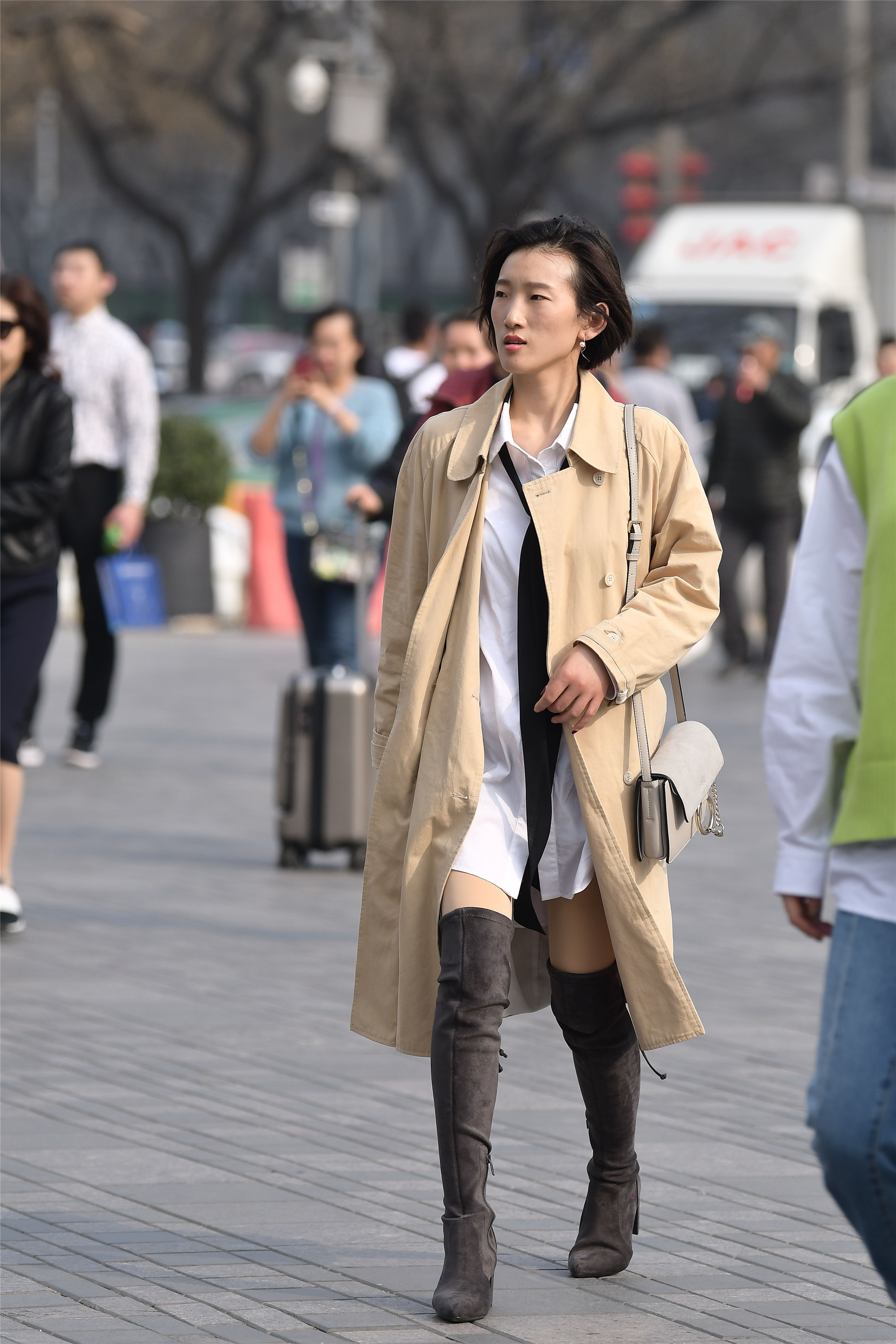 卡其色的风衣,总是有一种单薄的感觉,有着休闲的感觉,而且也显得淡雅,搭配白色的长款衬衣,不用搭配裙子,更有不一样的搭配感觉,姑娘选择的黑色类似领带的装饰,更是增加时尚感觉,一双深灰色的过膝靴,增加搭配的层次感,也有着不错的保暖效果,姑娘一头扣发,却被打理的很整齐,从搭配上看,姑娘是一个很注意细节的人。