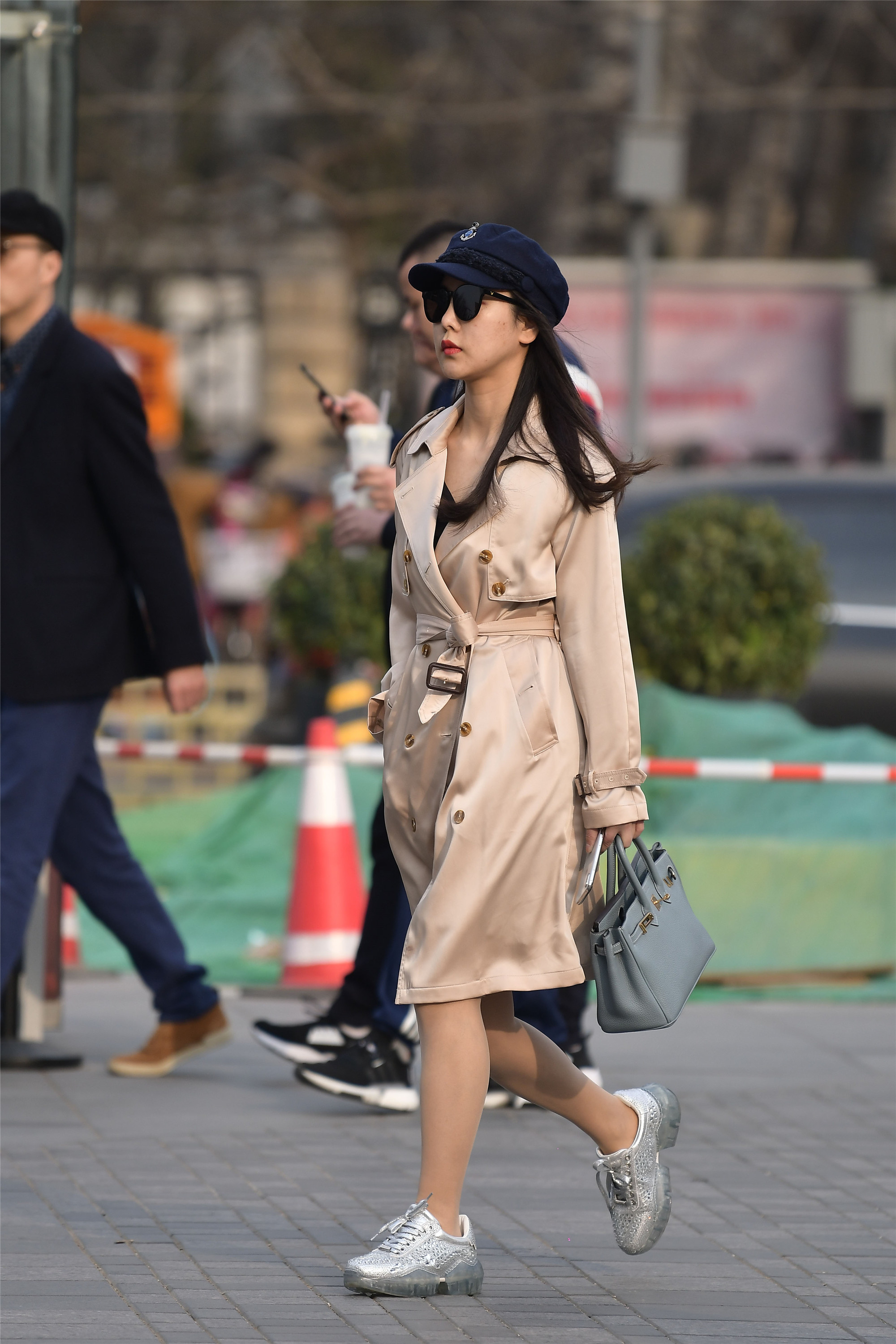 姑娘这款风衣,很个性,她的身材不是很高挑,选择这款及膝的风衣非常合适,腰带系上,这样有着修身和显身材比例的效果,而且腰线位置要高一些,这样才会更好看,一顶深蓝色的帽子,头发自然垂下,一双银灰色的运动鞋,搭配出休闲的风格。