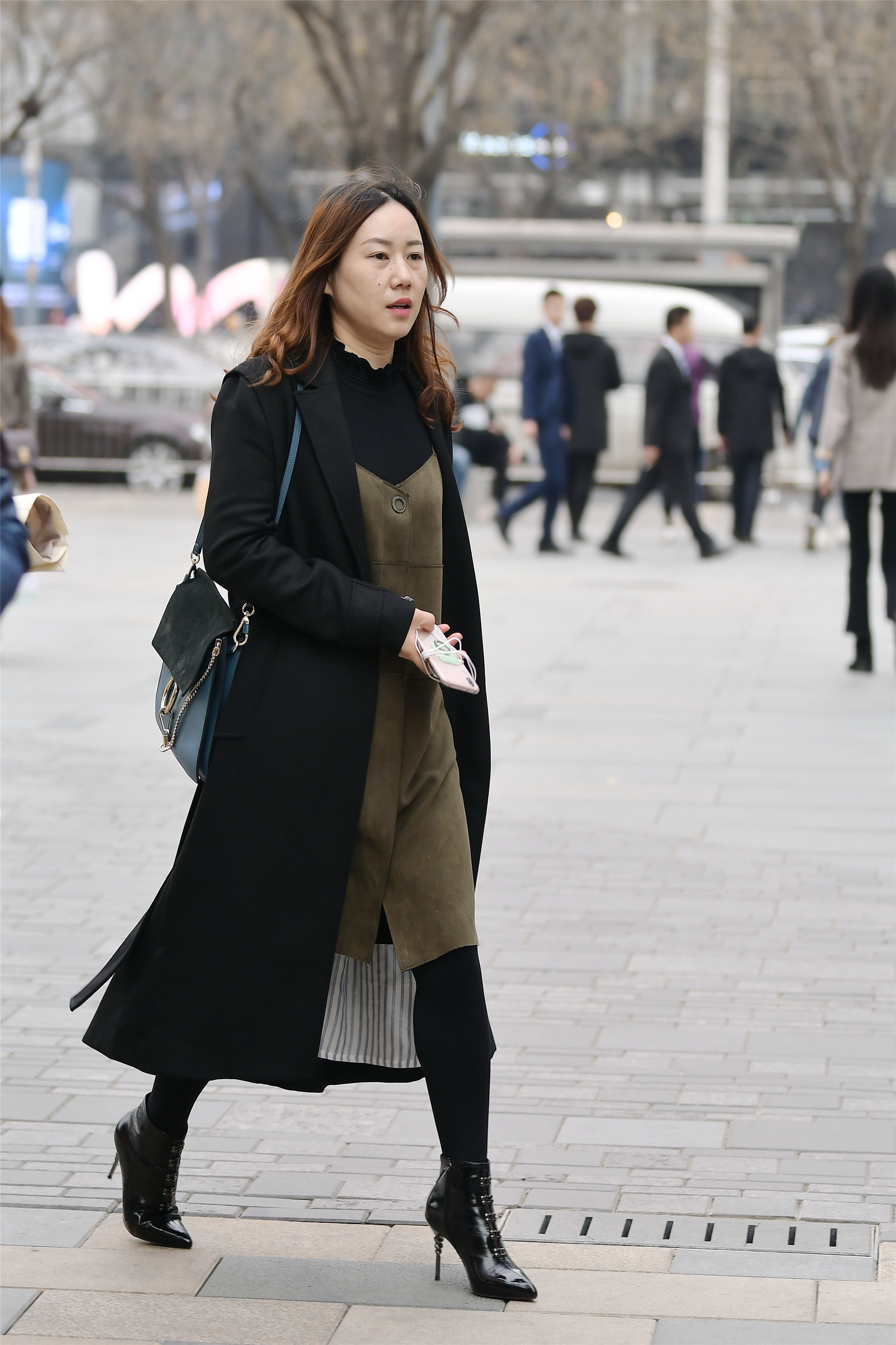 这位姐姐也是很会搭配深色系的,在春天搭配深色系出门,真的要精心准备一下,黑色风衣,过膝的长度,春天搭配很合适,墨绿色吊带裙,还搭配一件黑色高领针织内搭,显得很有层次感,黑色打底裤搭配一双黑色尖头漆皮细高跟短靴,让整体的黑色质感有了不一样的变化,更加精彩。