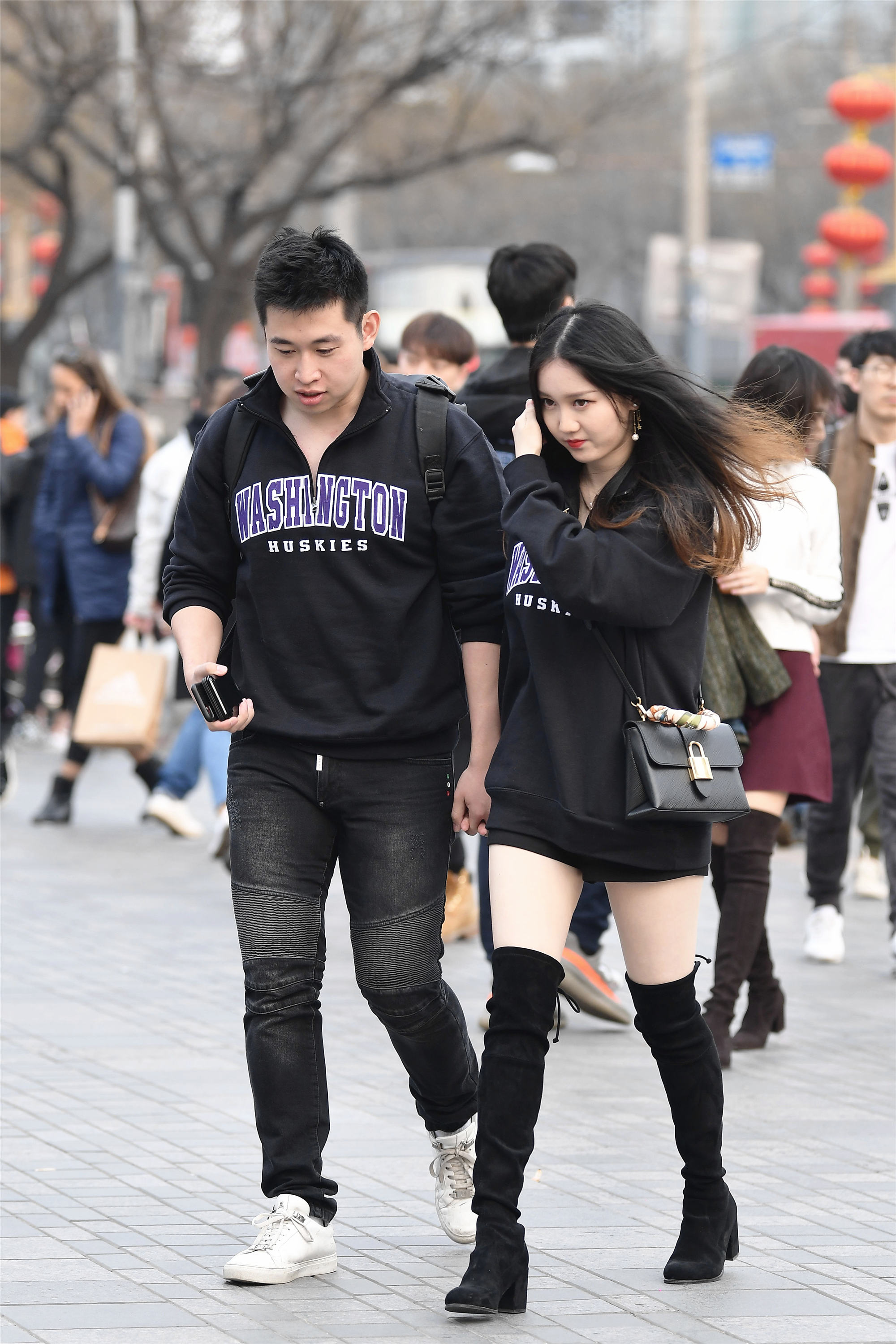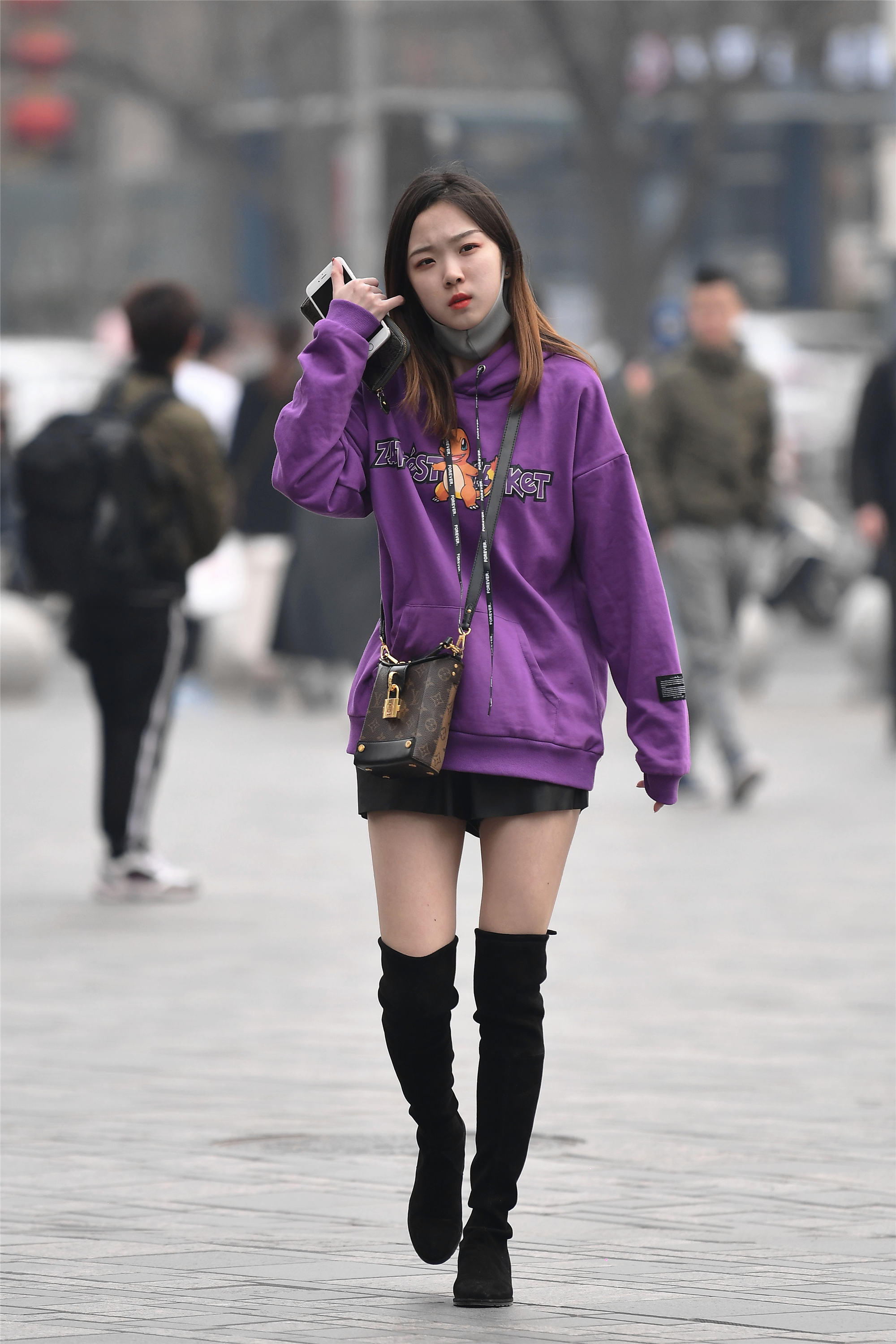 帽衫可以搭配出时尚的感觉,也可以展示另一种性感,看一下这位美女的的搭配,一件紫色的帽衫,搭配黑色短裙,帽衫遮住一部分短裙,露出边缘,一双过膝靴,露出一段腿部,彰显骨感身材,这样就很好的搭配出来,上身还是很保暖的搭配,更适合春季搭配出门,时尚的姑娘,她们很会搭配衣服,同样的衣服,她们会展现出不同的风格,所以没有不能穿的衣服,只有不会搭配的人。