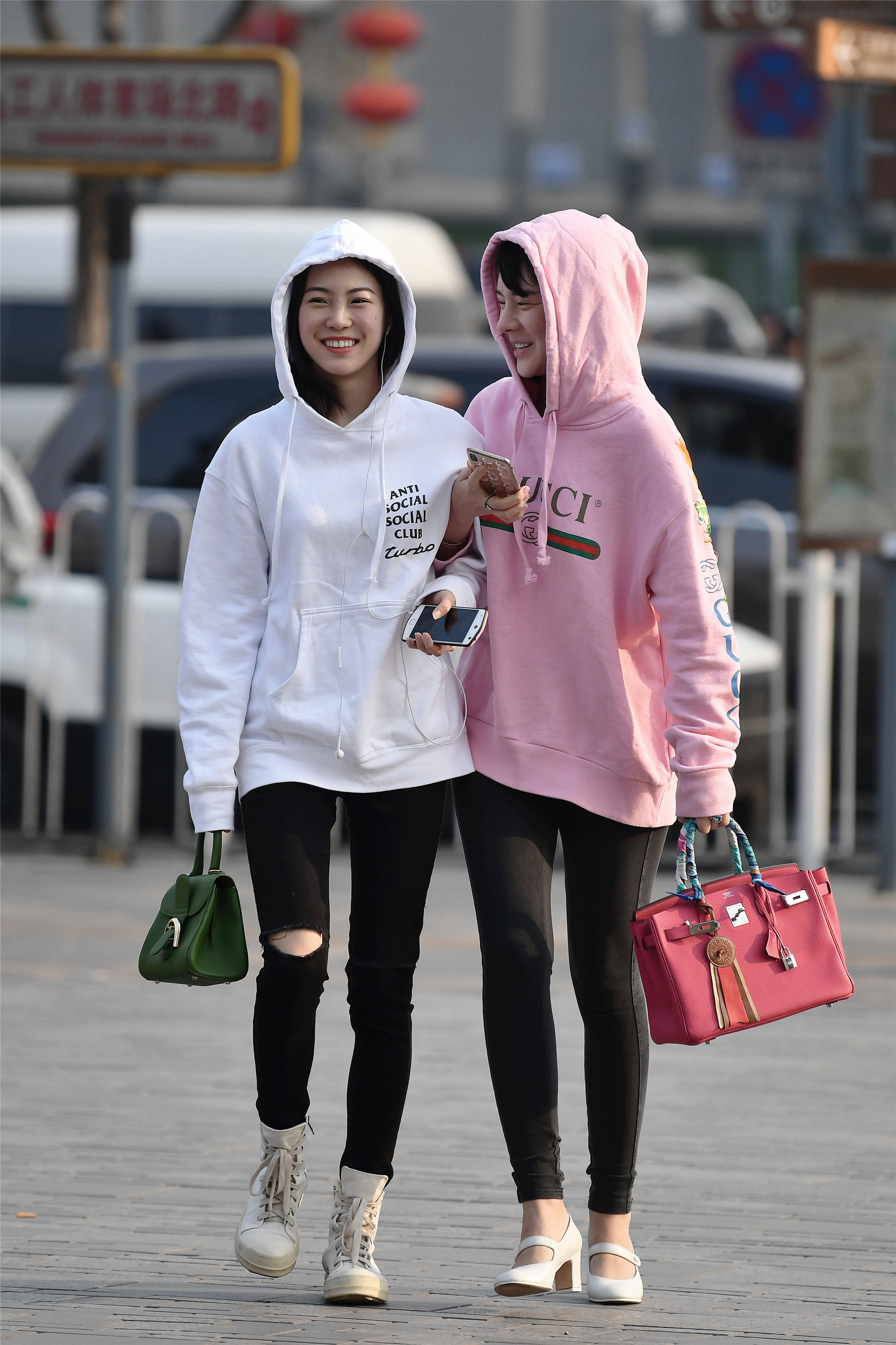 这一对都选择了帽衫,一位是白色帽衫,显得人很年轻干净,一位是粉色帽衫,是不是有着粉嫩的效果呢?而且她们都把帽子带起来,如果有人和你一起选择相容款式的衣服出门,你是不是也会很高兴呢?其实这是一件挺有意思的事情,选择黑色修身裤,也是相同的味道,高跟鞋和马丁短靴,也有了一点差异化。