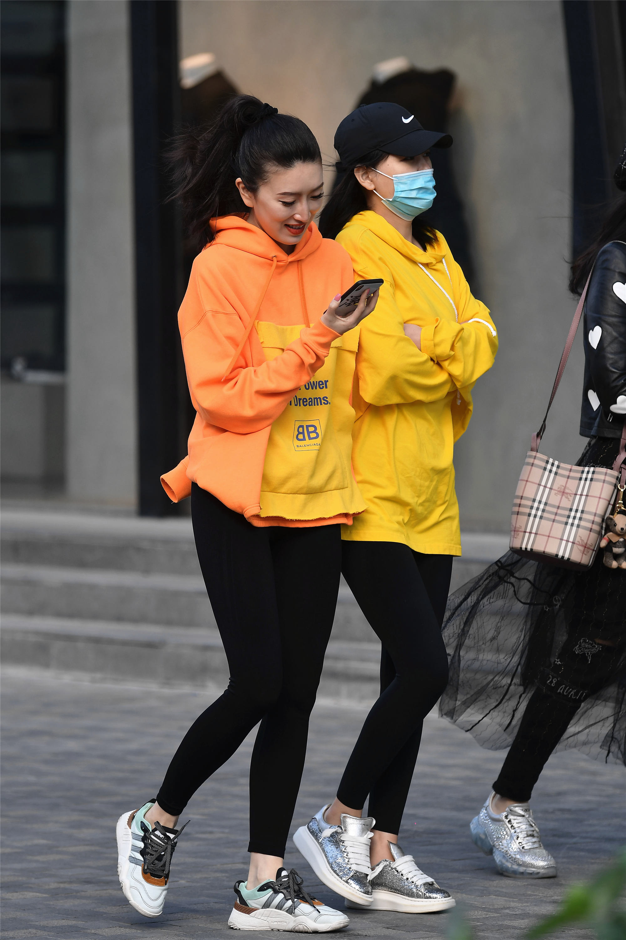 如果有闺蜜和你一起逛街,还都是很喜欢穿着帽衫的,是不是会搭配出很精彩的感觉呢?在春天出门,要选择一些色彩,这两位美女,她们选择橙色和黄色帽衫,色彩特别的鲜艳,走在人群中会很容易看到她们,黑色的打底裤,让她们身材看起来更加游行,运动鞋和平板鞋,让逛街更加轻松。