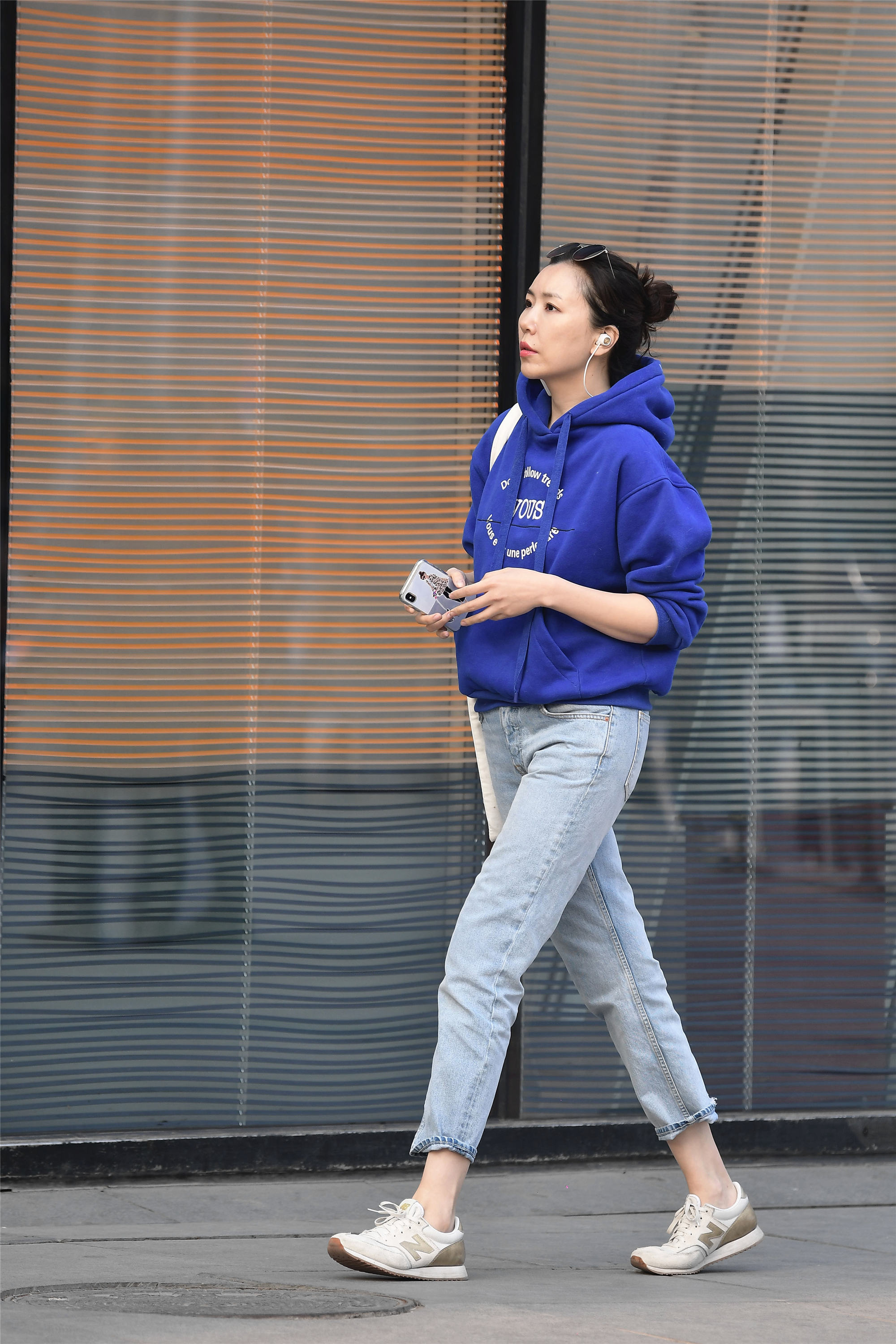 帽衫不是很多人都穿,很多人会觉得这样的衣服有些装嫩,又不会搭配出性感的味道,而喜欢穿着帽衫的人,会很好的搭配一下,有着很不错的减龄效果,这位美女穿着一件宝石蓝短款的帽衫,一条水洗蓝的九分牛仔裤,一双浅色的运动鞋,休闲的搭配风格,也可以搭配出很显身材的效果。