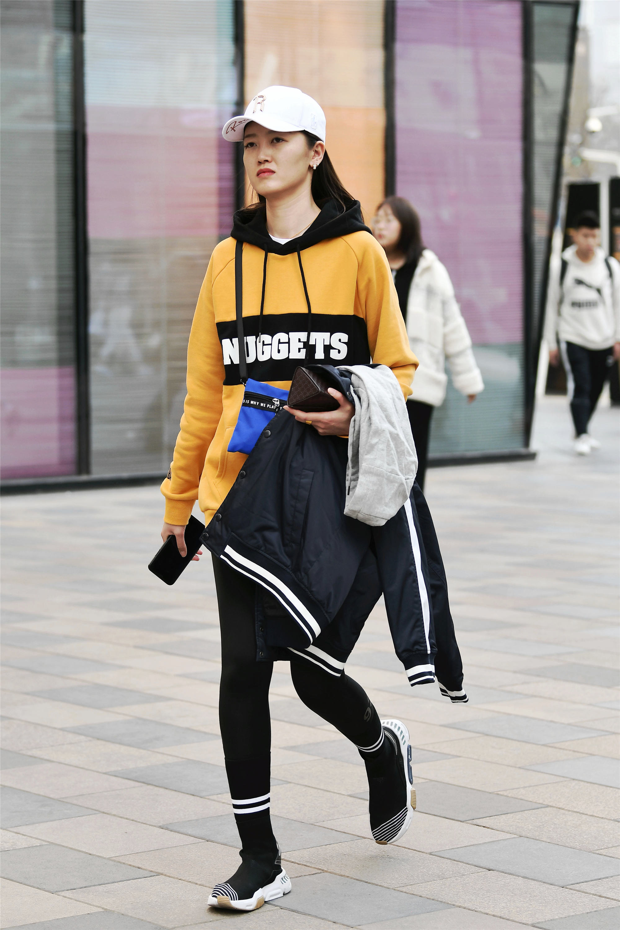 帽衫上还是多一些变化更好,色彩会丰富一些,也会有着不一样的感觉,这位美女选择一款黄色的长款帽衫,帽衫尚得帽子确实黑色的,前边也是黑色方块里面白色的logo,增加个性,黑色修身的打底裤搭配一双运动鞋,白色鸭舌帽,整体的运动风格很不错,夹克搭在臂弯里,姑娘身材高挑,也会很穿搭,这一身运动休闲风搭,很适合春天逛街。