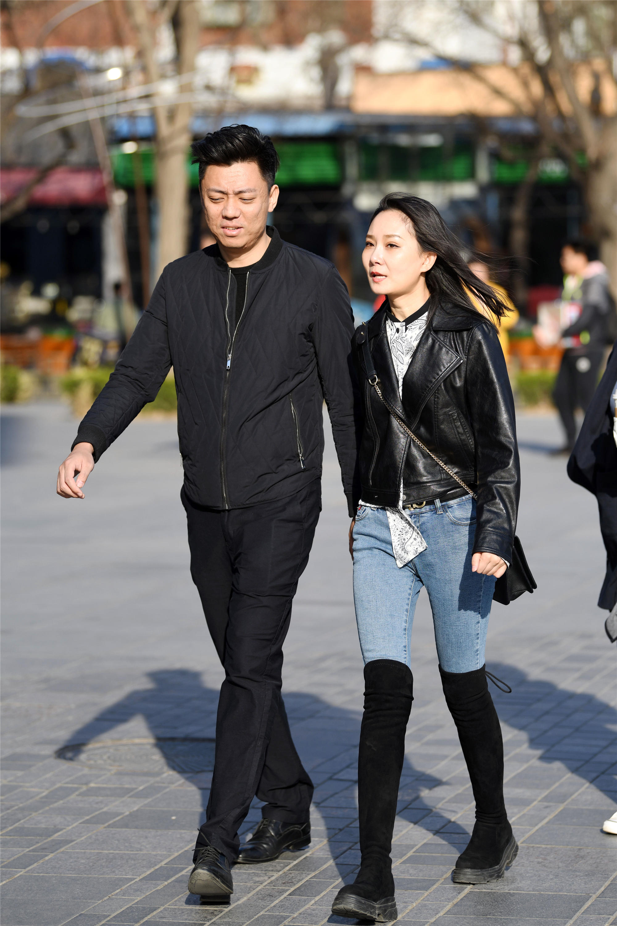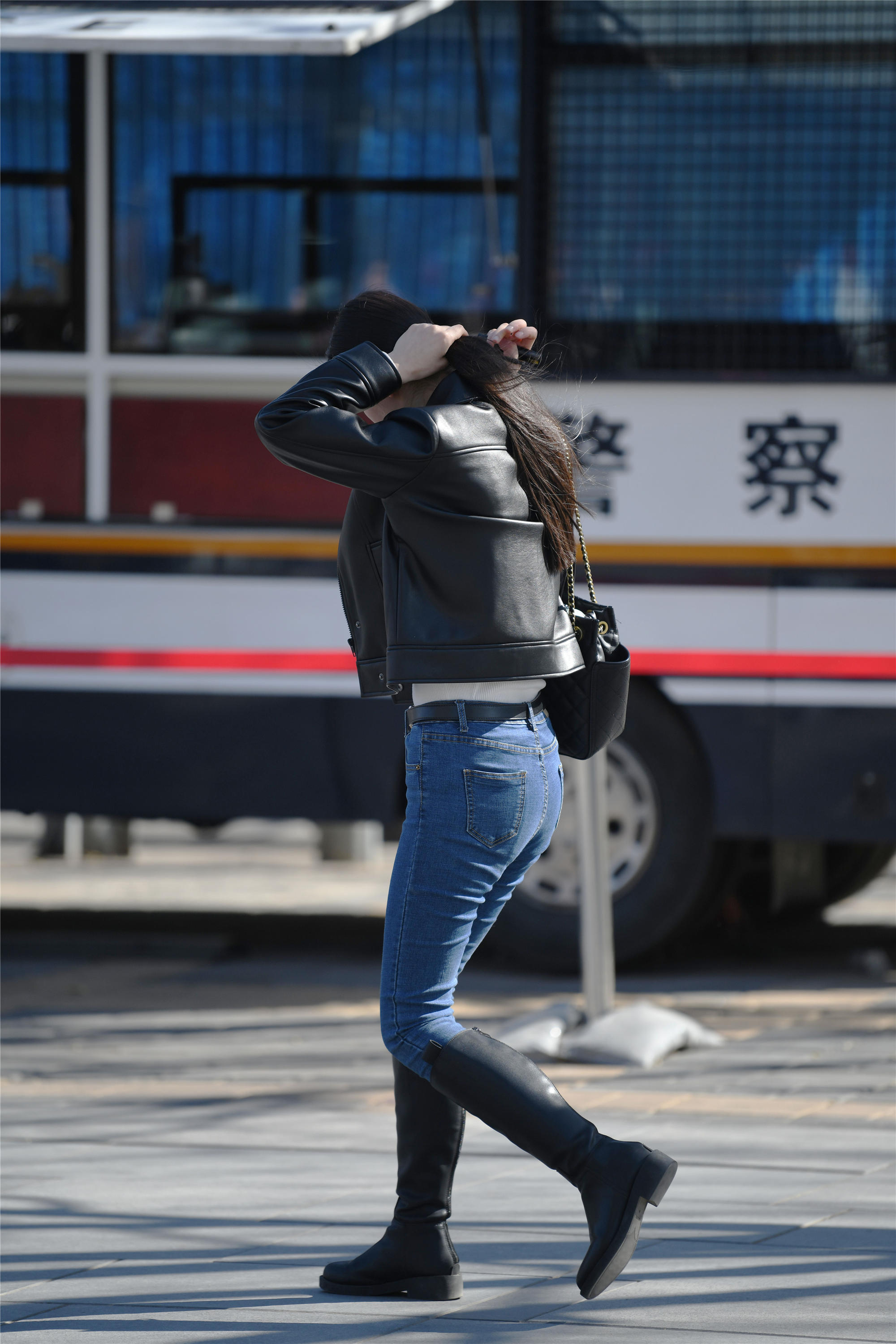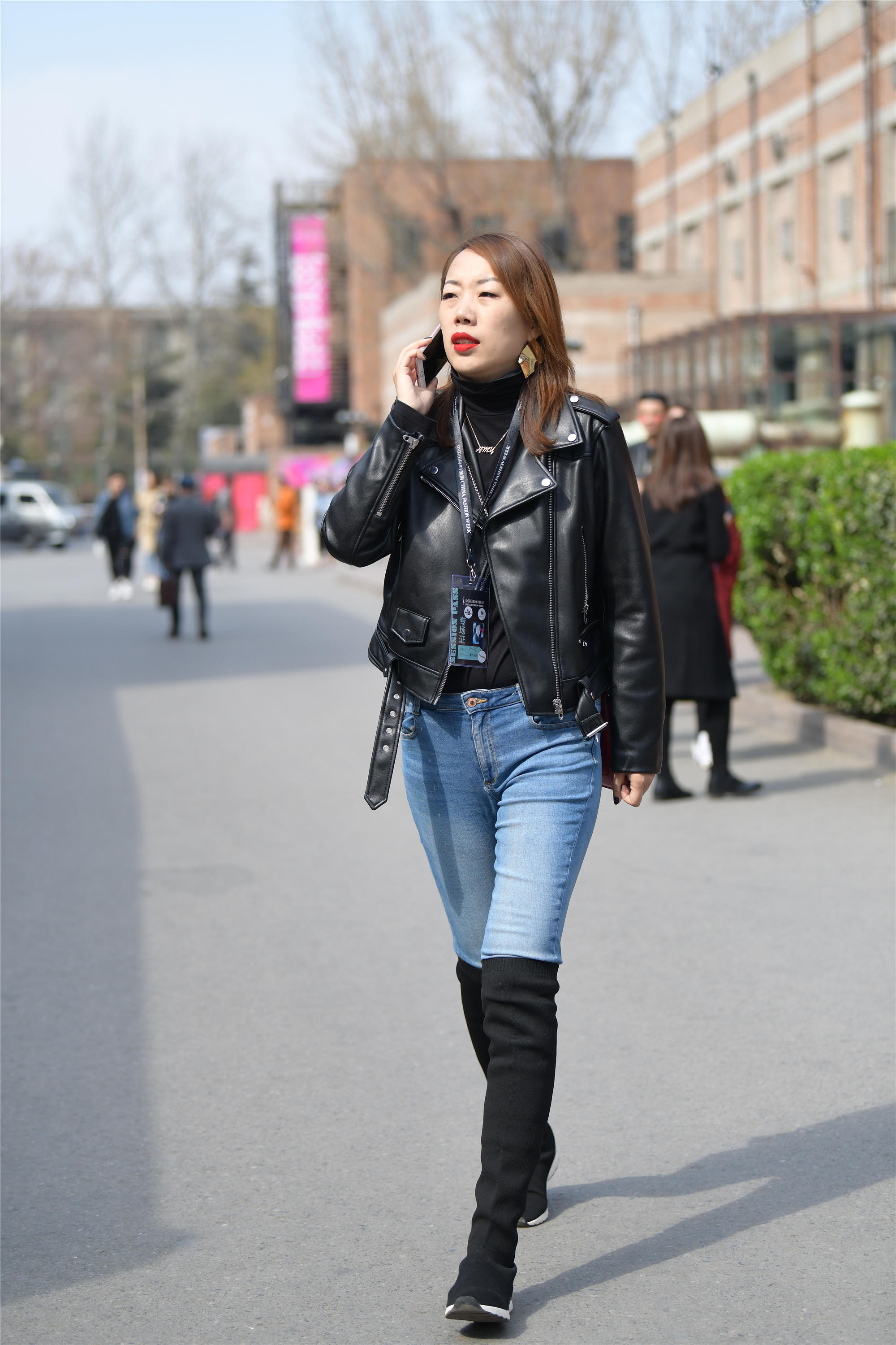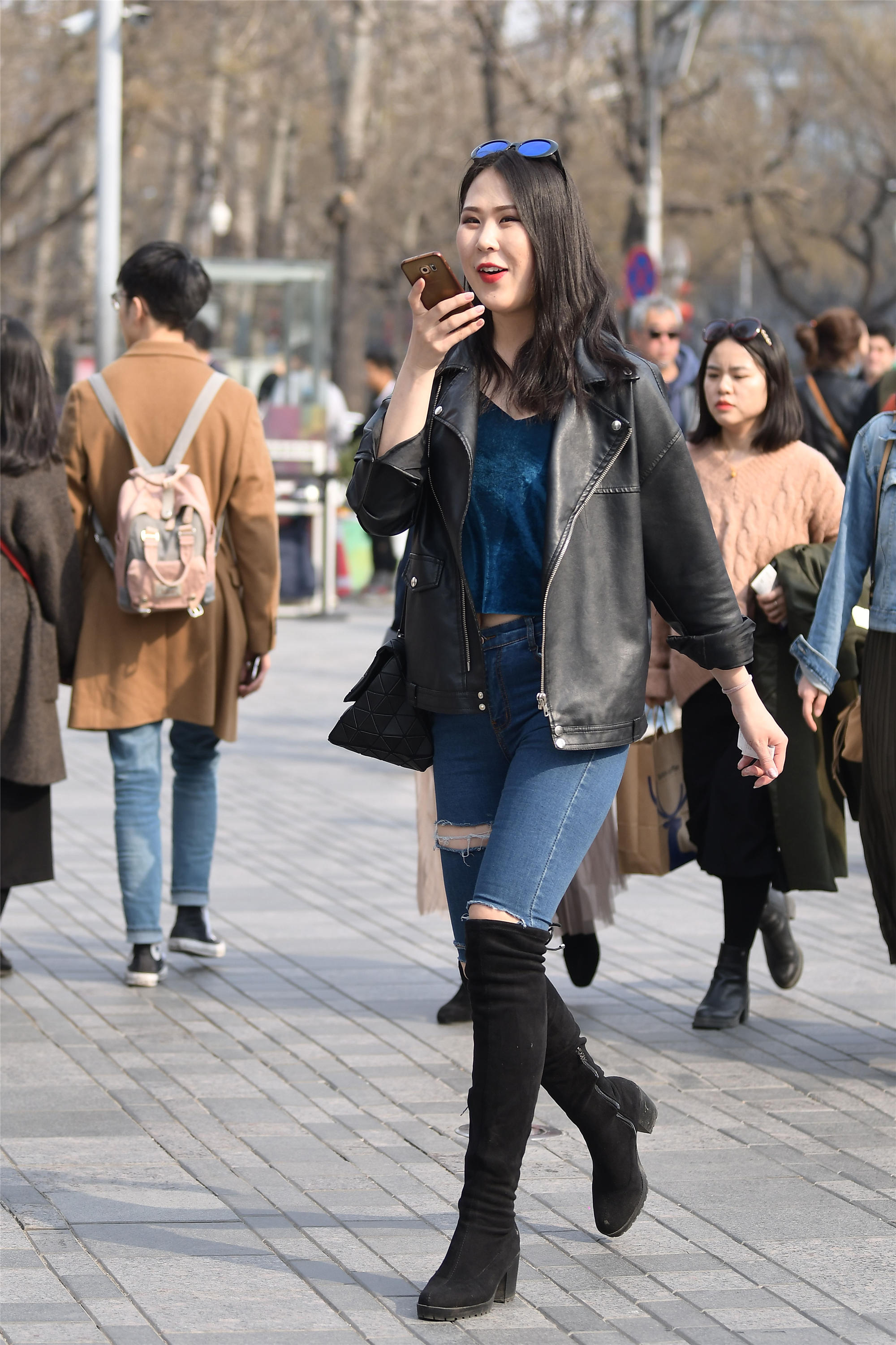 春天里的时尚姑娘,她们会把自己搭配的很美,也会注意保暖,看一下这位姑娘的搭配,蓝色低腰修身牛仔裤,膝盖处做了破洞处理,也是紧跟着时尚的步伐,还透着自己的个性,一双黑色绒面长靴,靴筒感好到膝盖位置,露出那个破洞,粗跟不高,却也有着增高的效果,穿着一款黑色简约的皮夹克,搭配一件蓝色V领小衫,走路的时候,还秀出腰线,可以看出,姑娘对自己搭配很用心的。