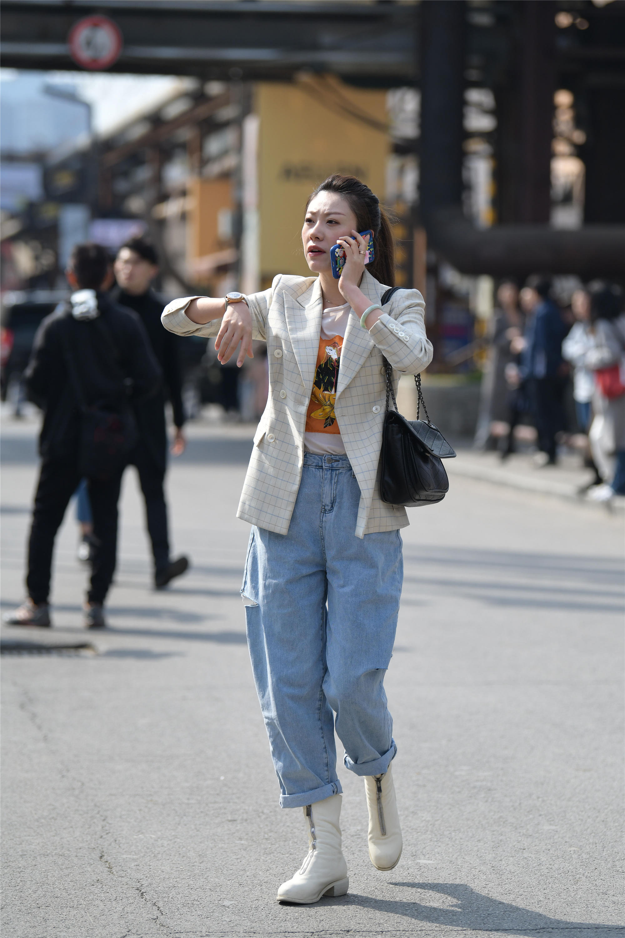 春天的牛仔裤是搭配长靴还是短靴,要看牛仔裤的款式,也有个人的喜好,这位姑娘选择宽松的中腰牛仔裤,还有破洞,挽起裤脚,穿着一双米白色的短靴,金属拉链在中间的位置,很多姑娘都穿着这款短靴出行,上身的米色格子西服,搭配浅色半袖,这样一身混搭风格,更偏向于休闲的味道,还显得很时尚。