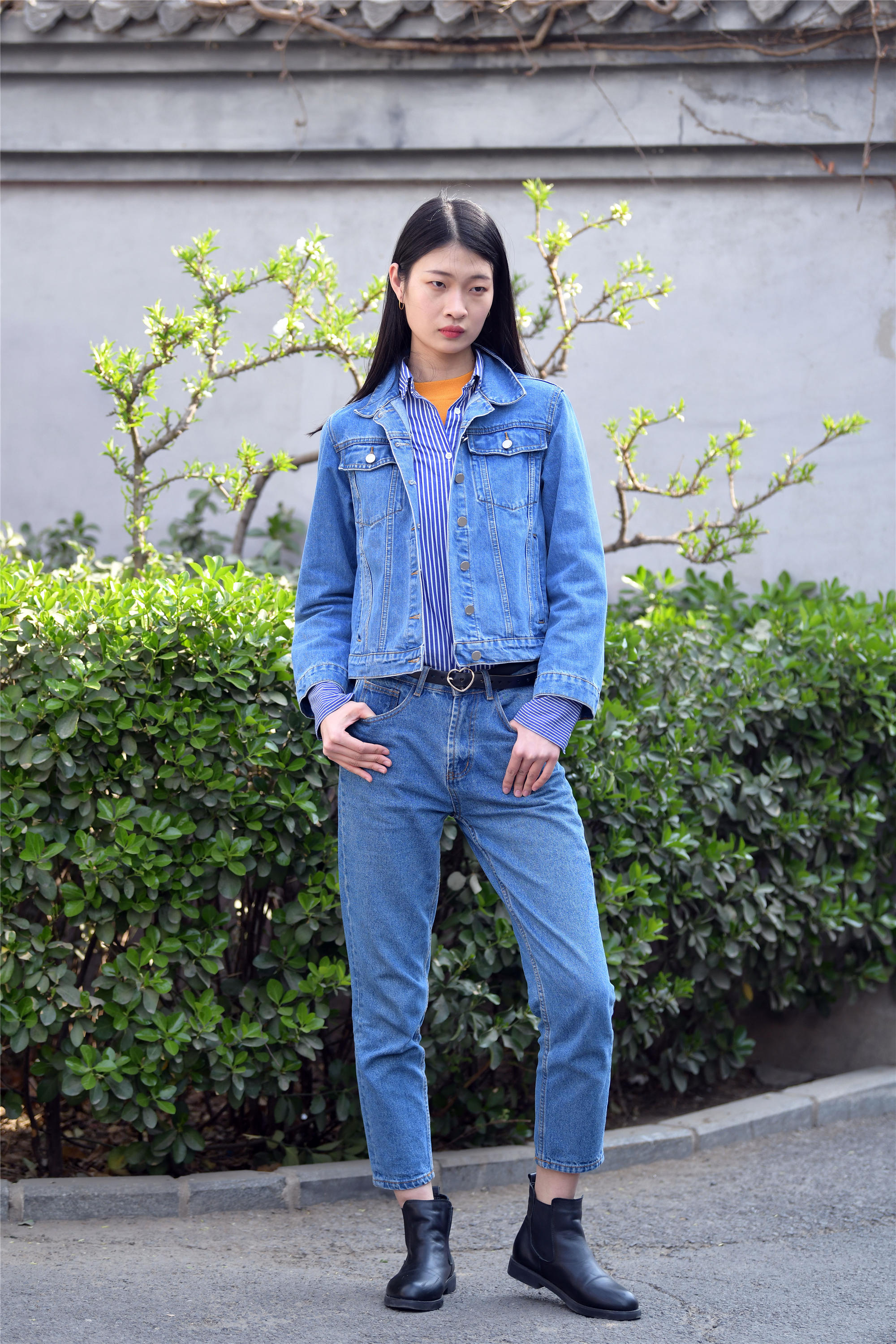 春天穿着牛仔套装,也会显得很酷,小姐姐一条九分的蓝色直筒牛仔裤,裤腿不是很宽,显得人很秀气,搭配一双黑色圆头皮短靴,和黑色皮腰于黑发带相呼应,一件蓝色牛仔夹克,显得人很精神,蓝白色竖条格衬衫,显得人纤瘦修长,姑娘选择的衣服很简单,却搭配出很不错的效果。
