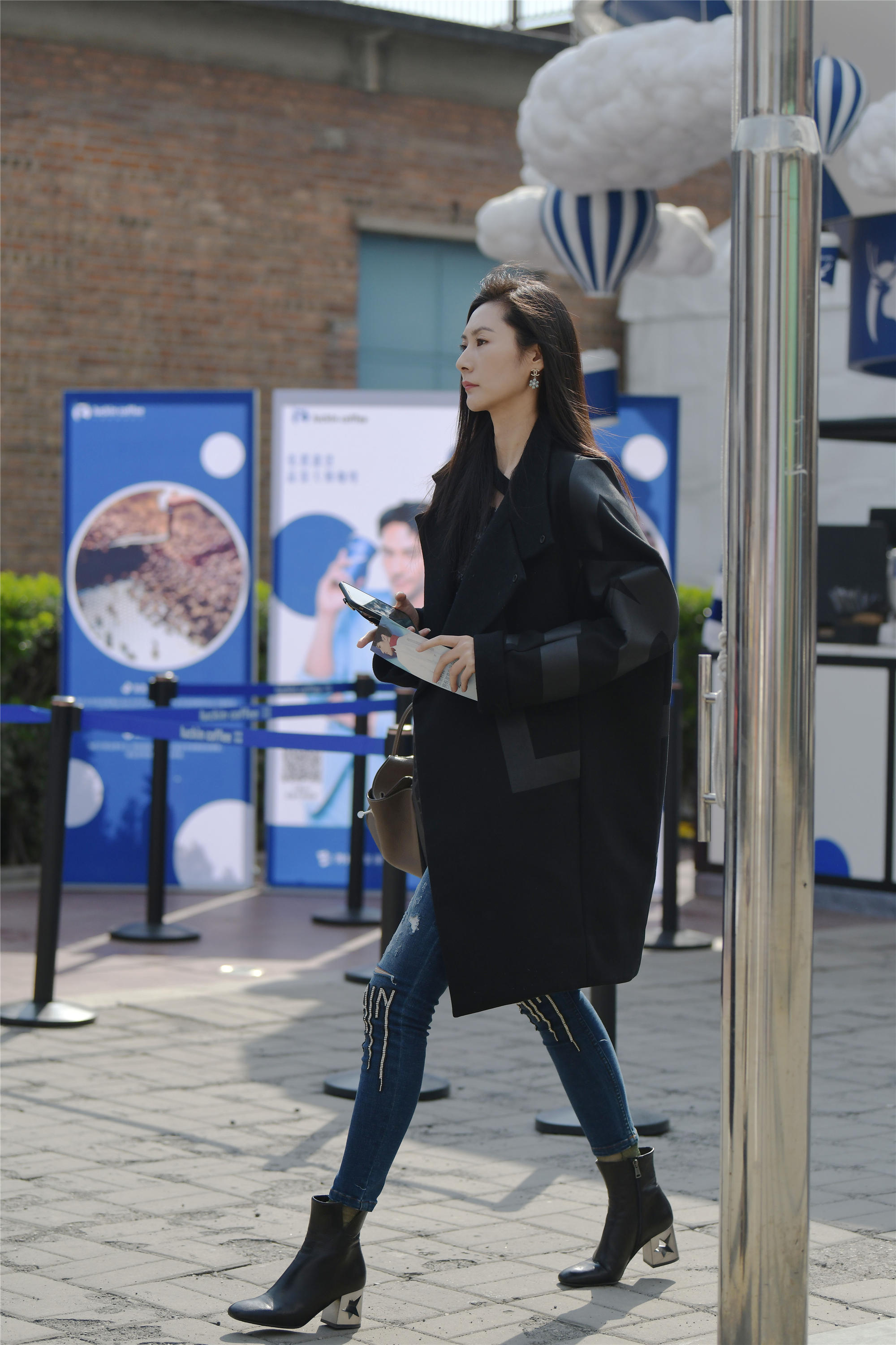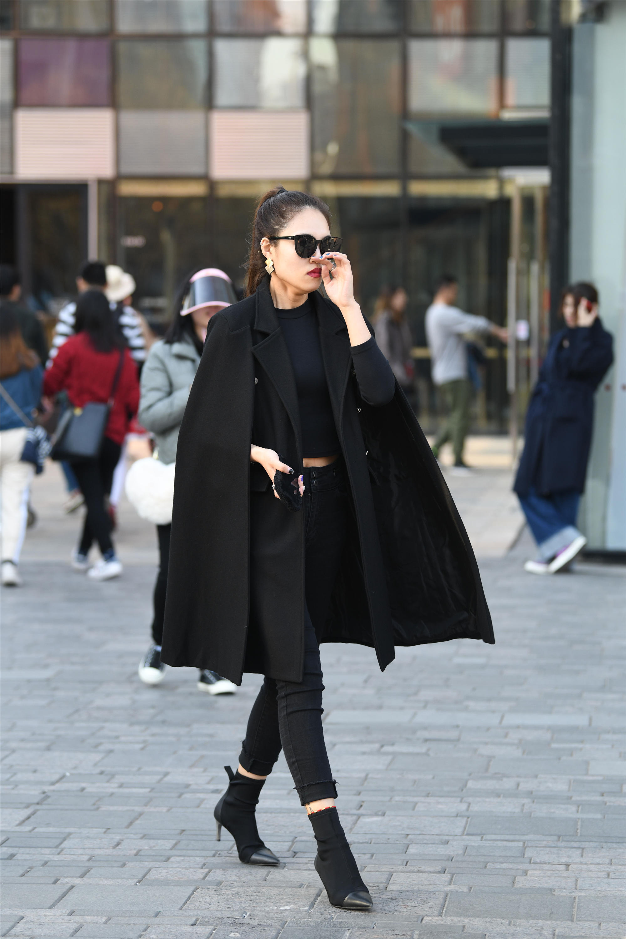 每一位时尚的姑娘,她们都有着自己的搭配想法,一身黑色的姑娘,依旧搭配出很精彩的时装,黑色的斗篷,非常个性,这几年一直有人在穿,黑色短款的修身小衫和黑色高腰修身牛仔裤搭配在一起,露出腰线,显得身材比例特别好,牛仔裤的裤腿挽起一点,和脚下的尖头细跟短靴的靴筒分开,露出一点小腿,显得人更纤瘦。