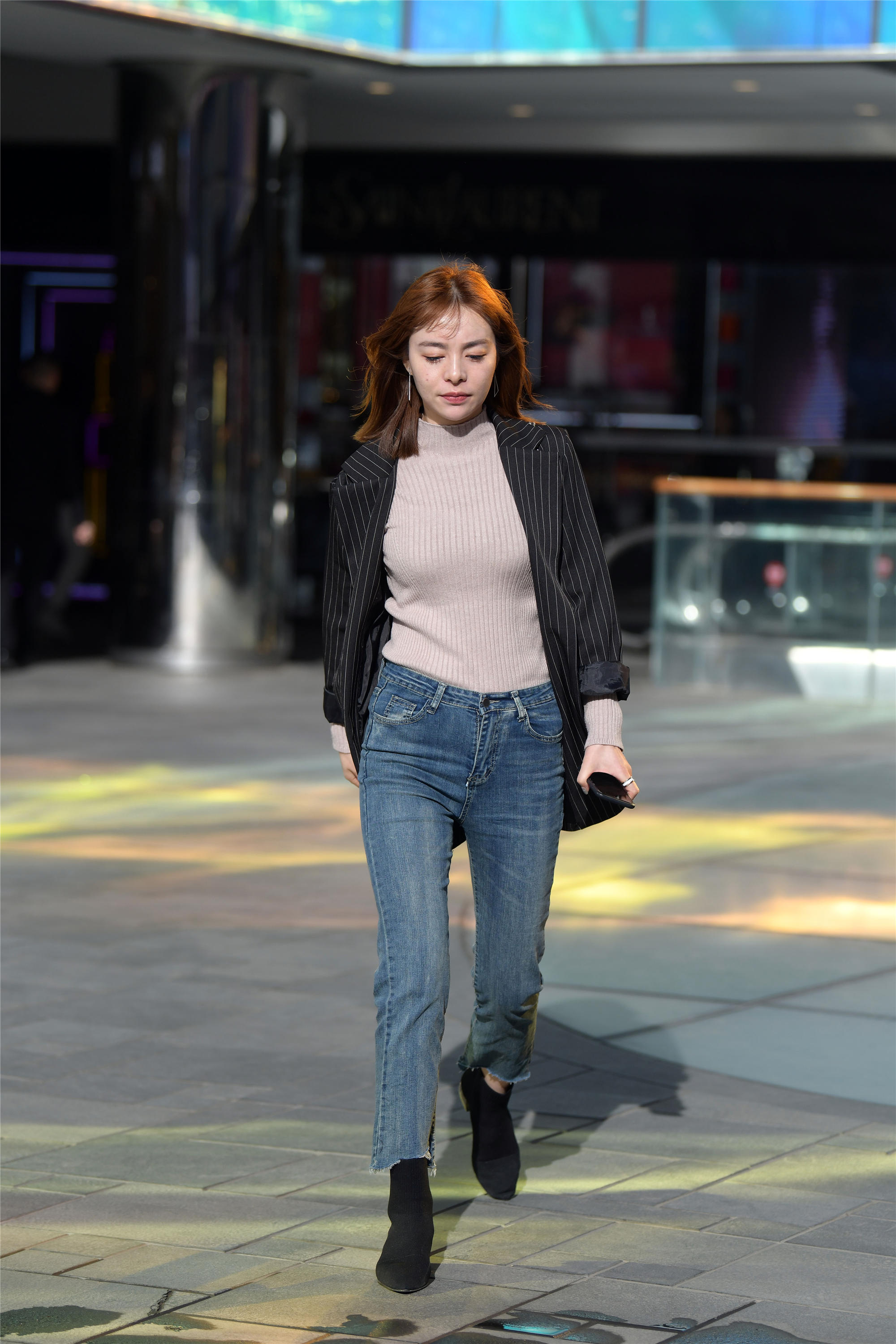 穿着牛仔裤,总要和别人不一样一些才好,所以搭配也很重要,这位姑娘穿着一款低腰的牛仔裤,裤腿被裁剪一下,九分裤长更好衬托脚下的短款袜靴,而且也看出姑娘是很瘦的,藕荷色的针织衫,外面是黑色竖条格的西服,这样的搭配风格,今年很多人都在搭配,有着休闲的味道,也有着干练的风格,上班逛街都很实用的穿搭。