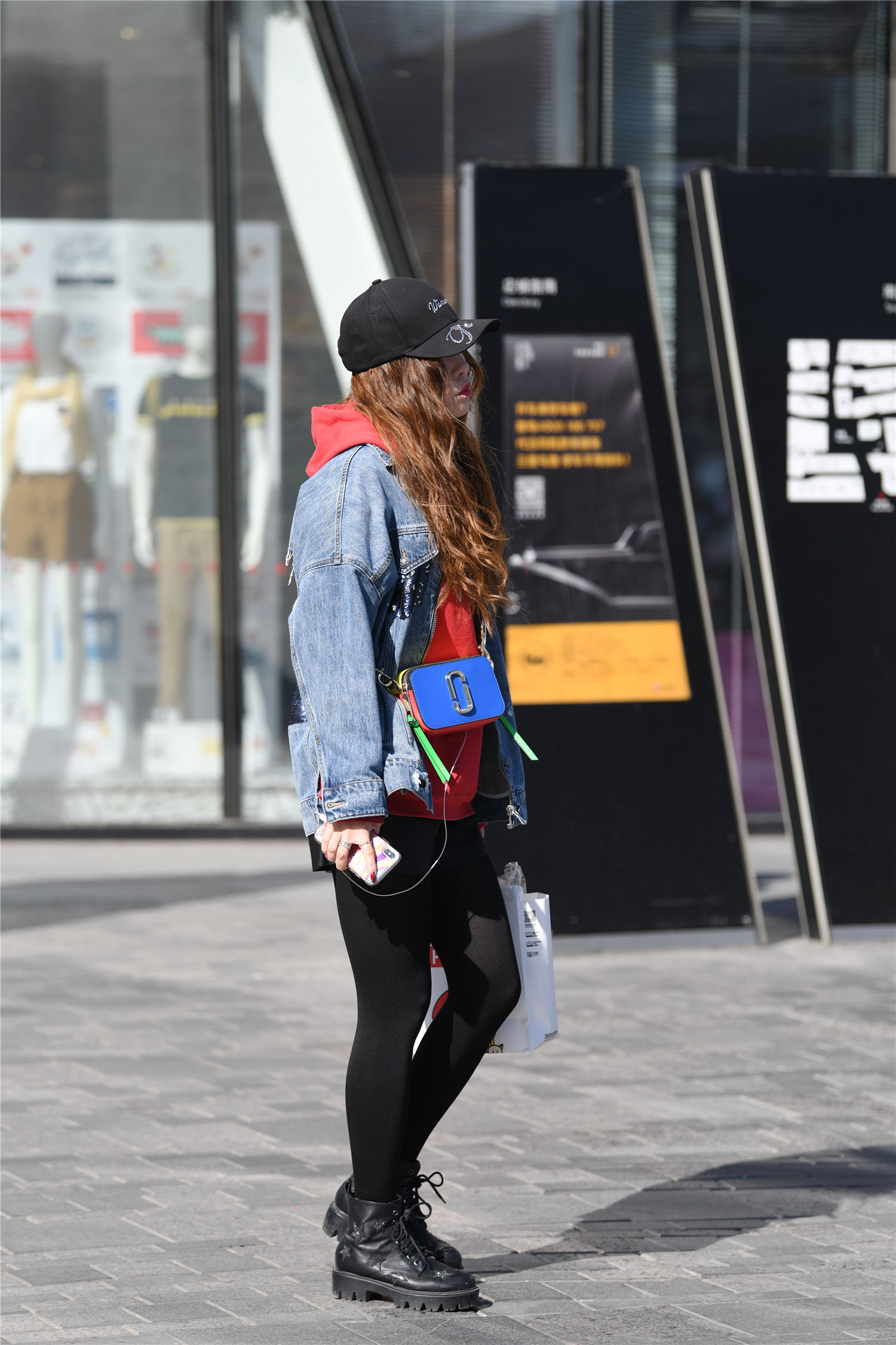 有了百搭的黑色打底袜,春天就可以好好的逛街了,是选择一双高跟鞋,还是选择平底鞋来搭配,其实每个人想法都不一样,很多人愿意穿着平底鞋逛街,她们就是想放松,穿着保暖的衣服,看一下这位姑娘,选择一双平底的踝靴,非常舒适,黑色打底袜更显身材纤细匀称,牛仔夹克和红色卫衣,搭配在一起,色彩很鲜明,宝石蓝的单肩包,增加个性,一顶鸭舌帽,显得更年轻的效果,年轻人更喜欢搭配的更有层次和色彩。