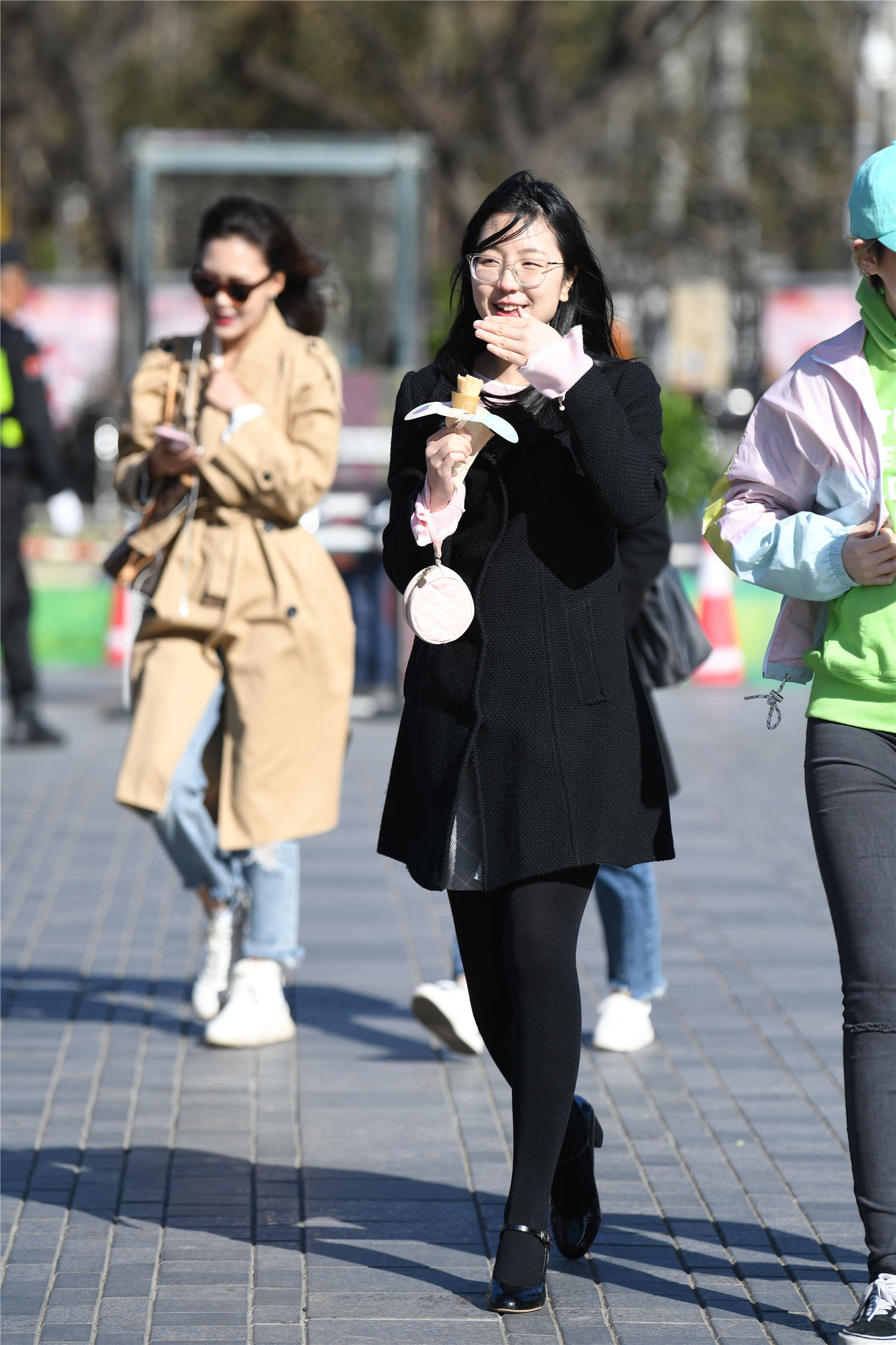 穿上打底袜很显瘦,还有着保暖效果,如果想身材高挑,可以选择一双高跟鞋,这个样身材看起来更显高挑了,黑色漆皮的高跟鞋,和打底袜的质感不一样,一个皮质的系带,穿过脚面,走路时候鞋子更合脚,黑色短款的粗纹理的半身大衣,显得人很低调,袖口的浅粉色,有带着十足的小女生感觉。