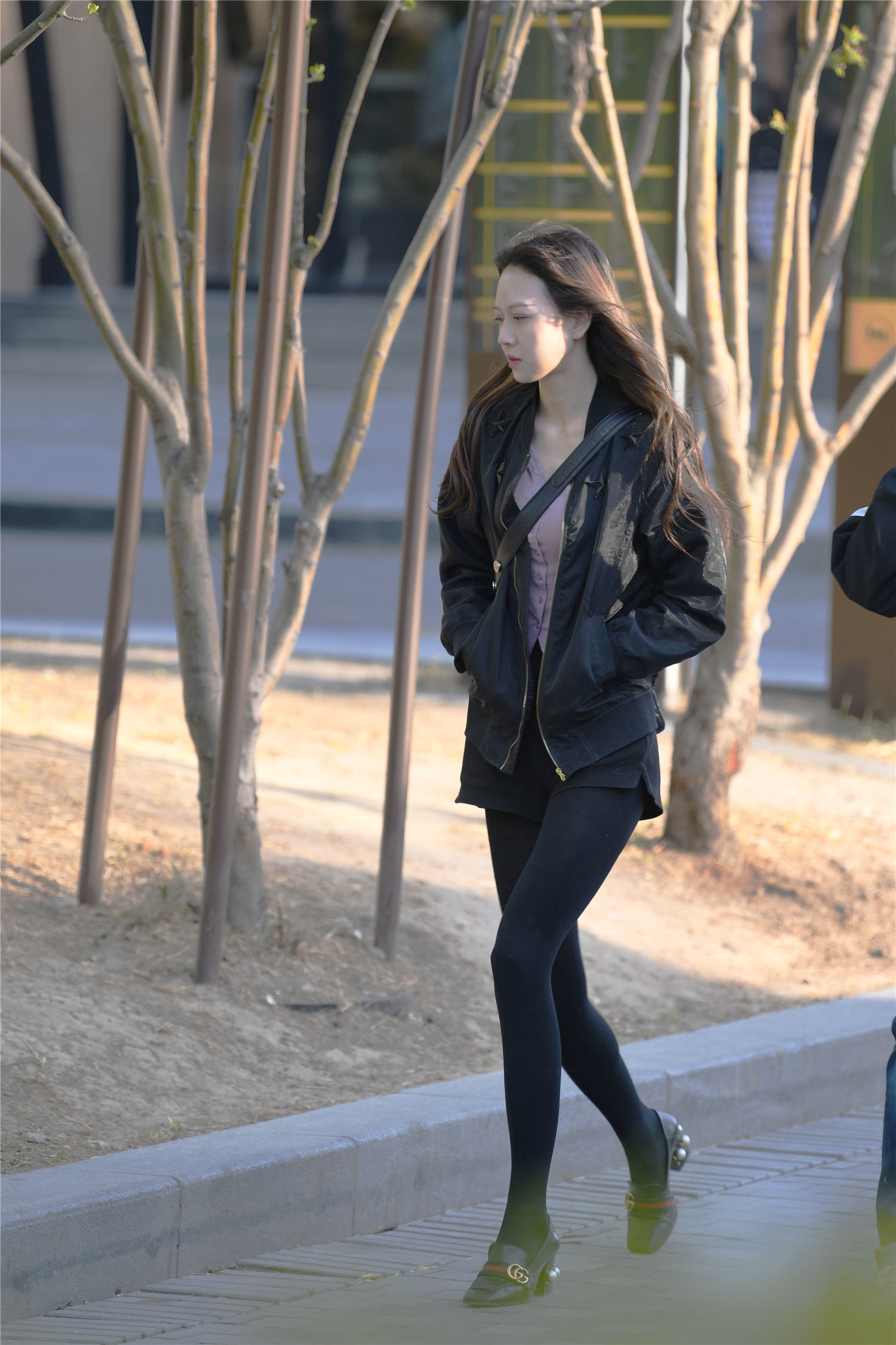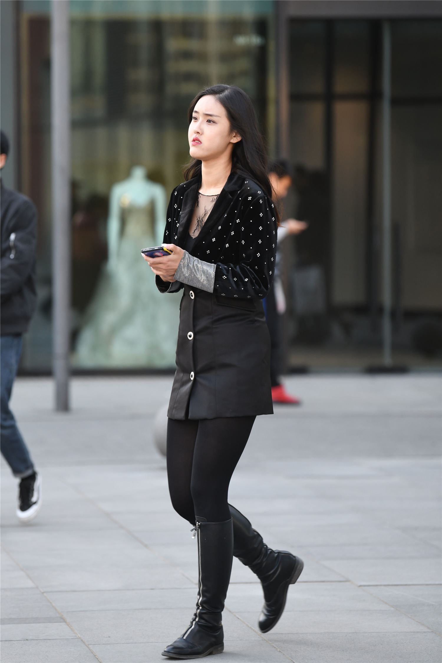 如果身材高挑纤瘦的姑娘,可以选择一款舒服的鞋子,搭配出来的效果依旧很好,这位姑娘选择一款方头的粗跟鞋子,也是非常经典时尚的一款靴子,有点男款的设计风格,鞋跟比一般男款鞋跟高一些,黑色打底袜,显出她的高挑匀称的身材,黑色夹克搭配一件藕粉色的修身小衫,及腰长发更显姑娘时尚大方。