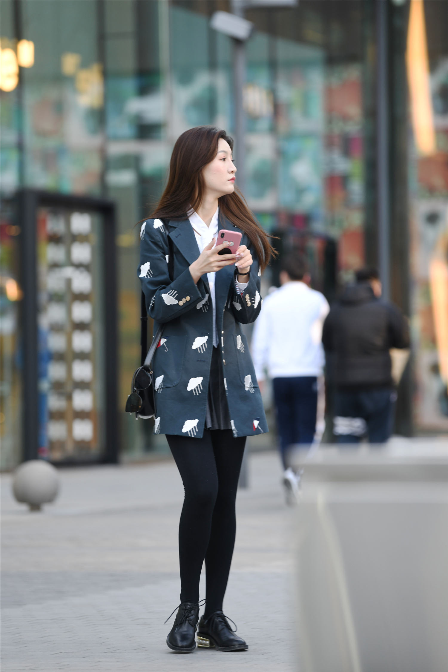 这位小姐姐选择一款深蓝色的西装来搭配,西装上面点缀着云雨图案,有着天去预报的感觉,白色衬衣,黑一条短裙,这样搭配打底袜就显得有些职业装的搭配风格了,黑色的系带皮鞋,鞋跟设计是珍珠,所以还是很高点的感觉,一身搭配,有着干练风格。