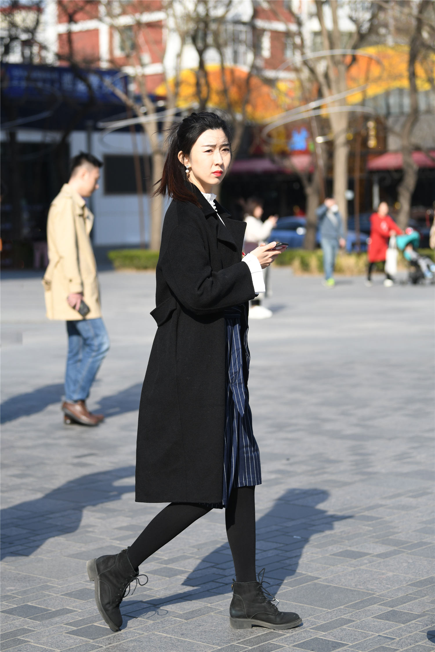 风衣搭配长裙,在春天搭配,非常合适,这位姑娘选择一款黑色及膝的风衣,打开衣襟,这样会露出她的蓝色条纹长裙,稍微比风衣短一些,这样会显的很干练,黑色打底袜搭配一双磨砂皮的平底短靴,有着工装鞋的感觉,显得人很干练。
