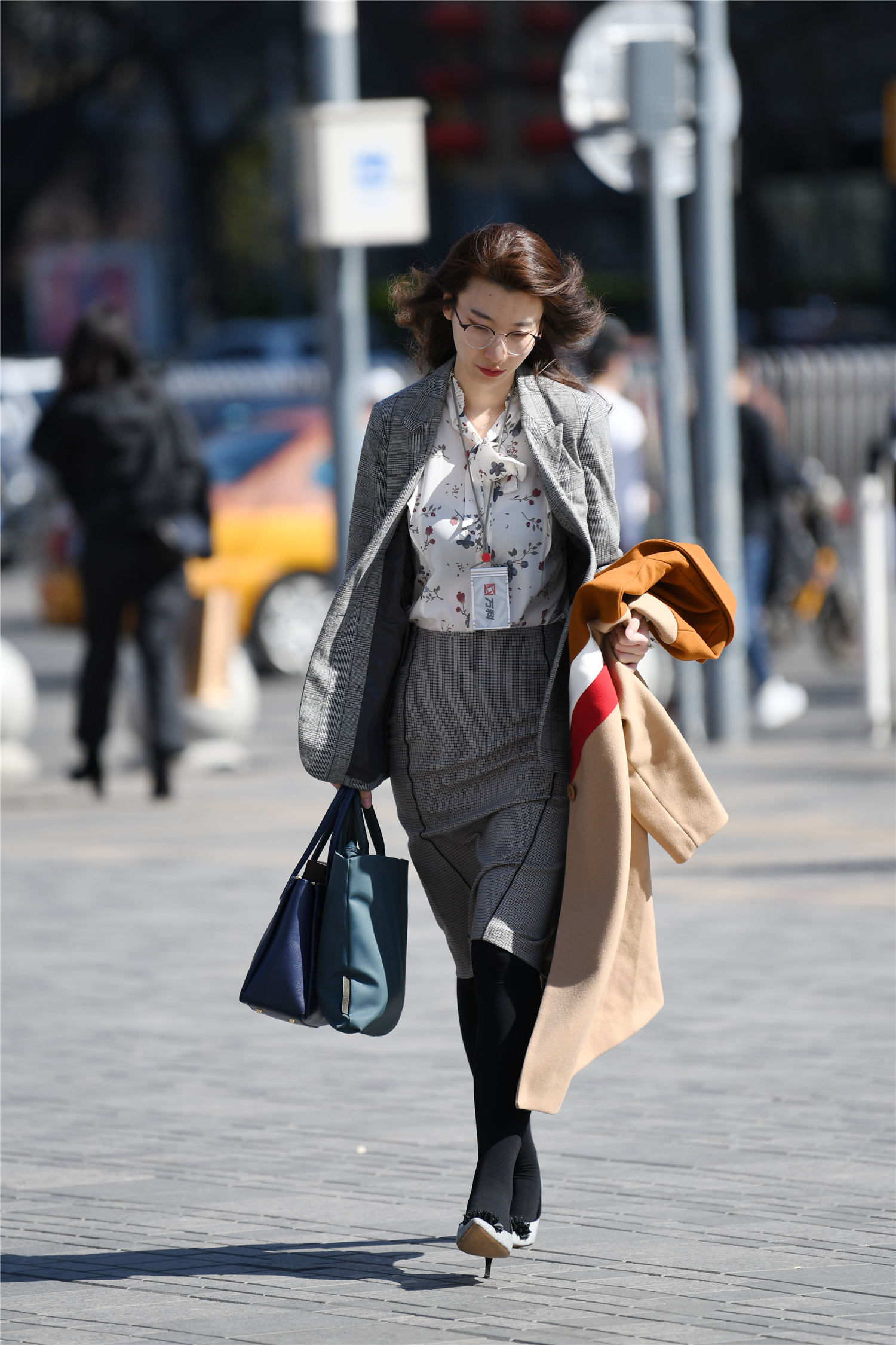 作为一名办公室人员,一身的职业装,也可以搭配出很时尚的效果,看一下这位姑娘的搭配,浅灰色条格西装,打开衣襟,露出她的白色纱料印花小衫,领口处设计的蝴蝶结,让她的搭配有层次感,还显得人很美,高腰的灰色细方格筒裙,让身材看起来更加的高挑,而且裙摆到膝盖位置,穿着黑色打底袜搭配一双银色尖头细跟,这样一位时尚的职业装搭配出来的,她的臂弯里还有一件风衣,更不怕气温变化了。