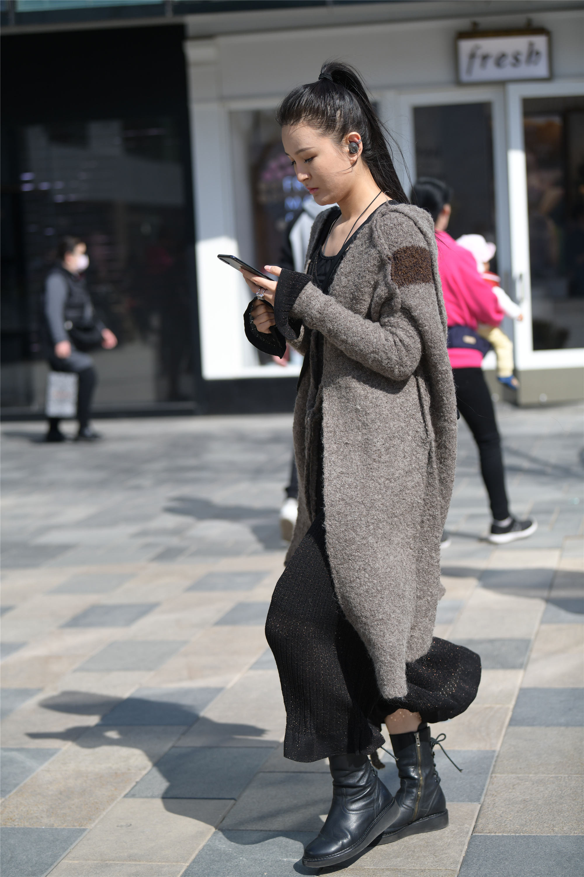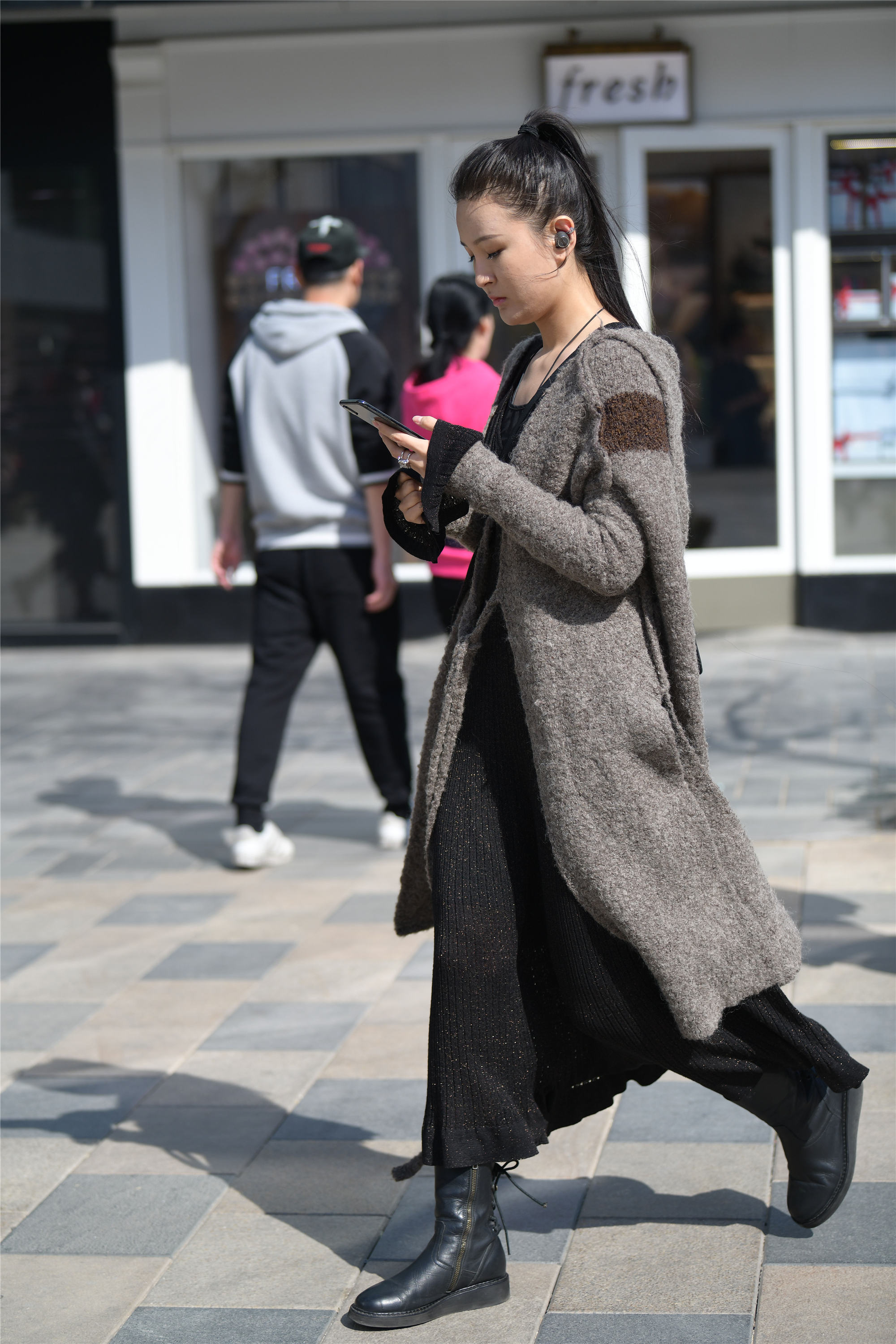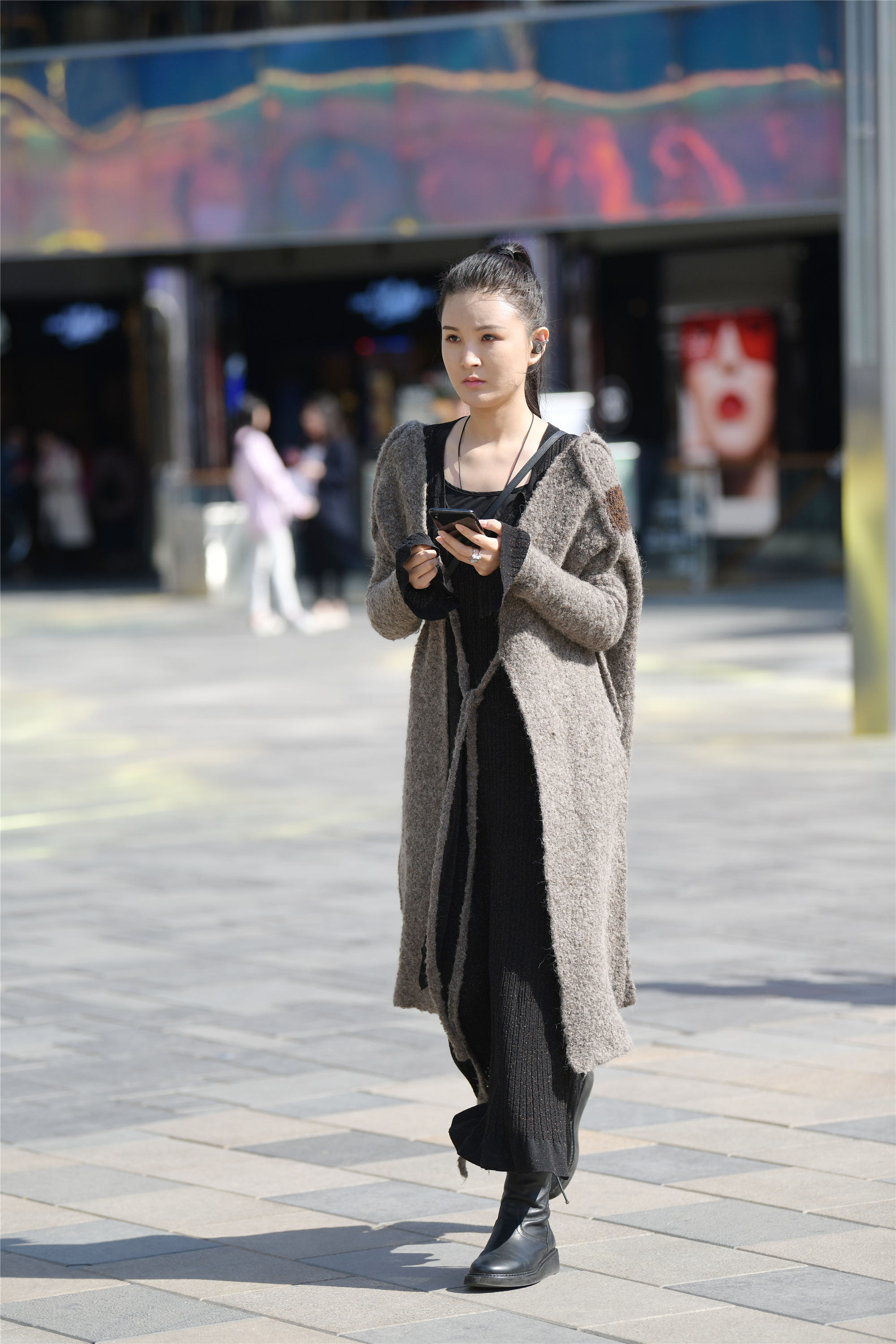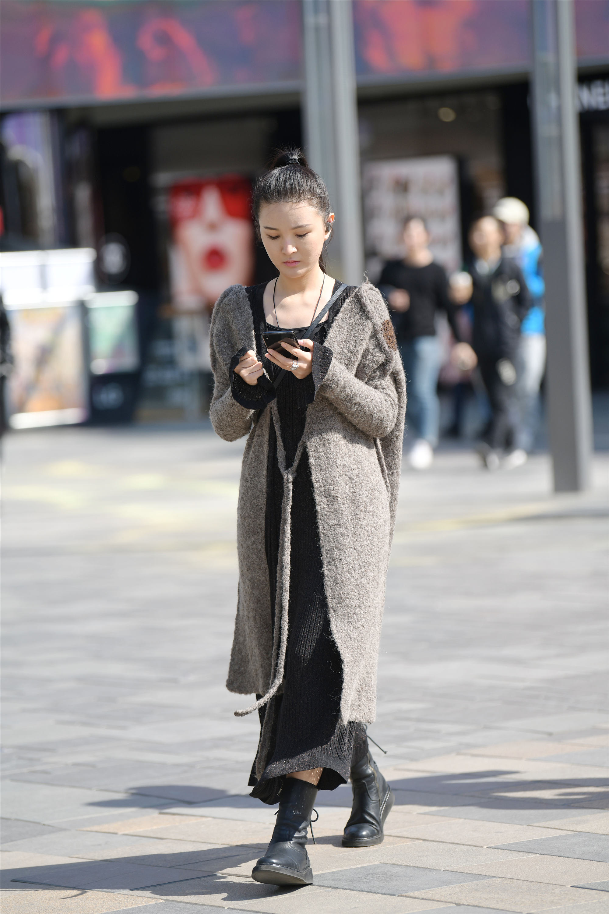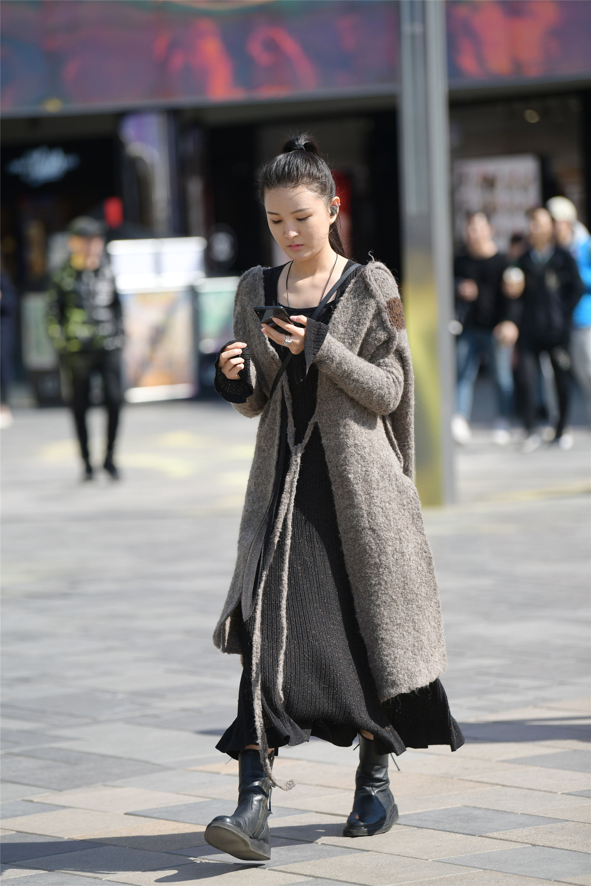 这位小姐姐,她的搭配其实很简单,也没有很性感的穿搭,一件黑色长款的连衣裙,搭配一件浅灰色羊绒大衣,质感非常好,大衣没有设计扣子,只是前边有个系带,这样的风格很有意思,衣摆稍微比长裙短一些,这样会更有层次感,一双皮质短靴,平底的款式,增加质感,这一身搭配显得人很清秀,特别是她把头发盘起来,梳成丸子头,显得人更加精神,给人一种出淤泥而不染的感觉,穿搭在一起还很显瘦,有着邻家女孩的感觉。