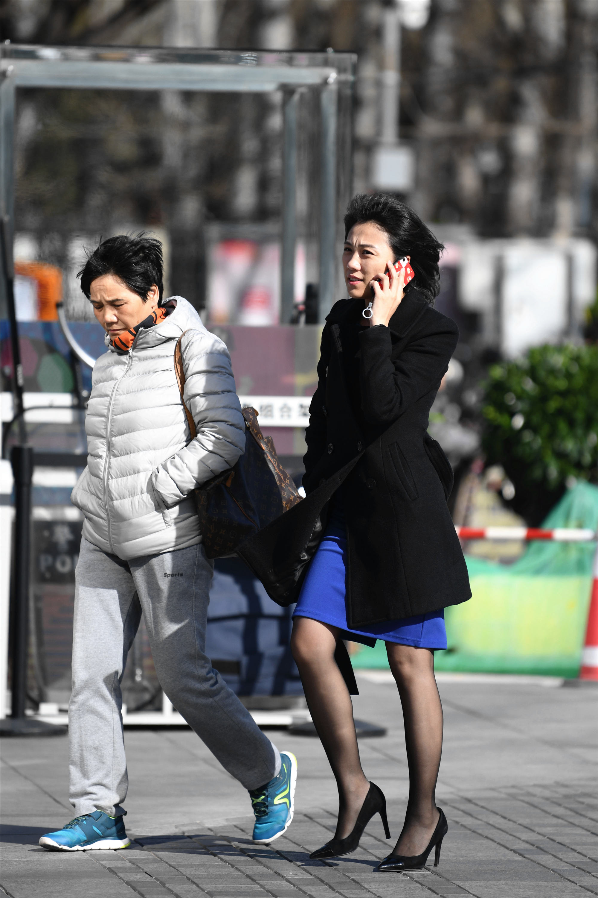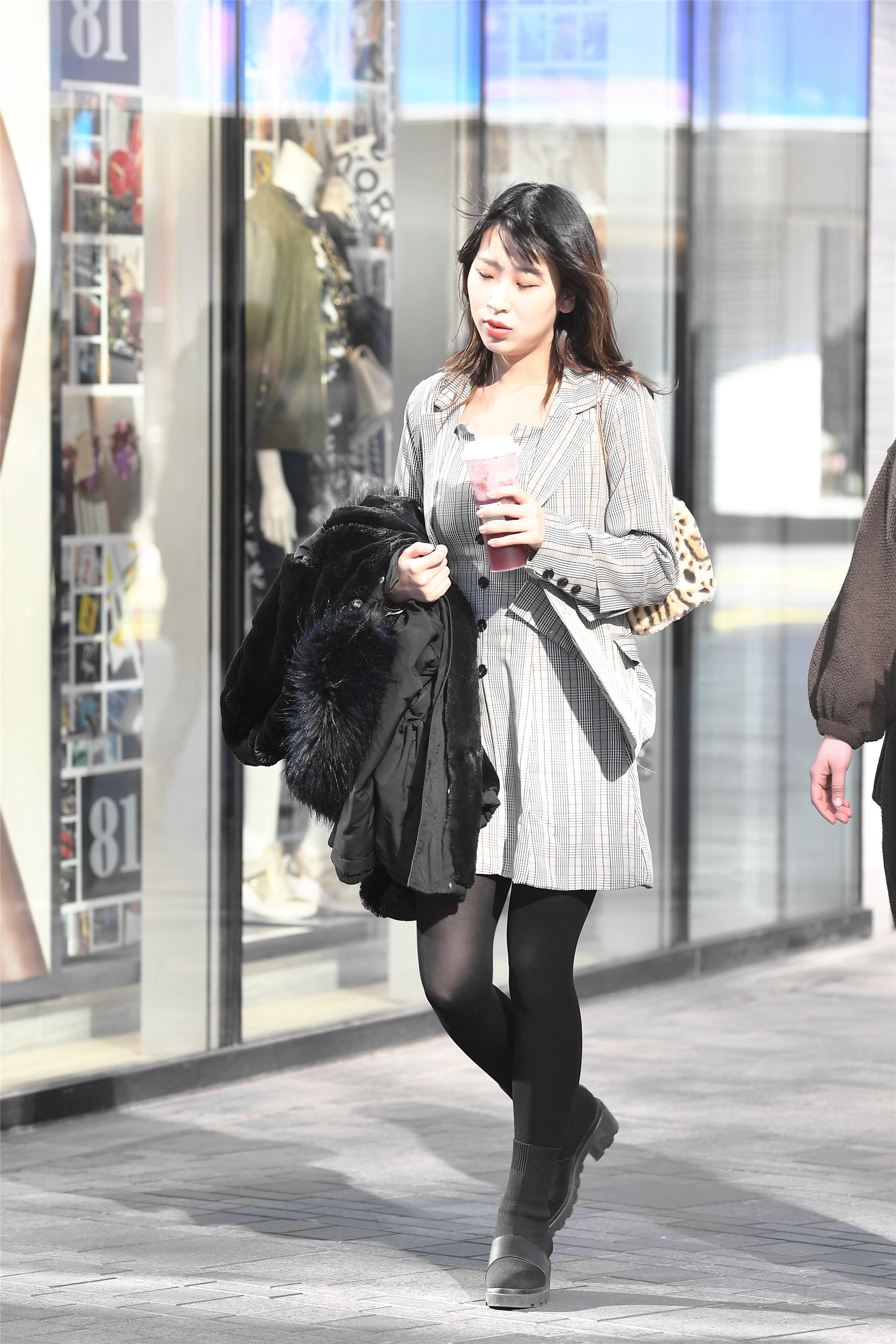 春天很多姑娘都很注意保暖,出来逛街,她们也会带着大衣,这样就不会冷,这位小姐姐穿着浅灰色格子套装,小西装和连衣裙组合在一起,非常个性,裙摆撒开,显得非常青春活力,黑色丝袜搭配一双黑色袜靴,袜靴上面还有一个宽皮带,有点拖鞋的感觉,非常个性,一件黑色大衣搭在臂弯里。