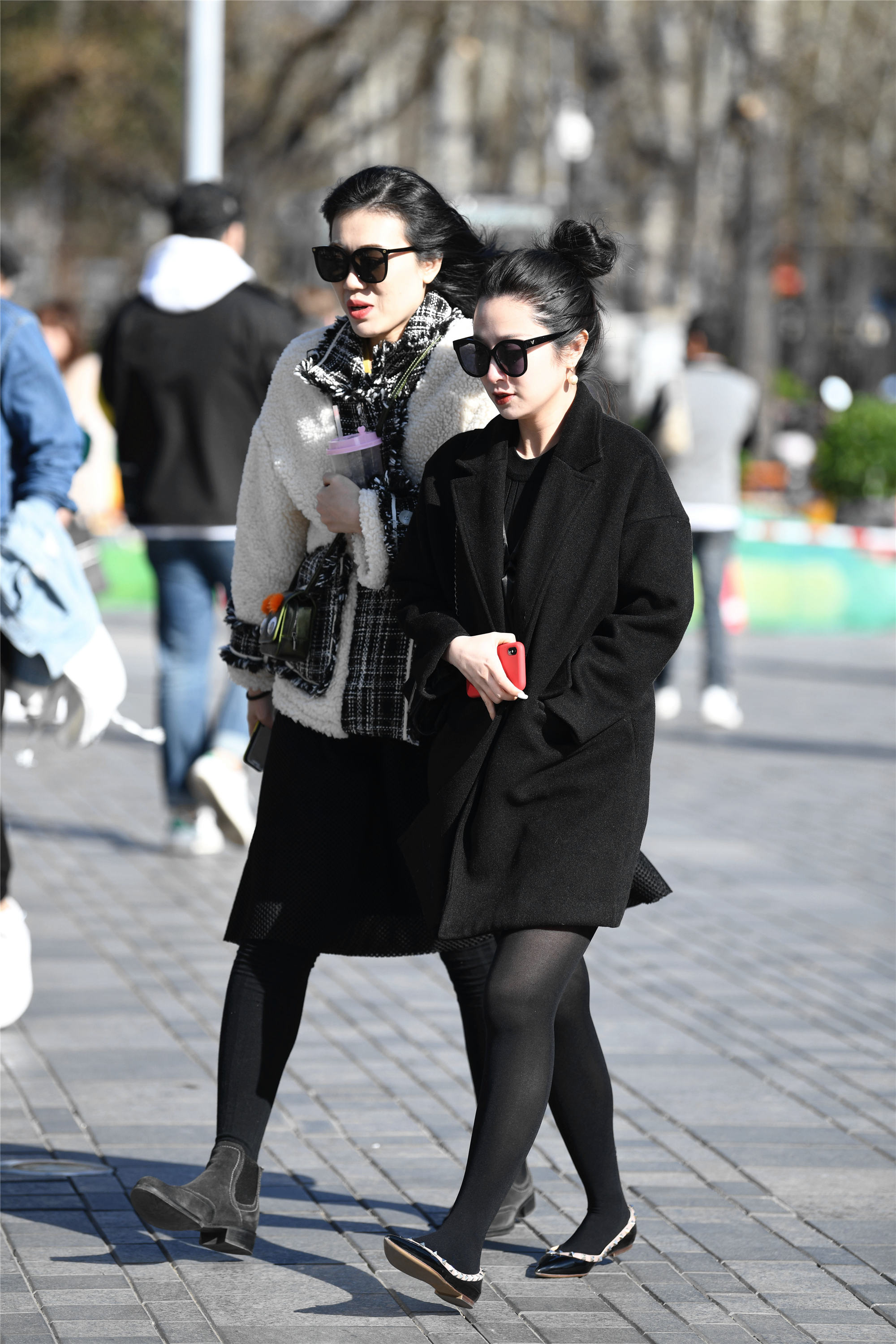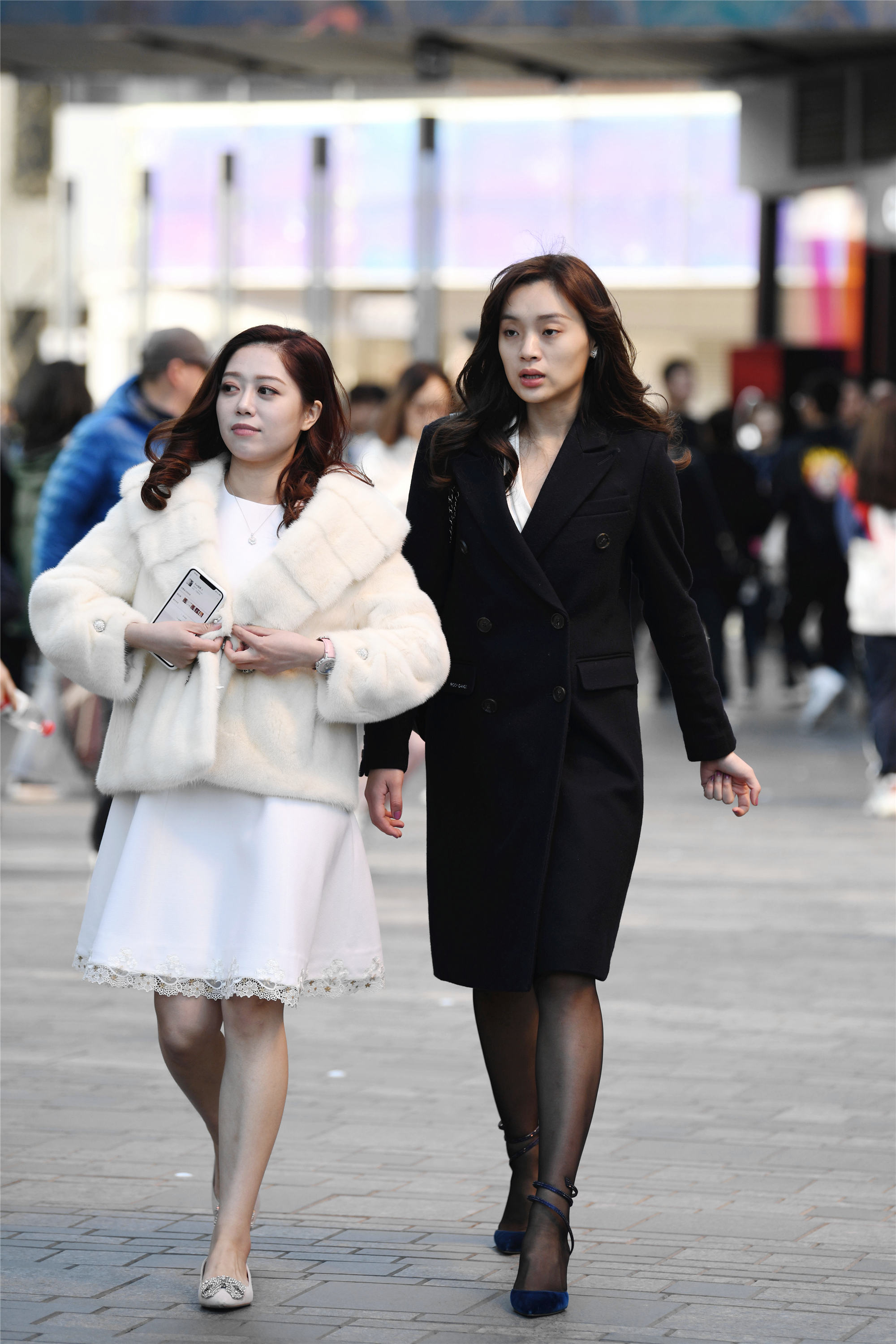 其实在春天里的搭配,有时候你会觉得有些矛盾,保暖的时装与清凉的搭配技巧结合,会搭配出很有层次得味道,这是一对闺蜜,看一下她们的搭配,一位选择黑色大衣,衣摆及膝,显得人很瘦,也很有身材,黑色丝袜的质感非常好,增加变化,一双蓝色丝绒尖头凉鞋,绕踝的鞋带,非常个性,这样还真不怕冷,她的闺蜜是浅色搭配,一件白色连衣裙,裙摆及膝,蕾丝边非常个性,一件米白色的厚实的短款皮草上衣,显得人很贵气,很时尚。