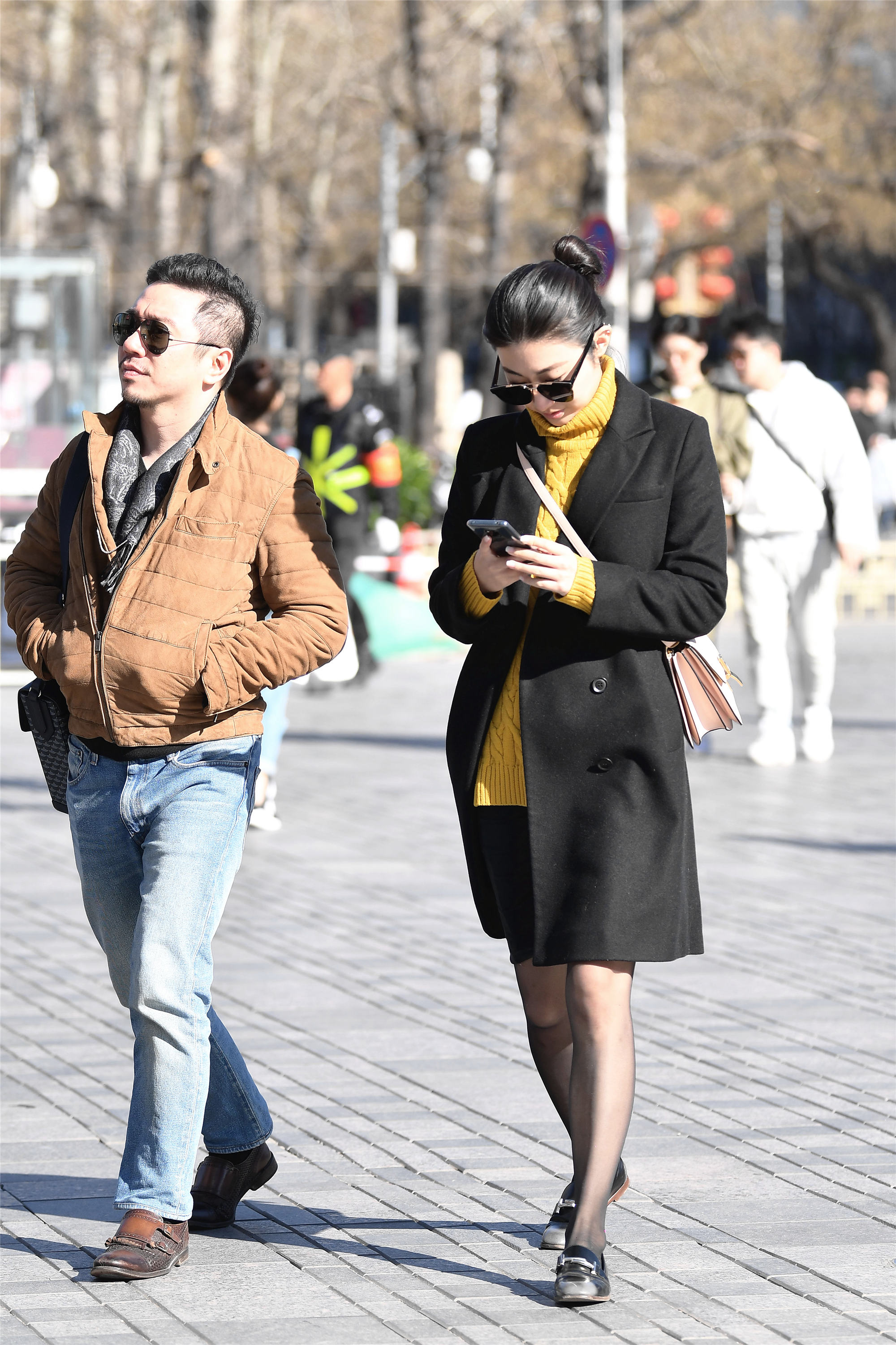 平底鞋之所以受到大家的喜爱,是因为穿搭方便,高跟鞋好看百搭,却走路很累,如果不是非常喜欢的人,一般都会选择低跟或者平底的鞋子,这位姑娘的黑色的大衣,是及膝的款式,黄色高领毛衣,粗针之纹理,显得非常个性,也增加色彩变化,黑色丝袜,非常薄的款式,一双黑色平底鞋,鞋尖渐变成浅灰色,有点做旧的味道,上面的银色金属装饰,增加个性。