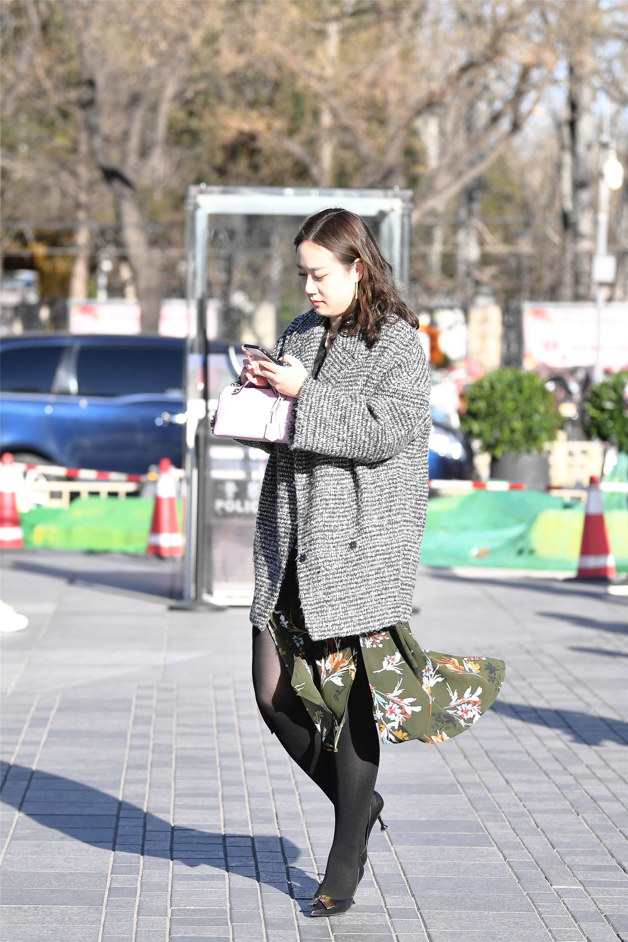 其实很多姑娘,在春天搭配的都很精致,这是她们生活中的搭配,简单实用,这位姐姐一件半身灰色大衣,穿着墨绿色的印花裙子,裙摆随风飘起,露出她的黑色丝袜,一双黑色尖头细跟单鞋,前边的金色装饰,增加鞋子的层次感,姑娘不是骨感的身材,却很会搭配,这一身搭配看着非常舒适,也很适合她。