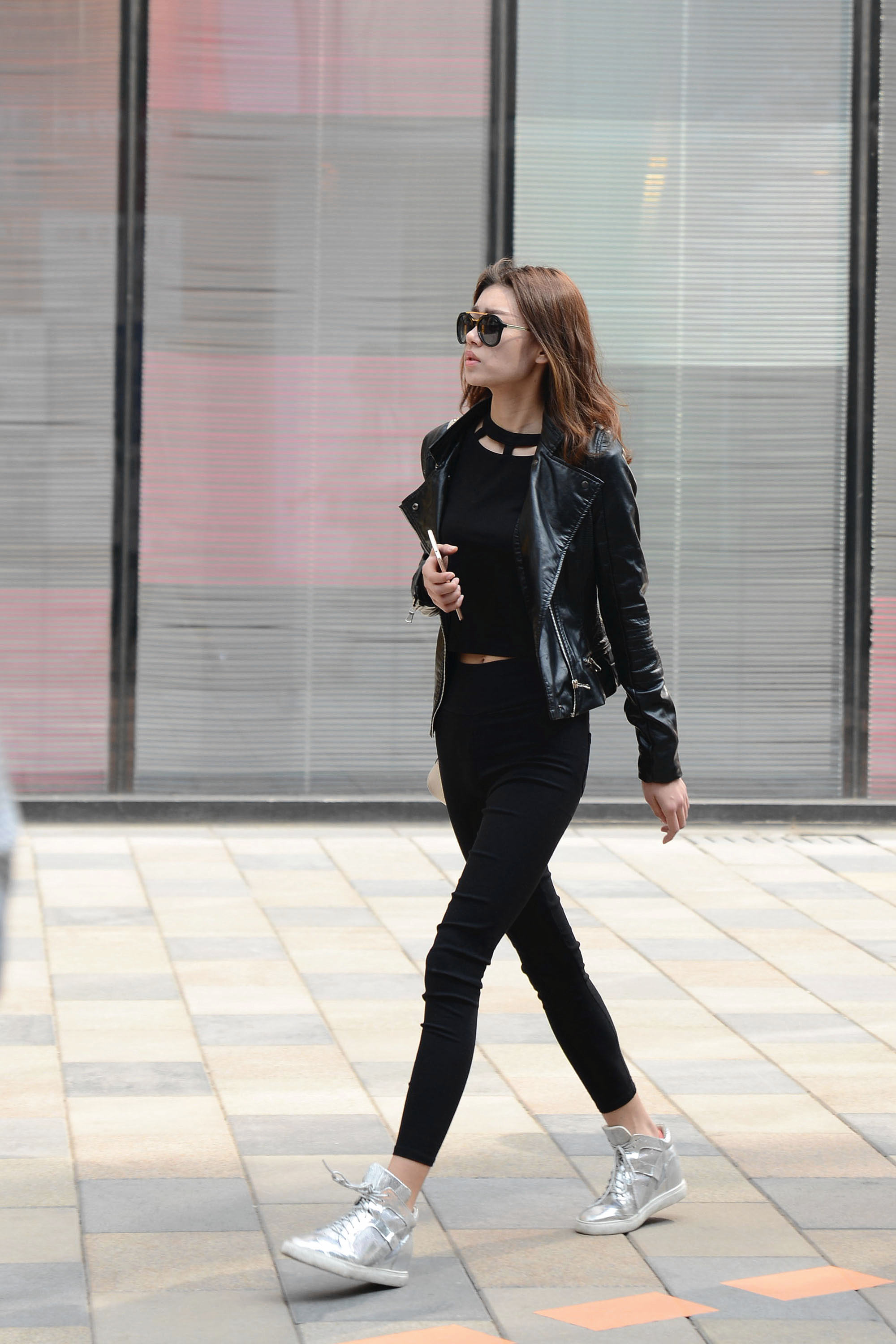 很多时尚的姑娘,都会选择一条时尚的修身裤,而且搭配出很显身材的效果,这位身材纤细高挑的姑娘,选择一条黑色修身裤,裤脚到脚踝位置,一双银色平底靴,让逛街更加轻松,黑色的短款小衫,搭配一件黑色而短款皮夹克,非常有质感,一身春季搭配,也是非常不错的。