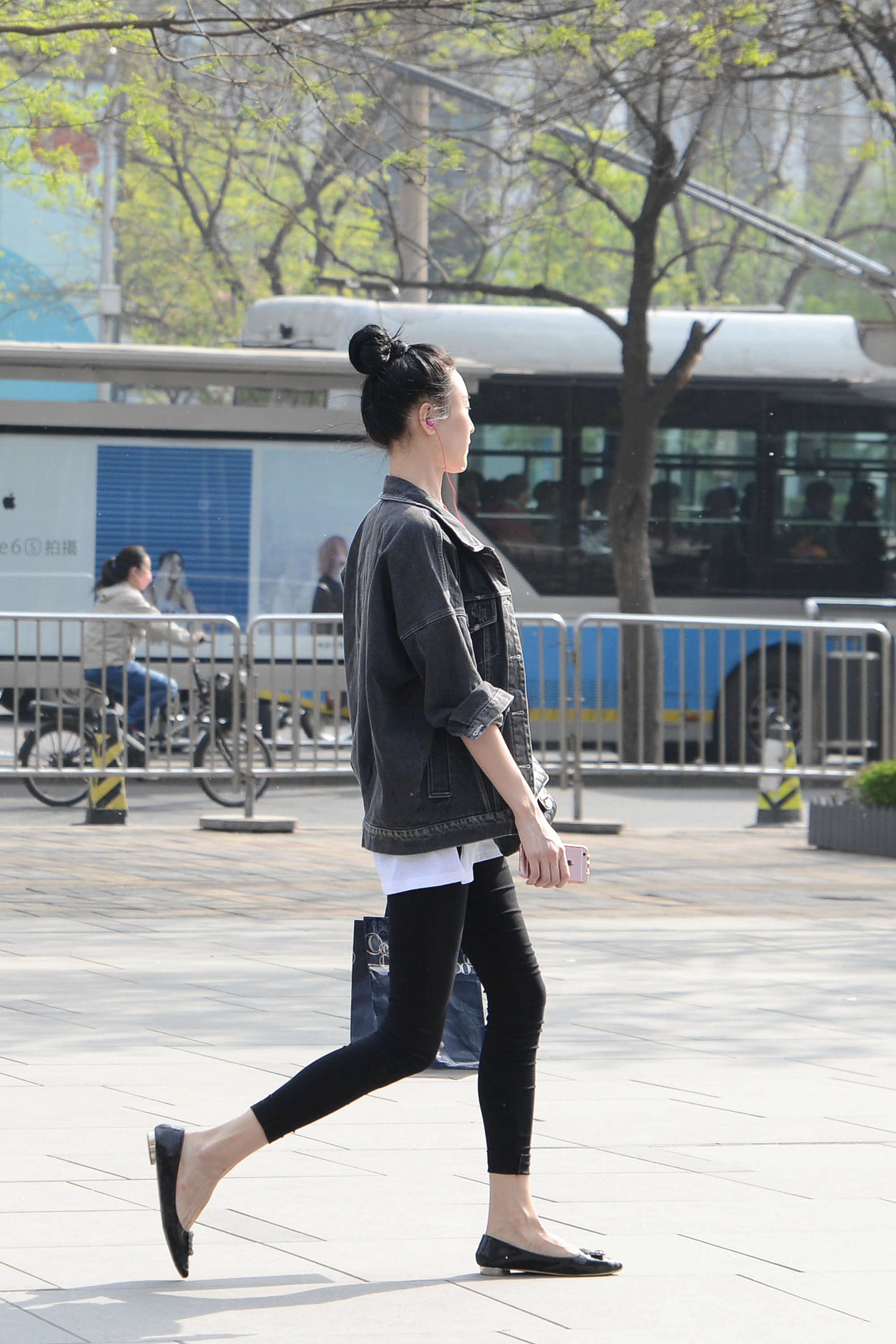 这位小姐姐选择而一款黑色修身裤,高挑纤细的身材,非常不错,一双尖头平底靴,这就是出来逛街才这样穿搭的,而且姑娘身材已经很高挑,所以才会选择一款平底靴,白色衬衣搭配一件牛仔夹克,非常简约的风格,姑娘的长发都盘起来,显得人很精致。