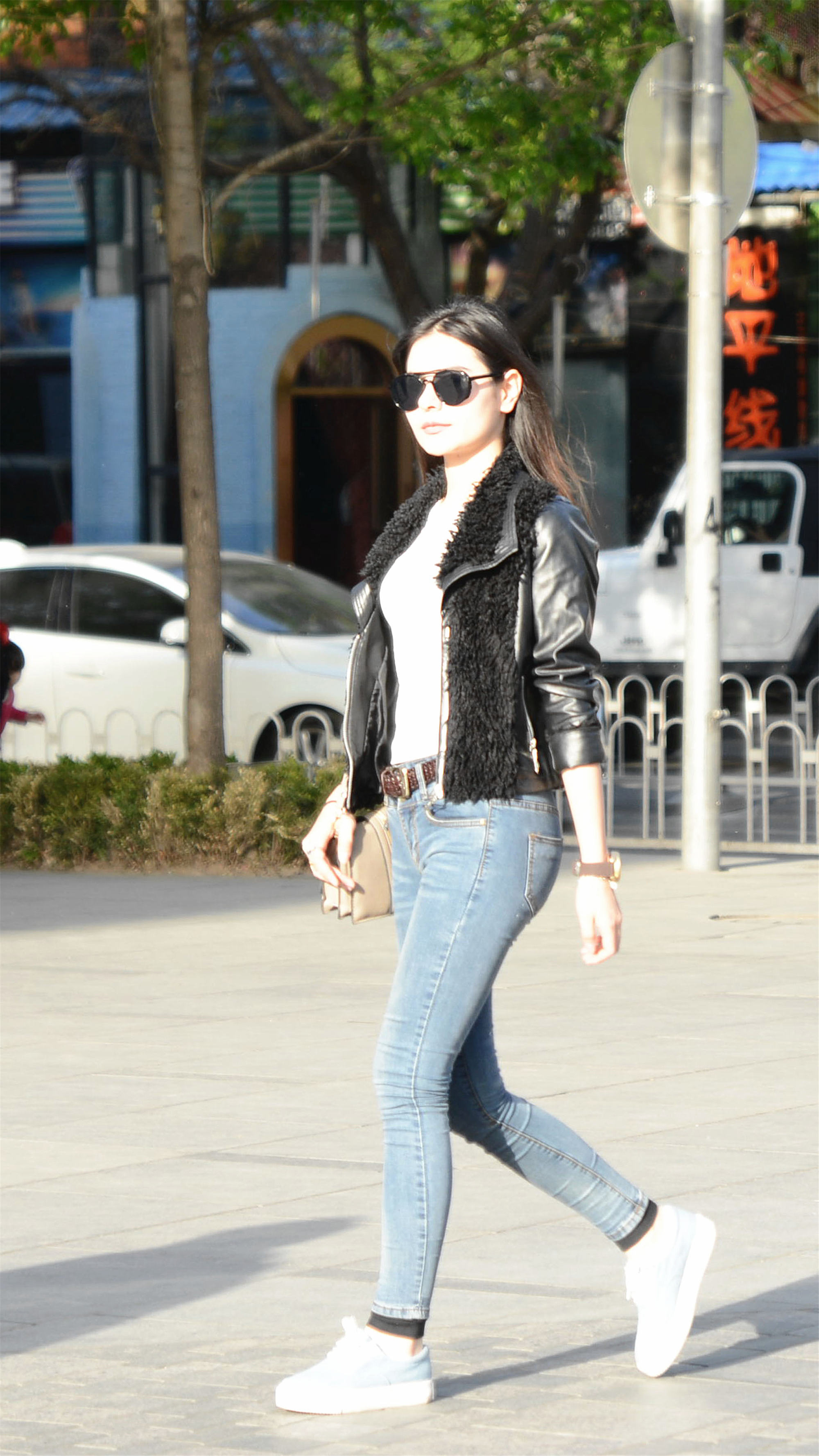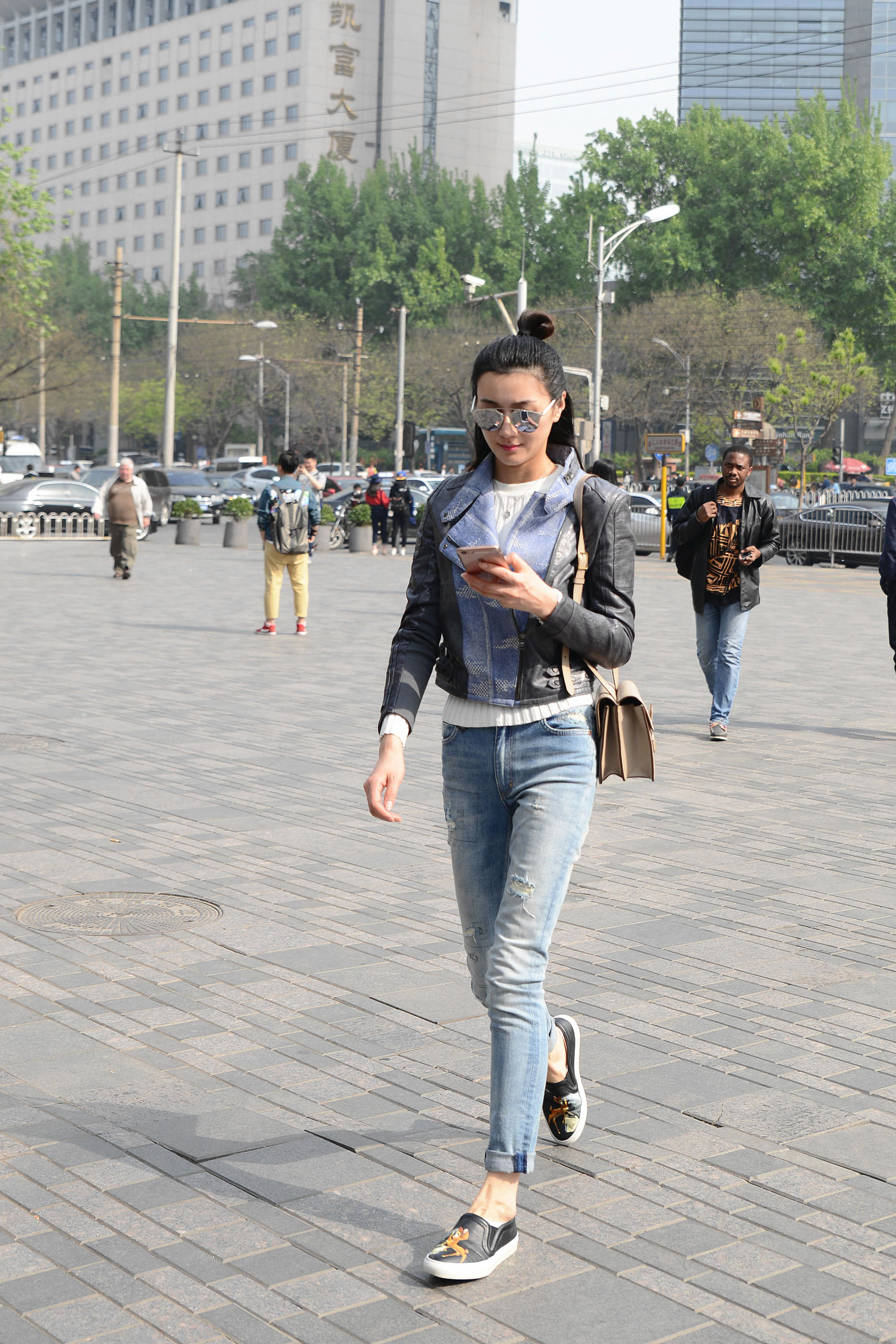 这位小姐姐选择一款修身的牛仔裤,而且身材高挑,裤脚挽起,显得人很骨感,选择一双平底的懒汉鞋,这是很少见的,但是不是传统的布鞋,黑色下面上印花非常漂亮,黑色皮夹克还是拼接的款式,一件白色针织衫,这样搭配上身显得非常短,更显身材比例。