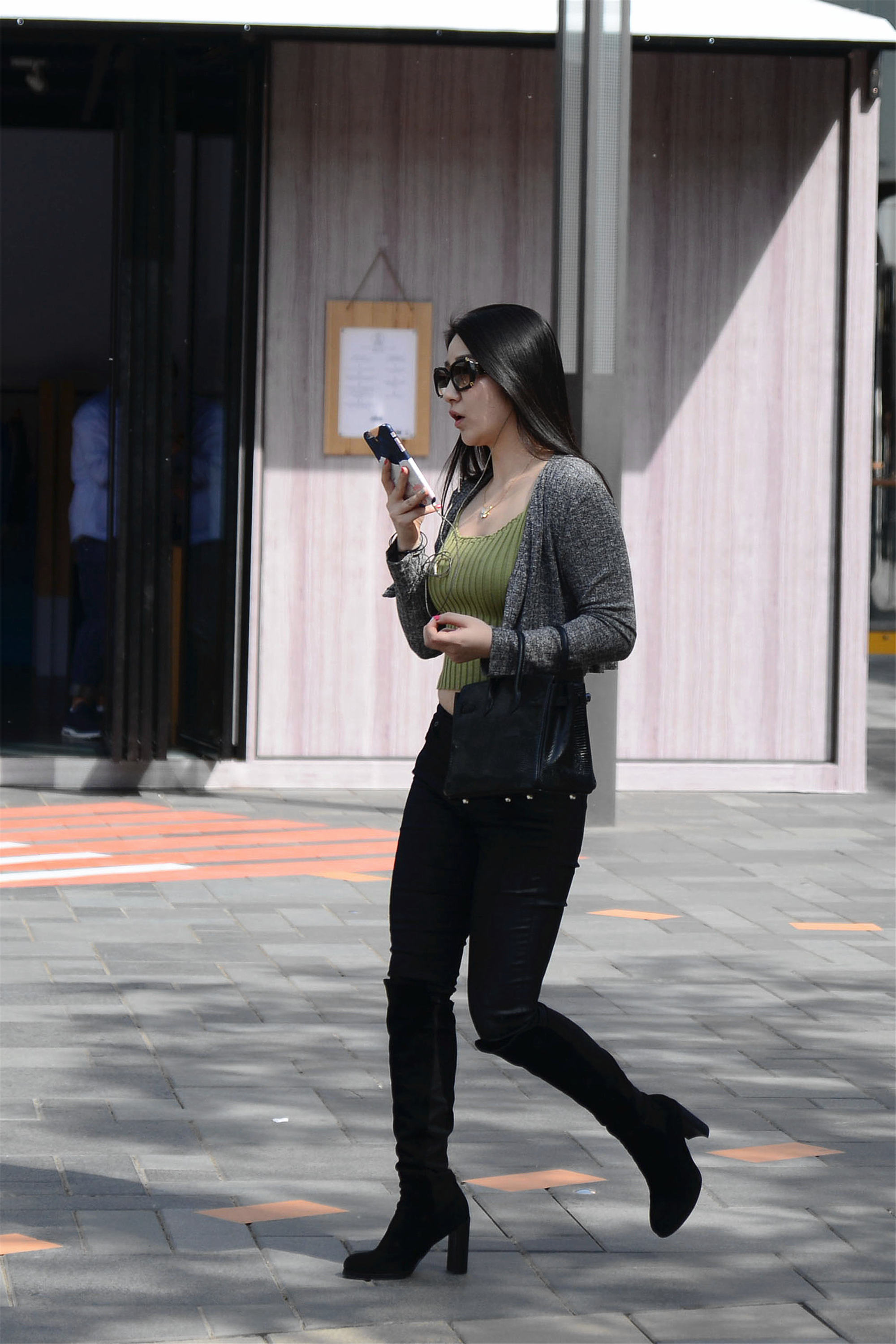 黑色修身裤搭配一双高跟长协,也是非常经典的搭配,在春天穿着出来正合适,保暖又时尚,绿色针织修身小衫,搭配一件浅灰色针织外套,更显得人个性,还露出一点腹部,这样的搭配是最自己非常自信。