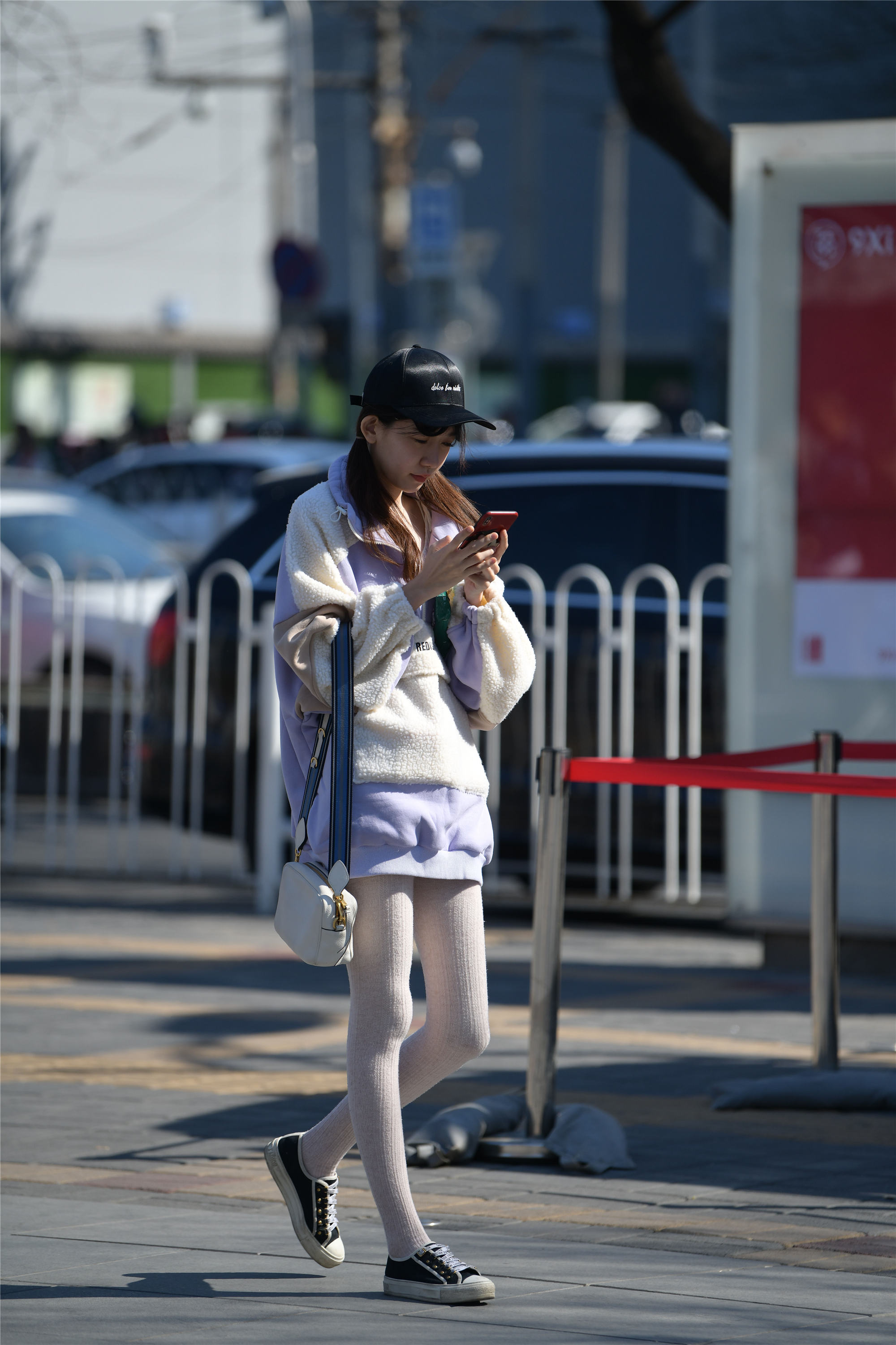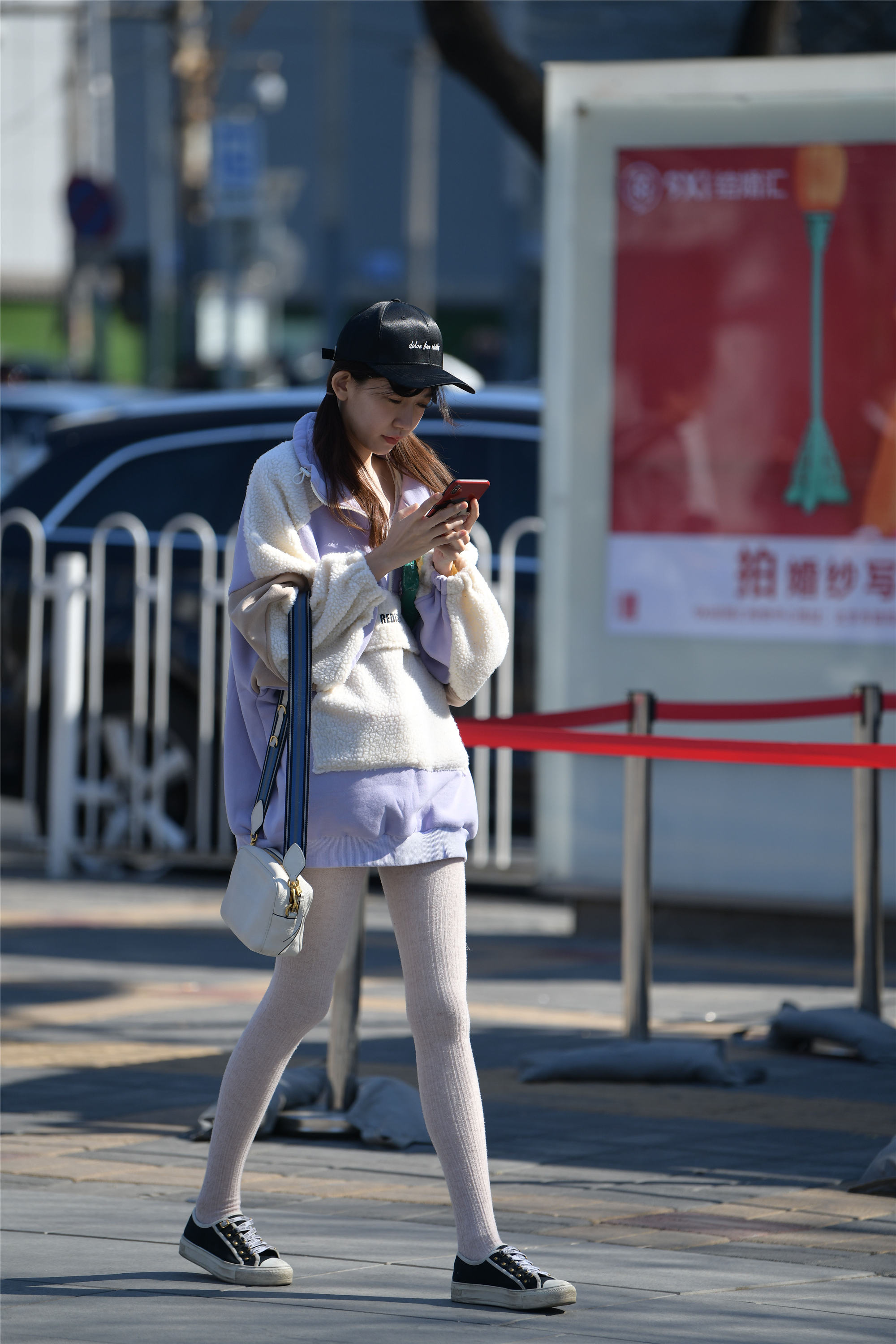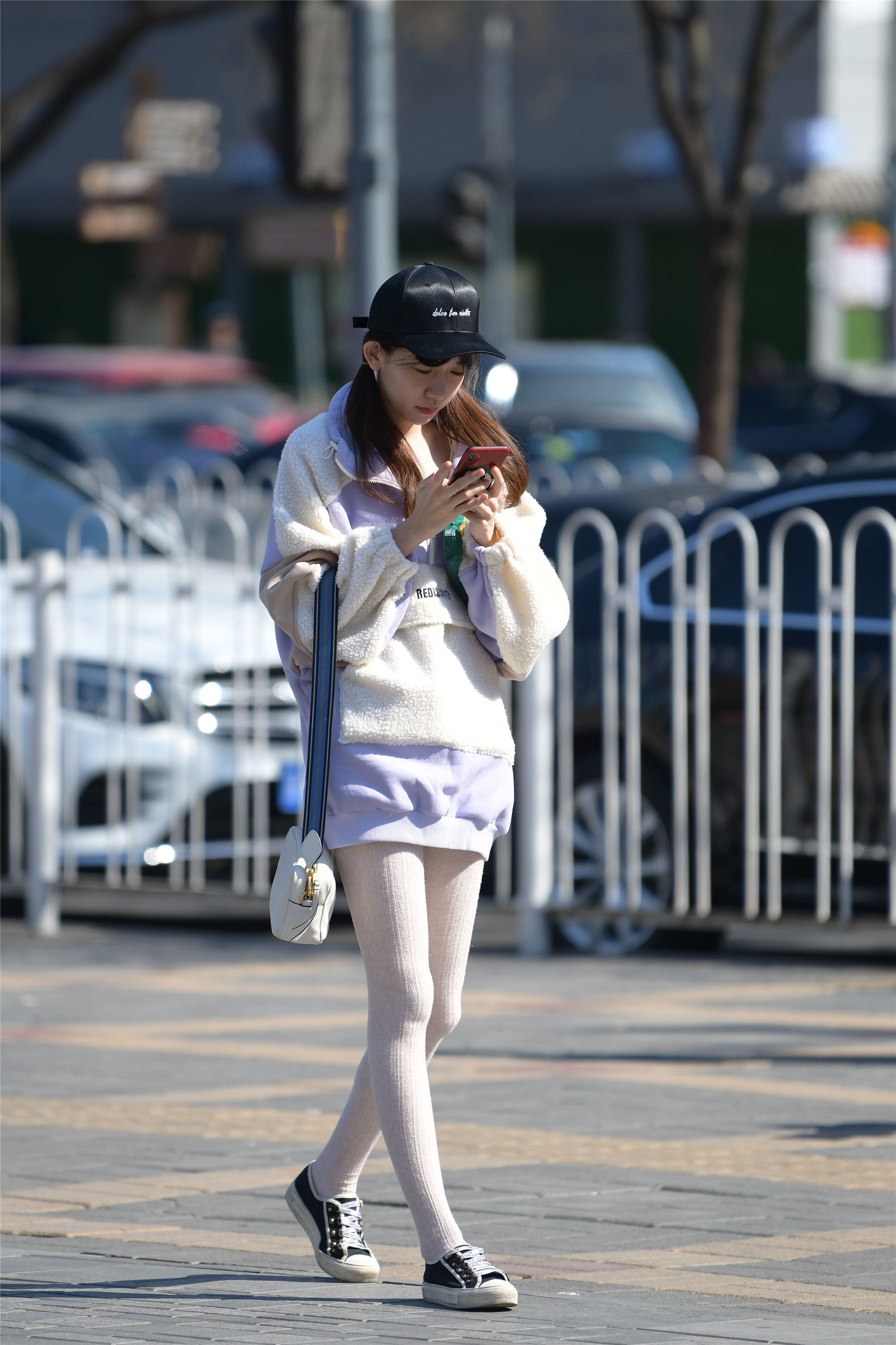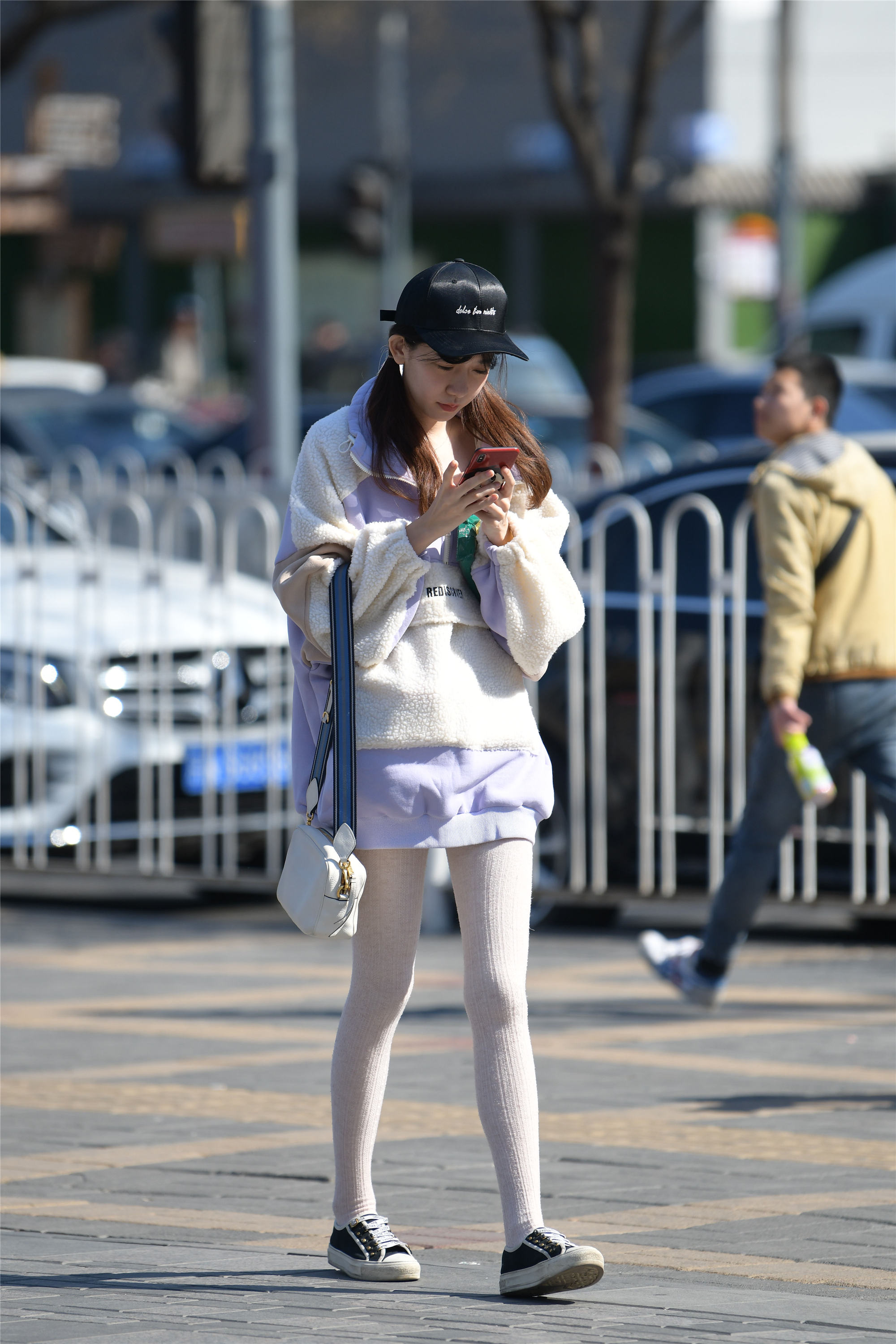 这位年轻的姑娘,穿着一双厚实的白色针织感的长袜,搭配一双平底的帆布鞋,黑色鞋面白色鞋底,感觉有着林家女孩的气质,而且腿型匀称修长,纤细笔直,一件很大的卫衣,蓝紫色和羊羔毛拼接在一起的款式,长款的设计,也显得很休闲,带着十足的小女生的感觉,戴着一顶丝绒的鸭舌帽,头发分成两个小辫,垂在两侧,显得人很精神,一身浅色系的穿搭,还有这小女生的感觉,高挑匀称的身材,搭配出自信的感觉。