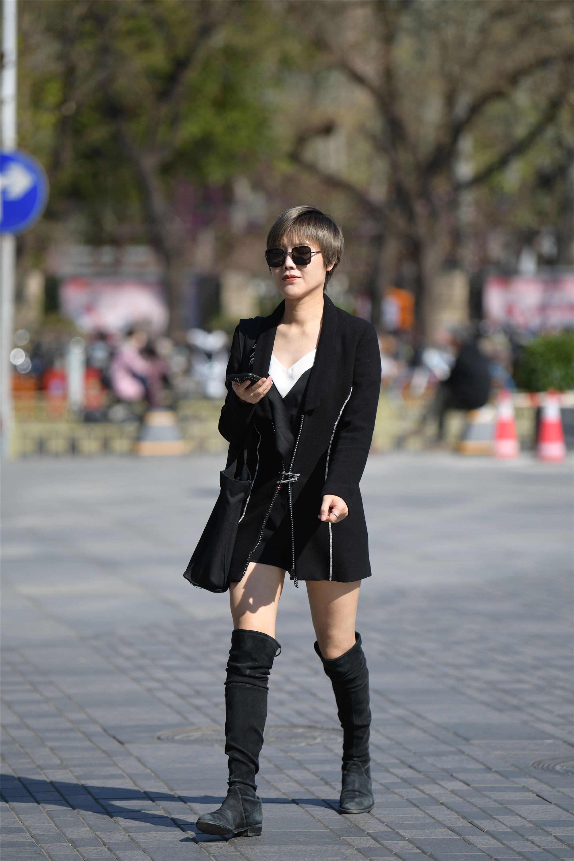 这位小姐姐穿着一款休闲的西服,前边的水钻镶边,非常时尚,增加个性,没有设计扣子,所以用别针把衣襟连在一起,这样显得更加有个性,黑色小衫,白色领口,这样增加层次感,让你会注意到V领,也是搭配中的浅色,黑色短裤,被衣服遮盖住,搭配一双黑色过膝玄学,春天穿着非常恰当,这样一身搭配显得分长简约,还有这个性,和平时见到的搭配,不要一样,有着自己的想法,搭配出自己的个性来,姑娘的短发,也显得非常精致,柔顺靓丽,而且也显得人很干练。