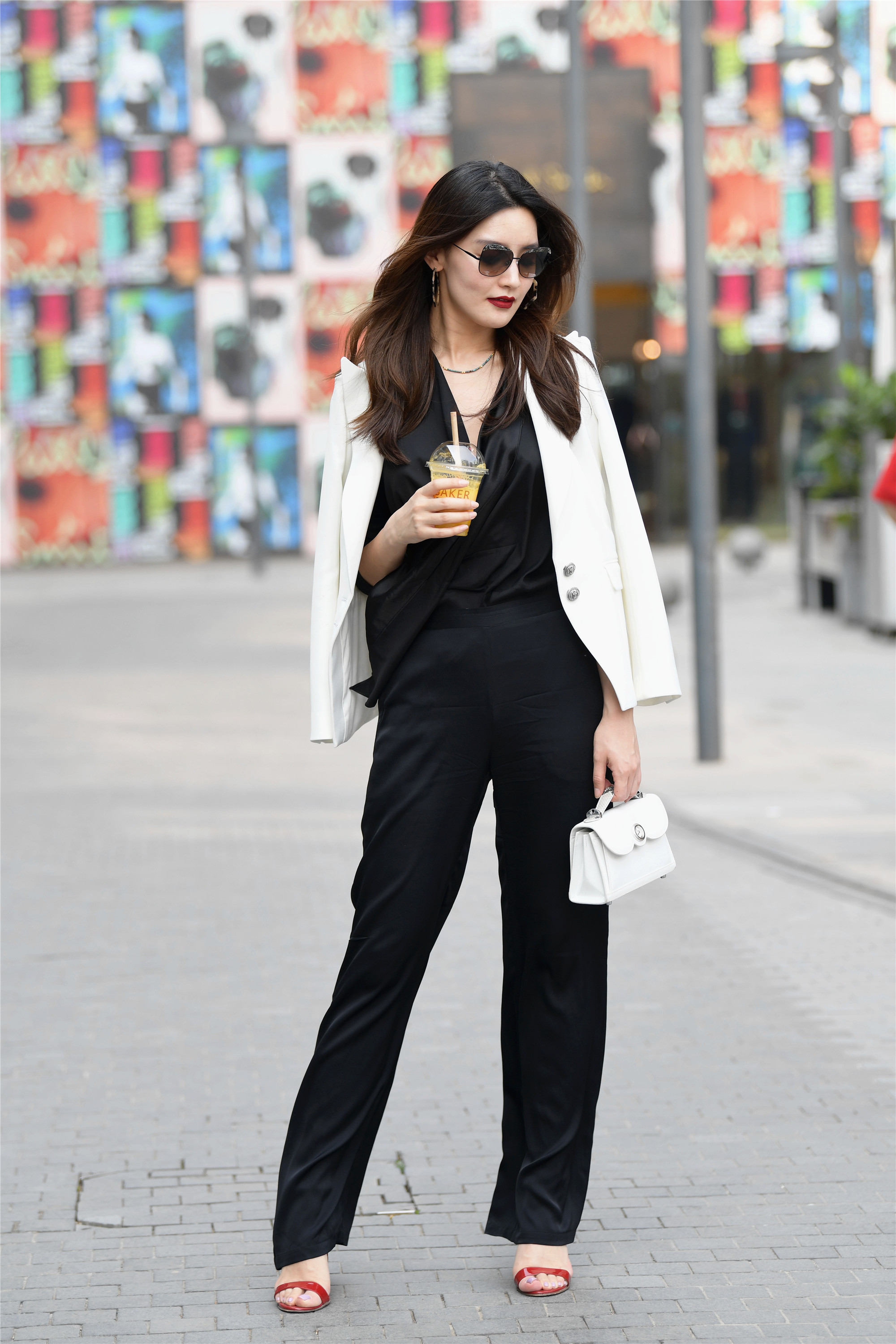 春天,特别是温度上升之后,更多的时尚姑娘出来,她们选择搭配长裤,长裤怎么穿出女人的精致呢?高跟鞋,必不可少,现在就来看一下,时尚街区的姑娘怎么搭配长裤的吧,这位姑娘选择一款黑色高腰长裤,和黑色V领小衫相结合,显得身材高挑,外面披着一件白色小西装,有着黑白色的对比,脚下一双红色一字带细跟凉鞋,让身材看起来更显高挑,搭配也变得简约时尚,棱角分明的五官,有着一点欧美范。