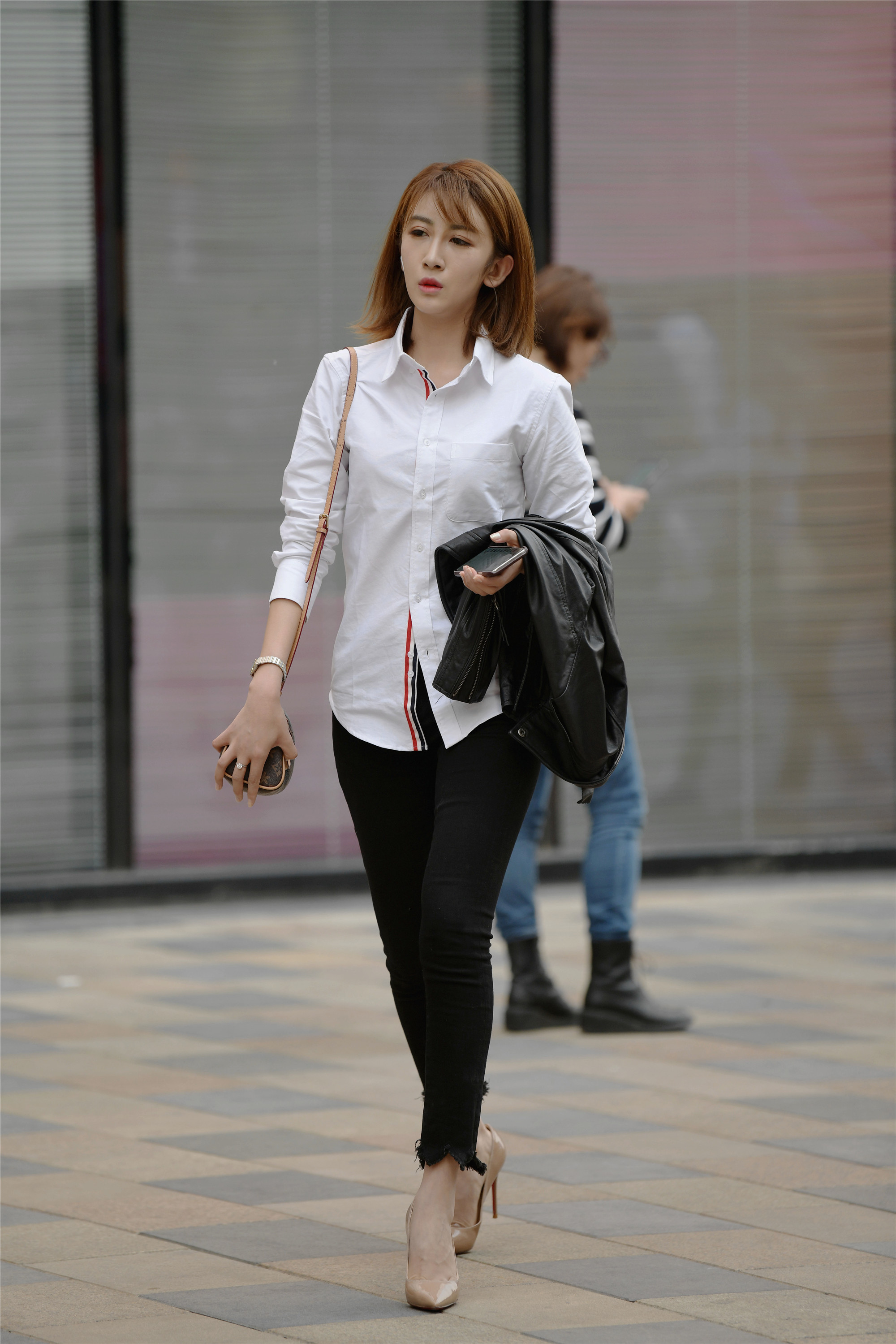 春天选择什么款式的裤装,时尚姑娘会有着自己的想法,这位姑娘选择一款修身的黑色牛仔裤,裤腿是毛边的,一双裸色尖头细高跟单鞋,露出脚背和一点脚趾缝的浅口设计,时尚漂亮,搭配白衬衫,臂弯里搭一件黑色皮夹克,其实每一位逛街的姑娘,她们也会注意保暖,春天的温差比较大,多备一件衣服,还是很管用的。