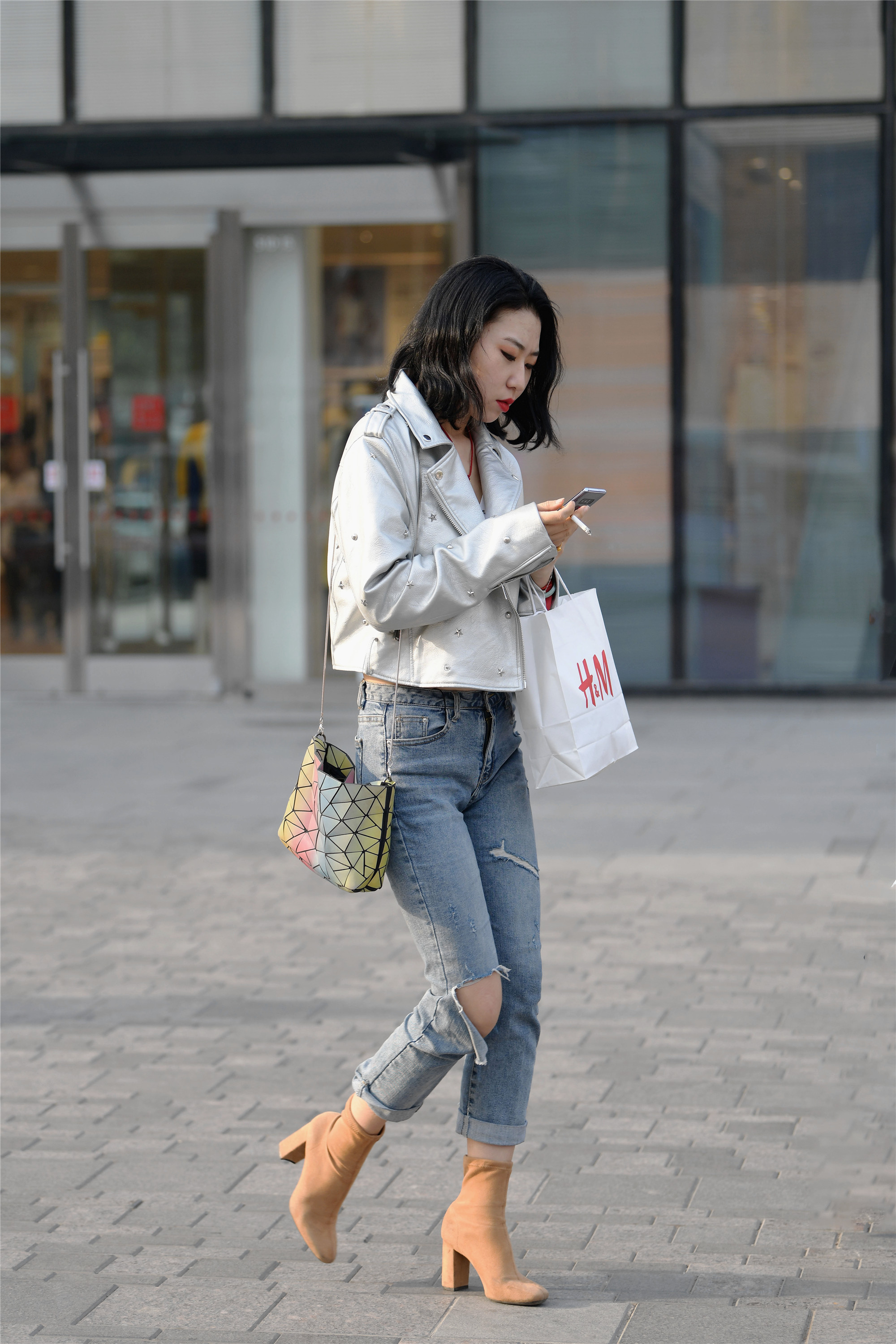 这位小姐姐搭配很简约,修身的破洞牛仔裤,一侧膝盖位置,似乎是被刮坏的,三角的口子,裤脚挽起,一双驼色的高跟短靴,暖色调子,在春天穿着,更有保暖时尚的效果,银灰色的短款皮夹克,宽松款式显得人更瘦,三角块拼接彩色单肩包,让搭配增加色彩感觉。