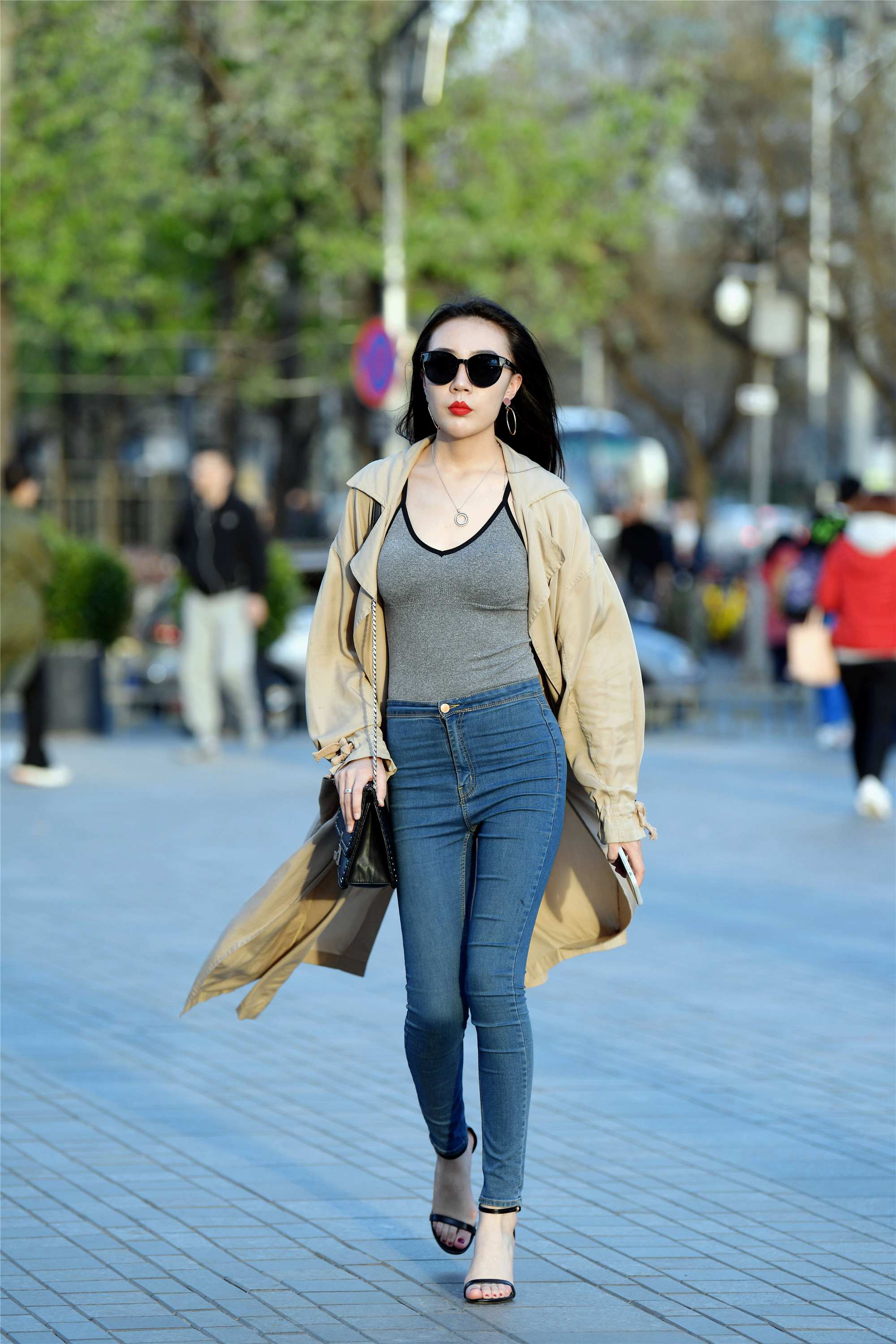 修身牛仔裤,更有百搭的效果,穿着单鞋还是凉鞋,都可以搭配出不错的效果来,这位姑娘穿着蓝色高腰修身牛仔裤,裤脚刚好到脚踝位置,选择一双一字带高跟凉鞋,更好的衬托她的身材,更显高挑纤细,修身的灰色吊带,搭配一件卡其色的风衣,衣摆被风吹在后面,显得非常有风度,春天的长裤,搭配高跟鞋,就是这样时尚,让人看着更显精致。