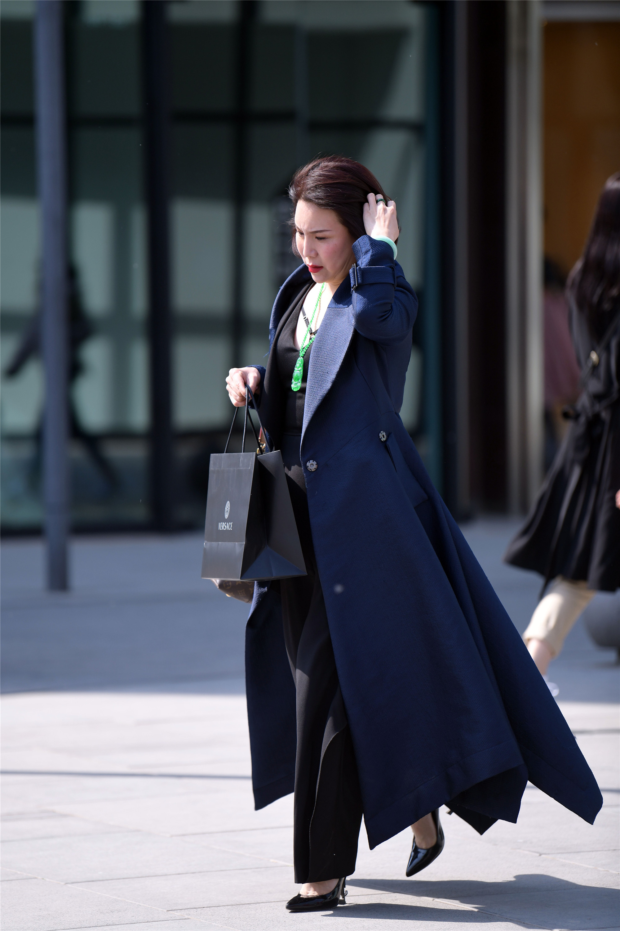 对于一位时尚的姑娘来说,穿高跟鞋是必须具备的基本功,穿着高跟鞋,走出优雅的步伐,才会打配和驾驭各种服装,不仅增加高度,还能体现你的气质,看一下这位姐姐,一件宽松的蓝色呢子风衣,收腰设计非常漂亮,下摆飘起,有着走路带风的感觉,黑色的内搭和西裤,搭配出非常干净利落的味道,脚下一双尖头圣罗兰的经典高跟单鞋,非常显气质的效果,让她看起来带着一点雍容华贵。
