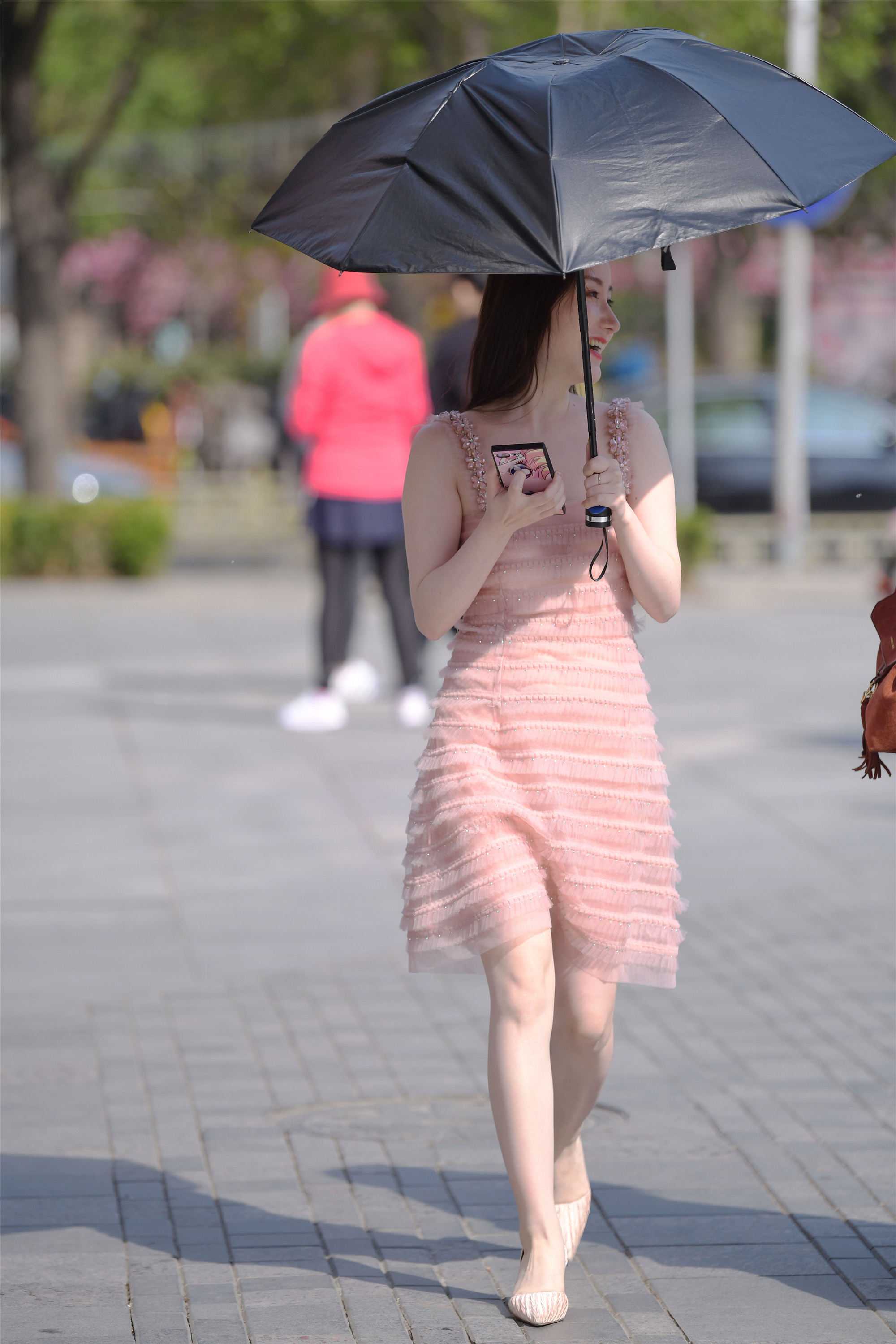 在中午出门,还是有怕晒的姑娘,她们希望自己的皮肤一直是很白的,所以会带着阳伞出门,这位小姐姐穿着一件吊带的塔装连衣裙,浅粉色显得人很年轻,层叠的裙子,看起来更有层次感,以上浅粉色的尖头细跟鞋,更显得时尚优雅,春天这样一身搭配,还是需要勇气的,如果就在中午这一段时间逛街,这一身搭配还是很合适的。