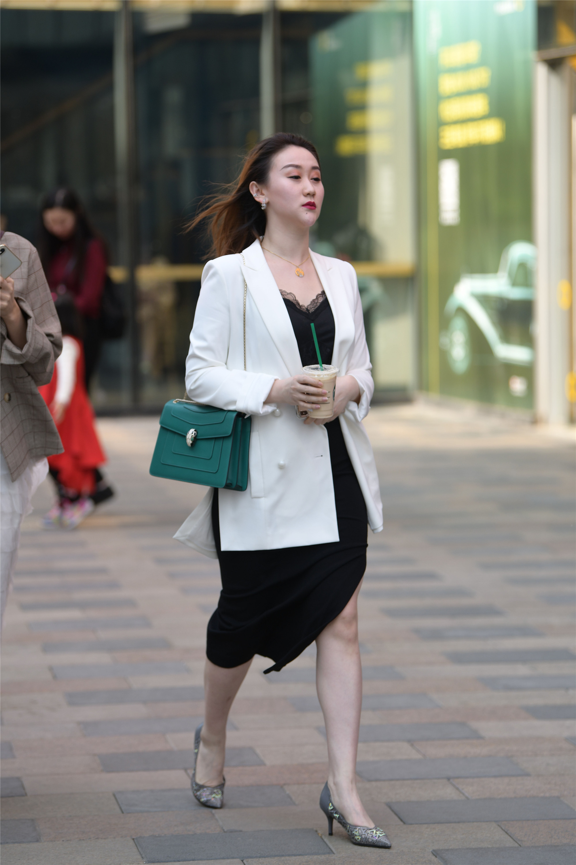 每一位时尚的姑娘,选择的高跟鞋是不同的,高度也会不一样,她们会挑选一双适合自己的,而不是鞋跟越高越好看,这位姐姐巧妙的运用黑白色的搭配,一件黑色连衣裙,侧面的开叉,是为了走路更加舒适,外面穿着一件西服,非常简约的款式,黑色与白色对比一下,很时尚的感觉,一双浅灰色水钻尖头高跟鞋,鞋跟没有选择很高,逛街就会更加的舒适。