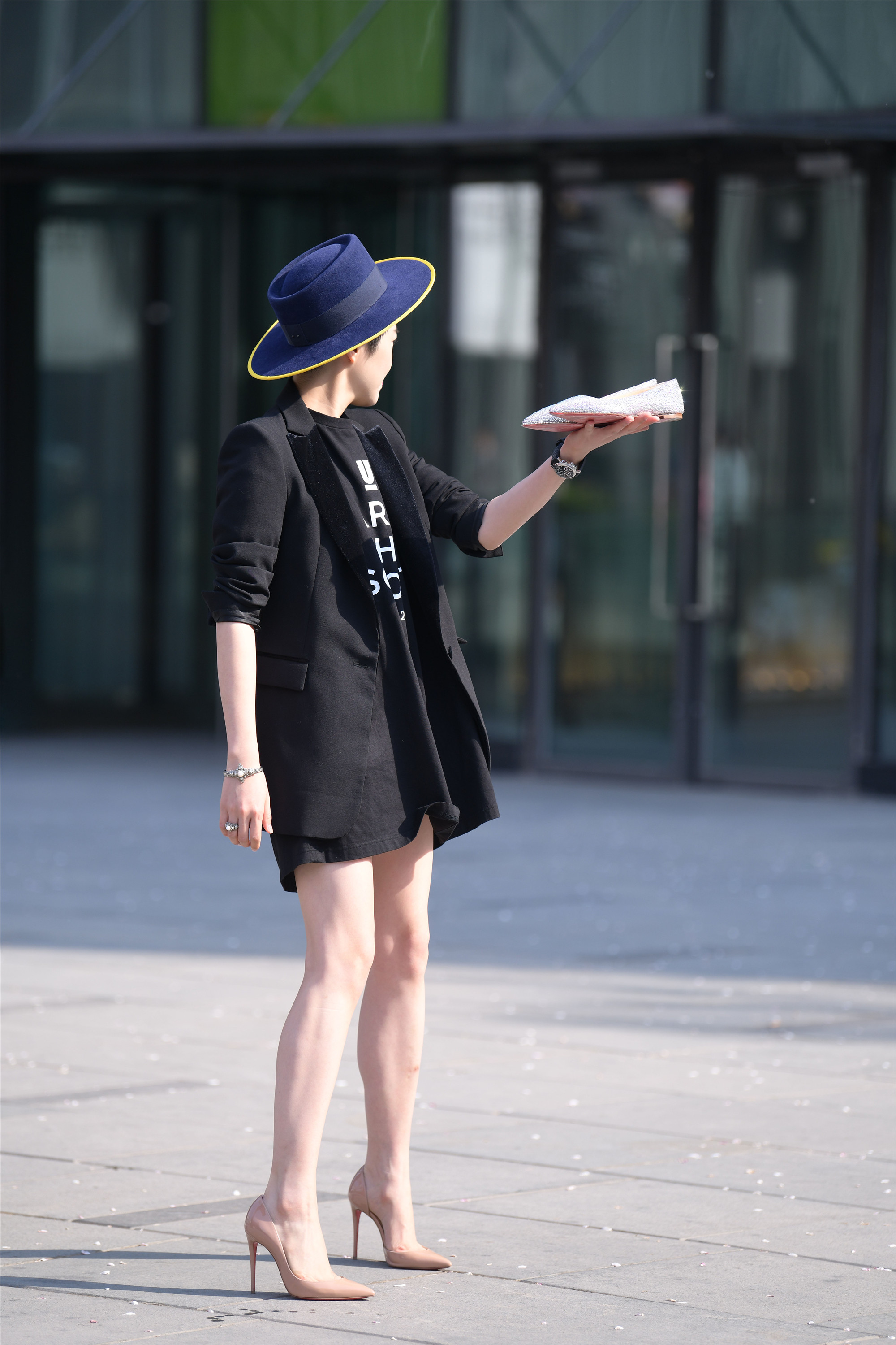 一双时尚的高跟单鞋,也要有漂亮的衣服来搭配一下,鞋子不仅仅是要走路方便,还要展示一种女性的美,要不然为什么那么多姑娘会选择穿着高跟鞋呢?这位姐姐选择一款很经典的裸色尖头细跟单鞋,鞋子的高度和设计,是经典的CL款式,很多时尚女士都是很喜欢这款鞋子,黑色小西装搭配一件黑色T恤,简单着装,时尚漂亮,头上的一顶蓝色呢子帽,帽型规整时尚,帽檐一圈黄色镶边,增加色彩变化。