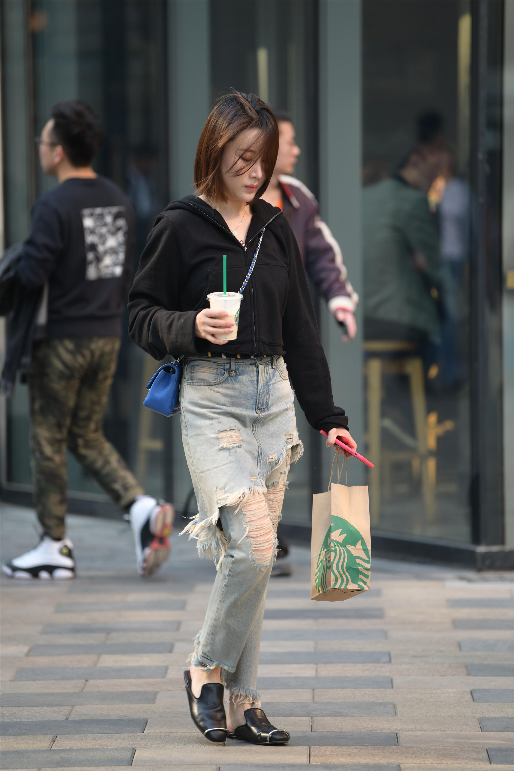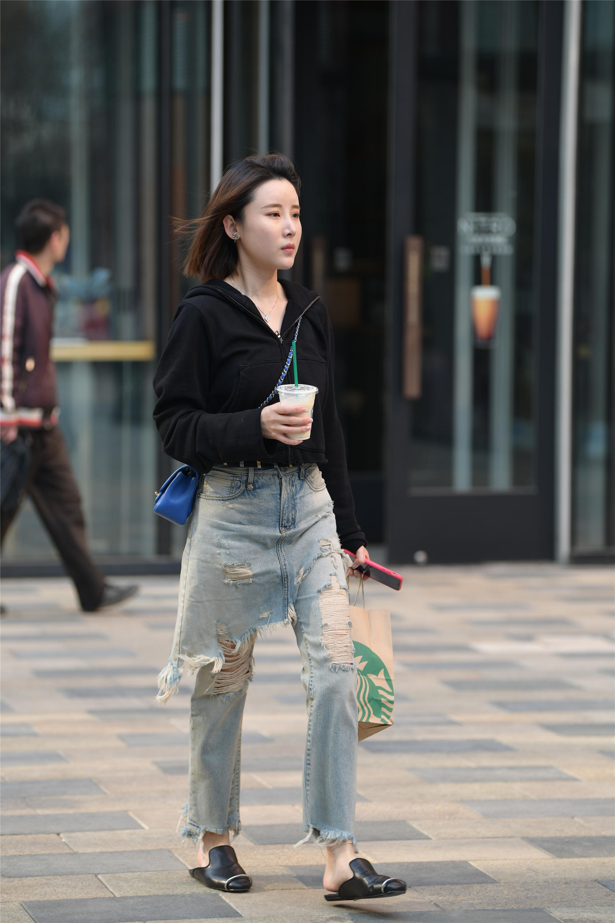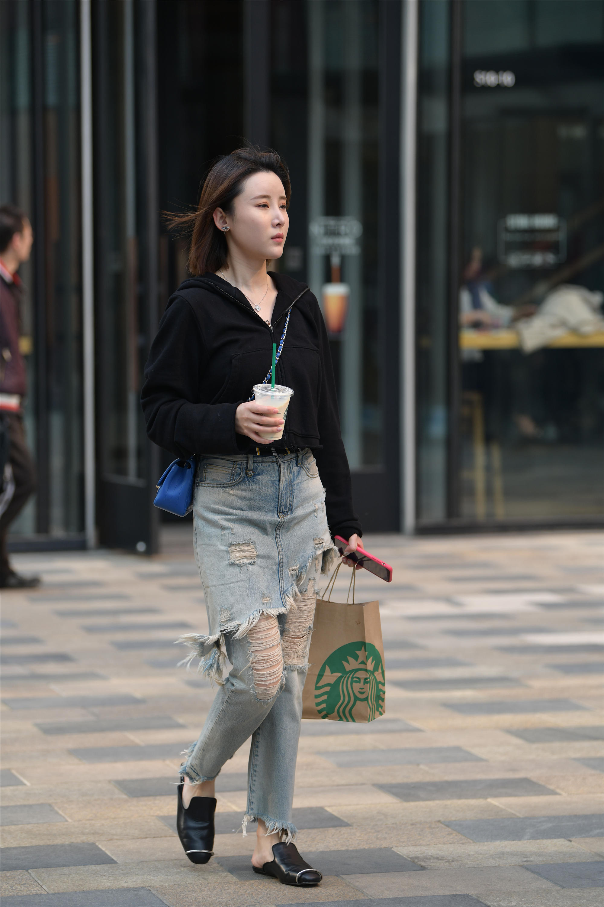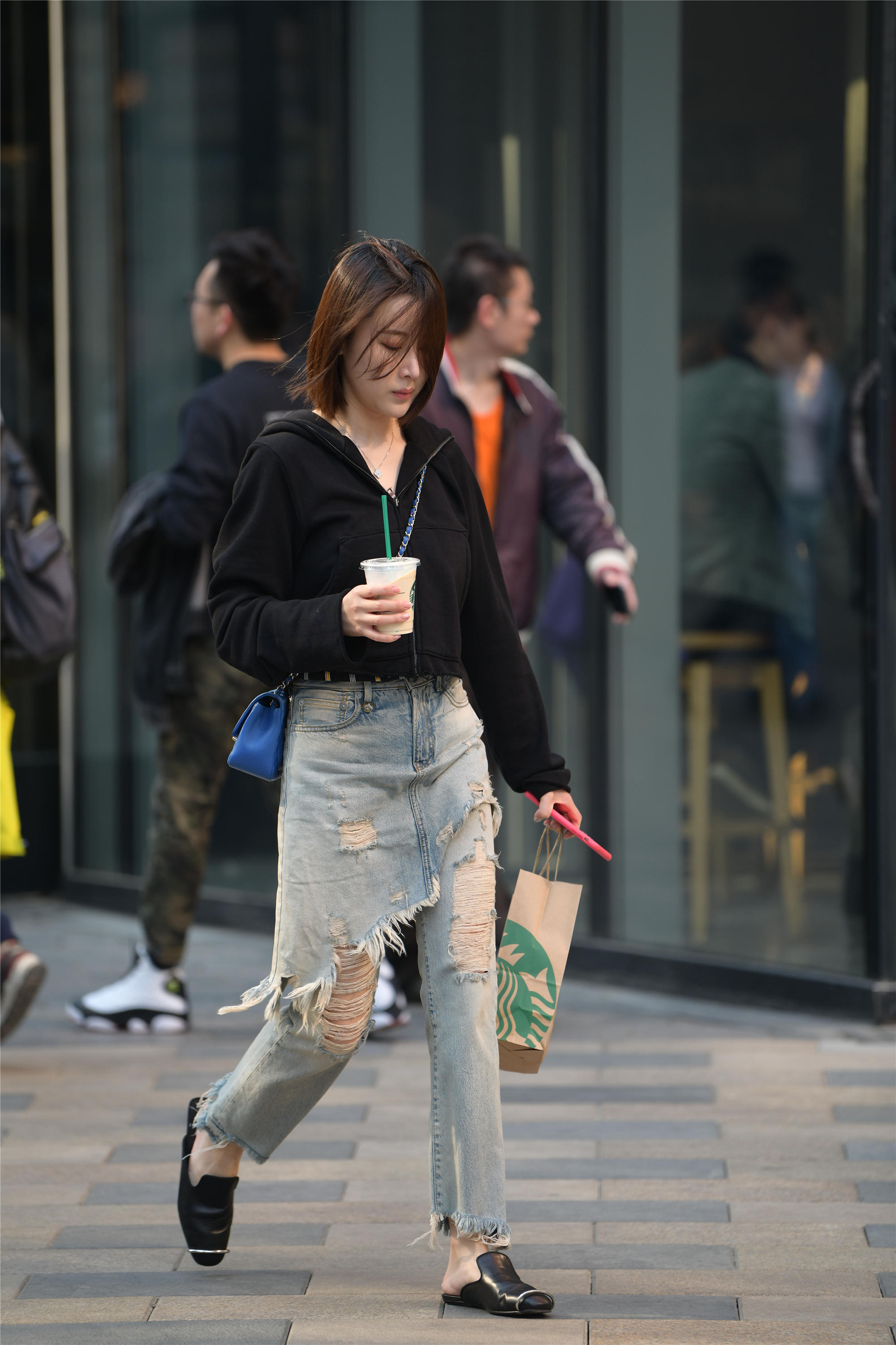 这位小姐姐,她选择一款水洗蓝的破洞牛仔,而破洞牛仔裤是非常流行的,而且各种各样的破洞牛仔裤都有,而这位姑娘选择的牛仔搭配却是破洞牛仔裤搭配破洞牛仔裙,是不是很有意思?这样搭配会不会很流行起来?如果是裤子和裙子搭配在一起,会觉得有些不协调,但是牛仔面料组合在一起,却显得很有个性,她穿着一件黑色短款小卫衣,搭配出很显身材比例的效果,蓝色的单间小包,斜背在肩上,增加了色彩,穿着一双黑色穆勒鞋,鞋尖前面是一个金属圈,增加个性,有着拖鞋的感觉,也带着中性的感觉。