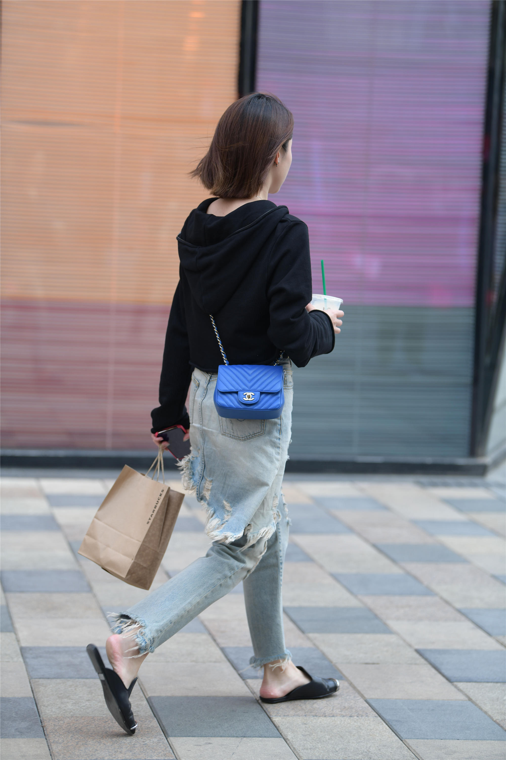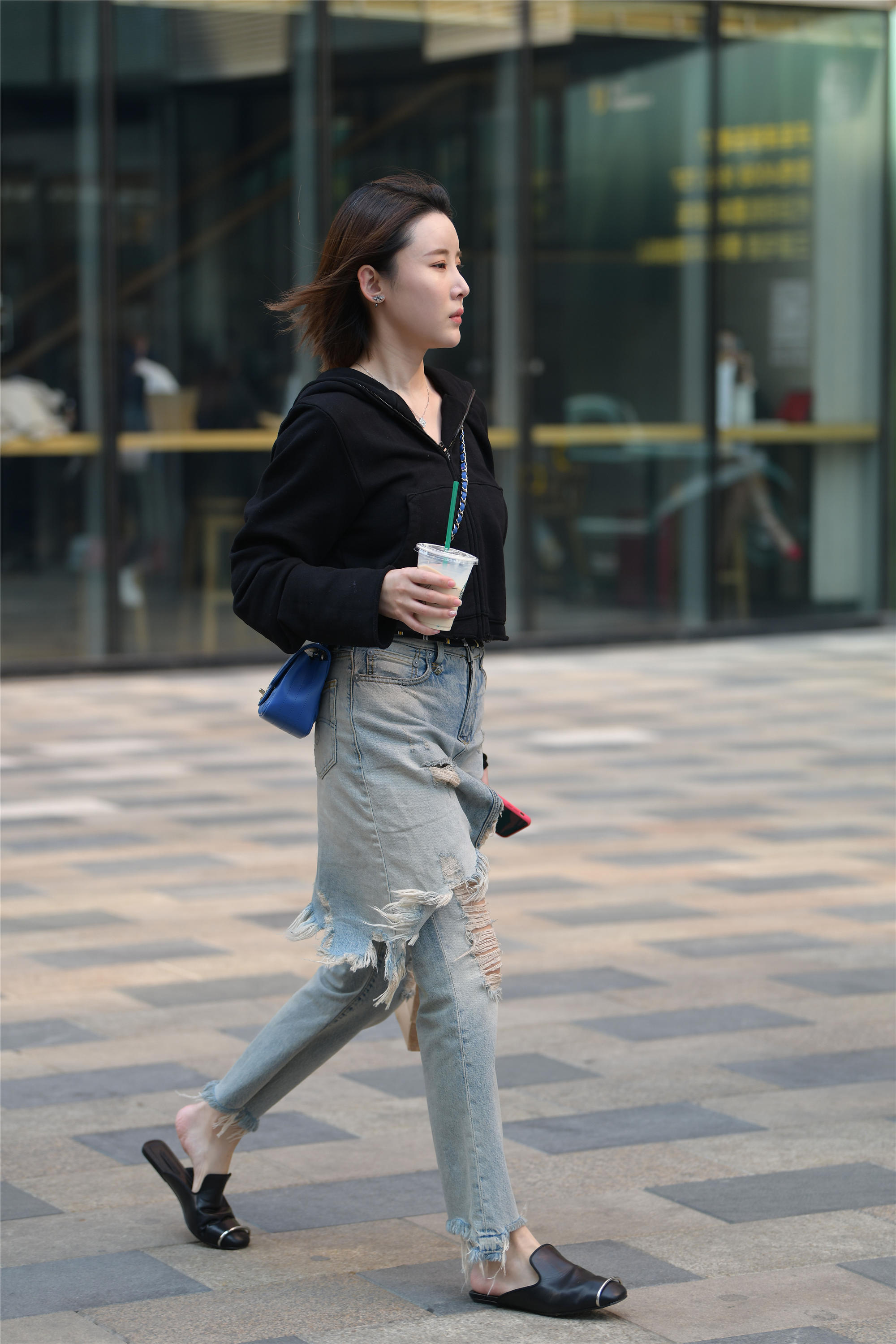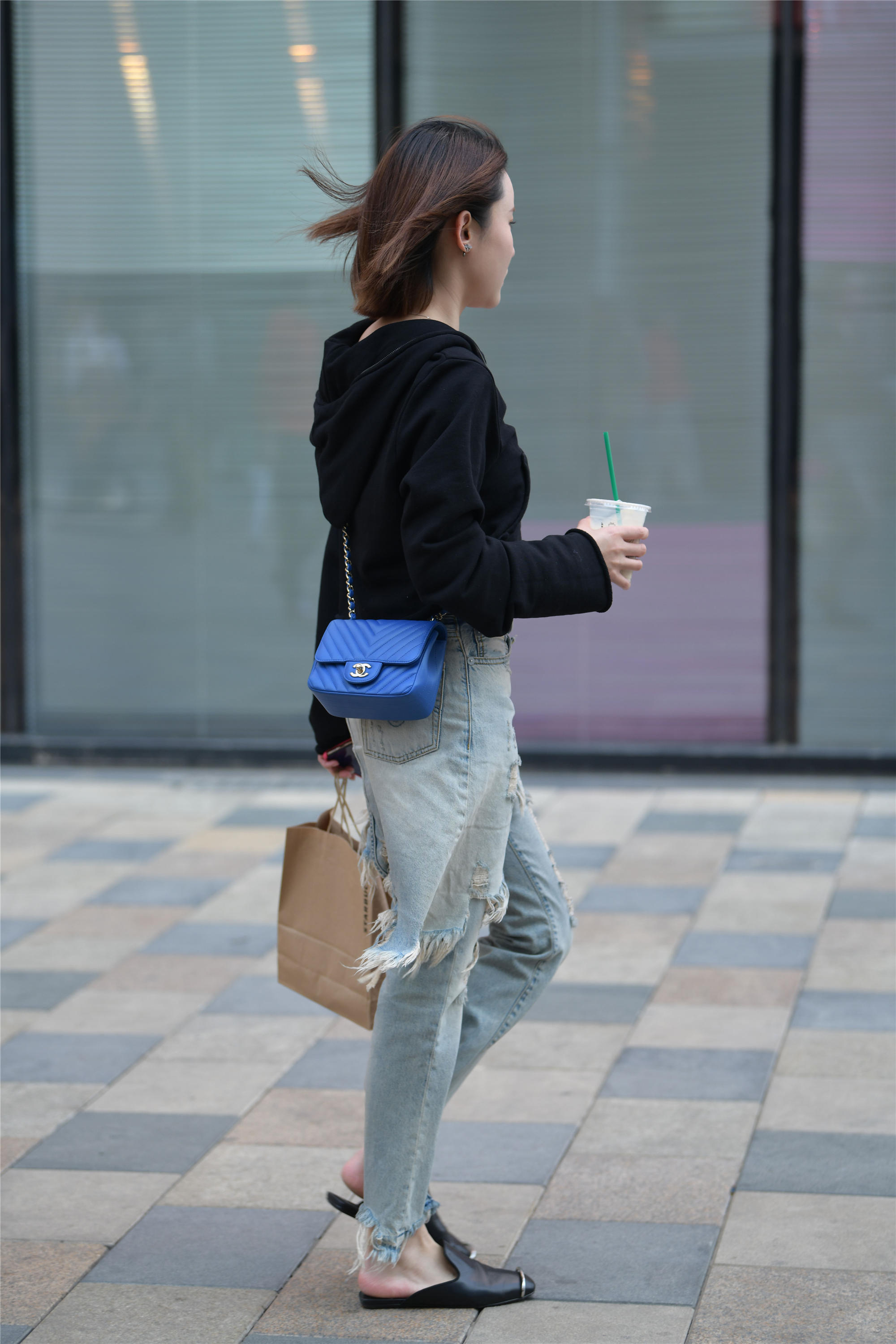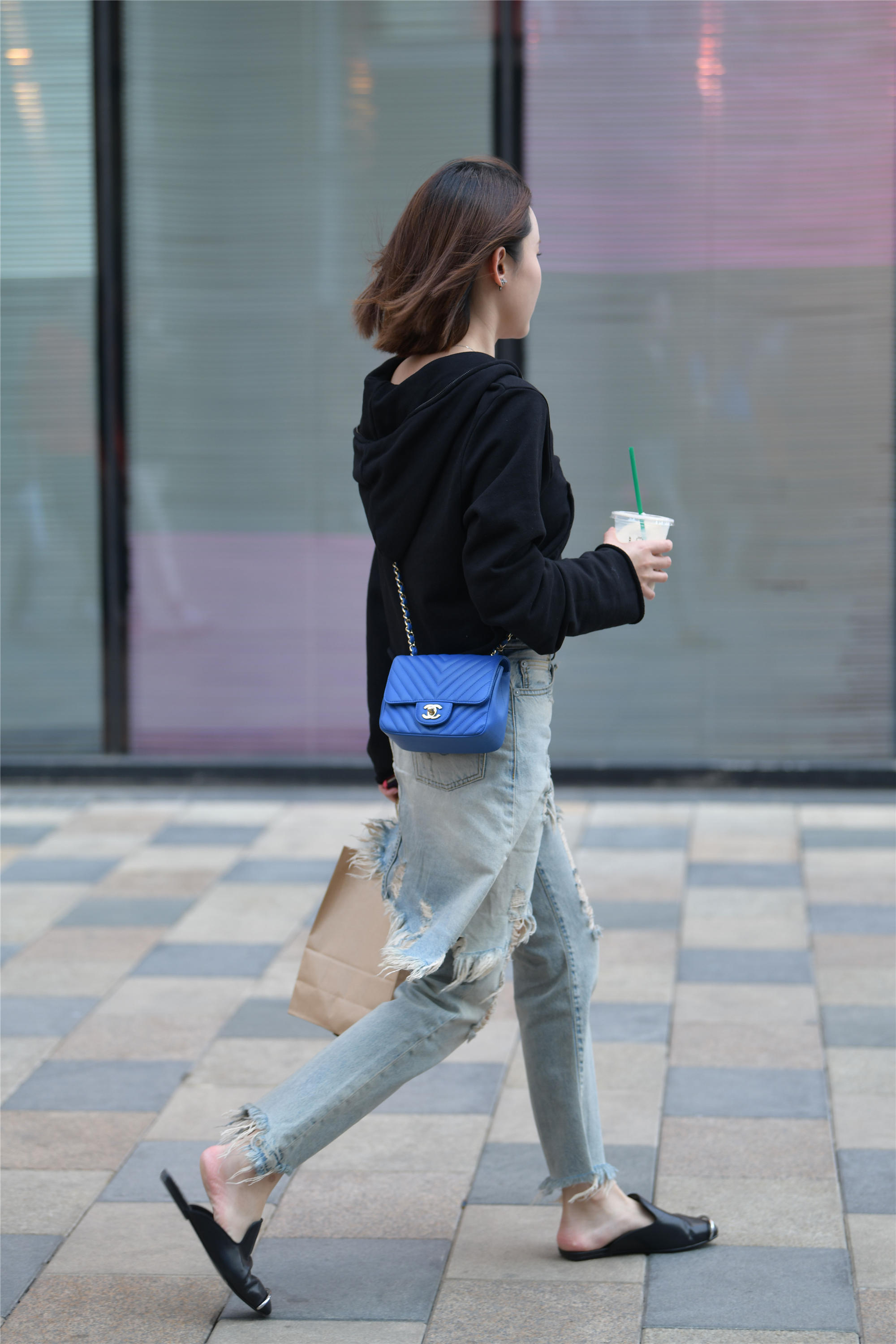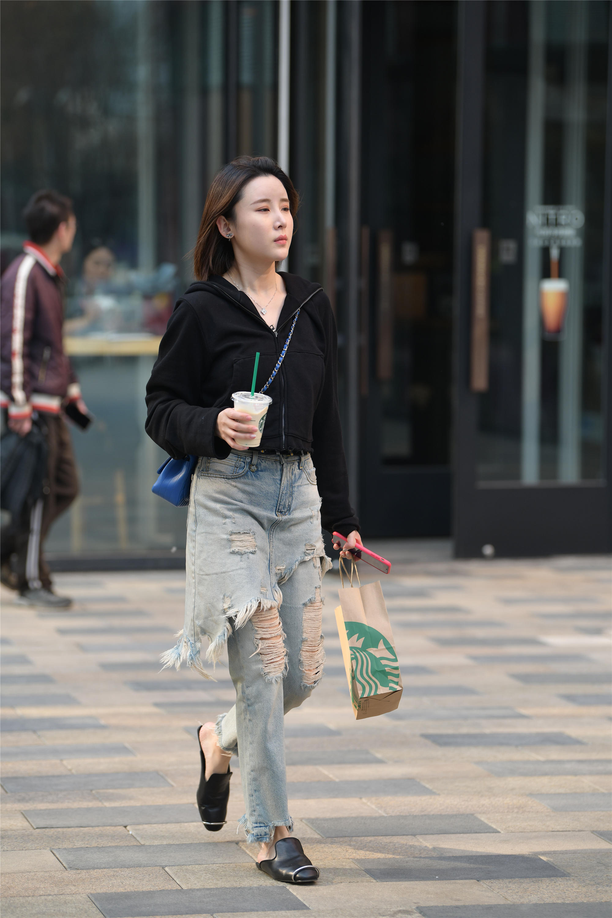 这位小姐姐,她选择一款水洗蓝的破洞牛仔,而破洞牛仔裤是非常流行的,而且各种各样的破洞牛仔裤都有,而这位姑娘选择的牛仔搭配却是破洞牛仔裤搭配破洞牛仔裙,是不是很有意思?这样搭配会不会很流行起来?如果是裤子和裙子搭配在一起,会觉得有些不协调,但是牛仔面料组合在一起,却显得很有个性,她穿着一件黑色短款小卫衣,搭配出很显身材比例的效果,蓝色的单间小包,斜背在肩上,增加了色彩,穿着一双黑色穆勒鞋,鞋尖前面是一个金属圈,增加个性,有着拖鞋的感觉,也带着中性的感觉。