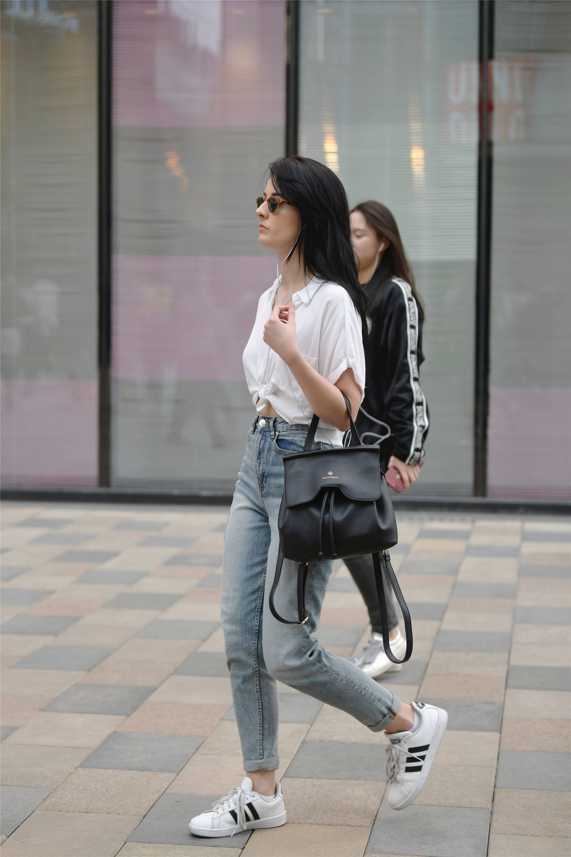 这位姑娘修身的九分牛仔裤,搭配一双黑色帆布鞋,姑娘特意把鞋子当成拖鞋来穿,非常个性的穿搭,蓝色牛仔裤搭配一件白色衬衫,衬衫掖在牛仔裤里面,显得姑娘身材高挑,身材比例也很好看,这样搭配穿起来简单,又不失时尚味道。