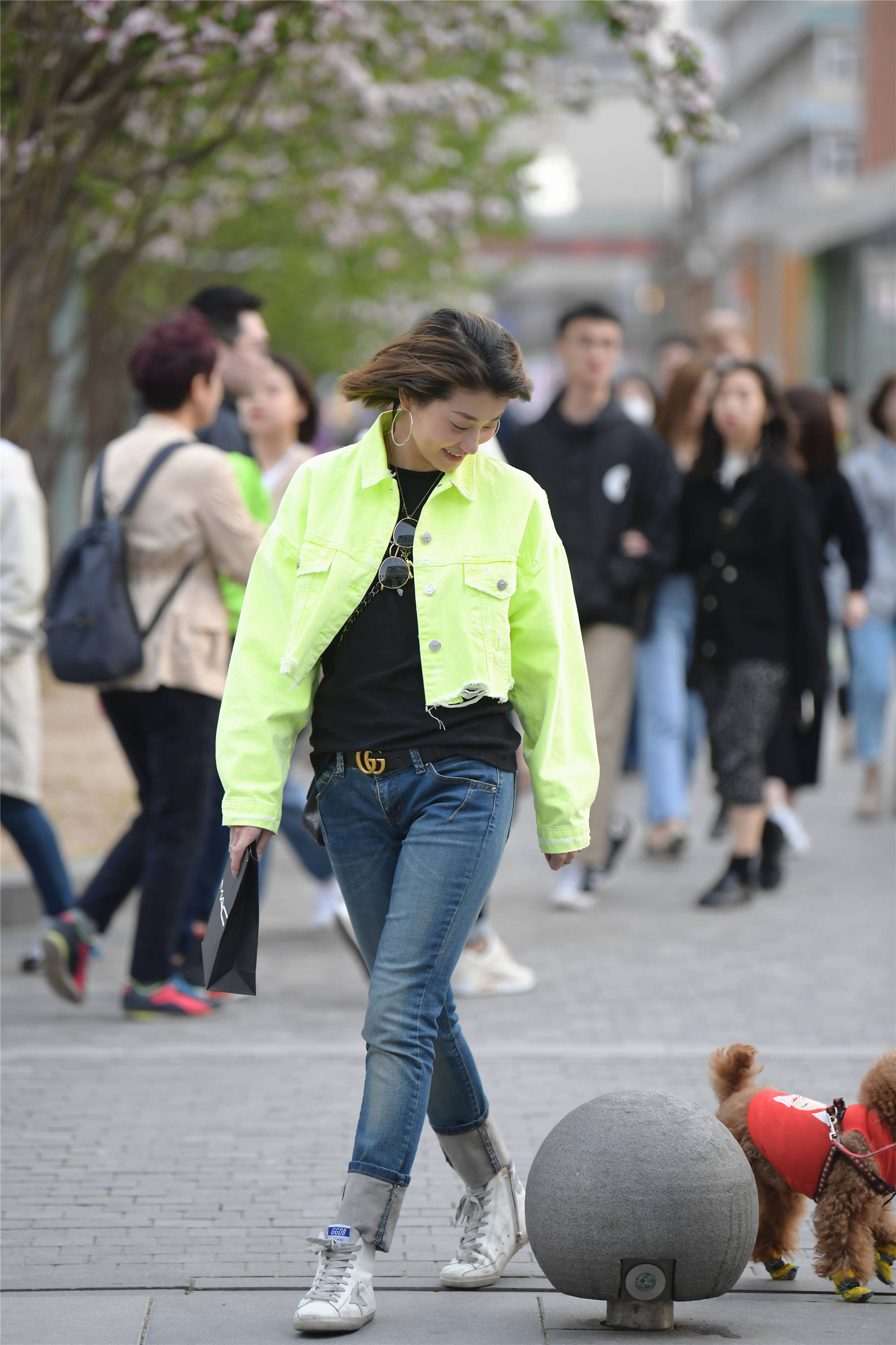 在春天穿着牛仔裤出门,可以搭配出自己的个性来,看一下这位姑娘,她穿着一条蓝色牛仔裤,裤脚很长,所以她把裤脚挽起来很长一截,这样显得非常个性,一双高帮的平底鞋,搭配出轻松自在的感觉,黑色T恤搭配一件糖果绿的短款牛仔夹克,色彩立马变得不一样了。