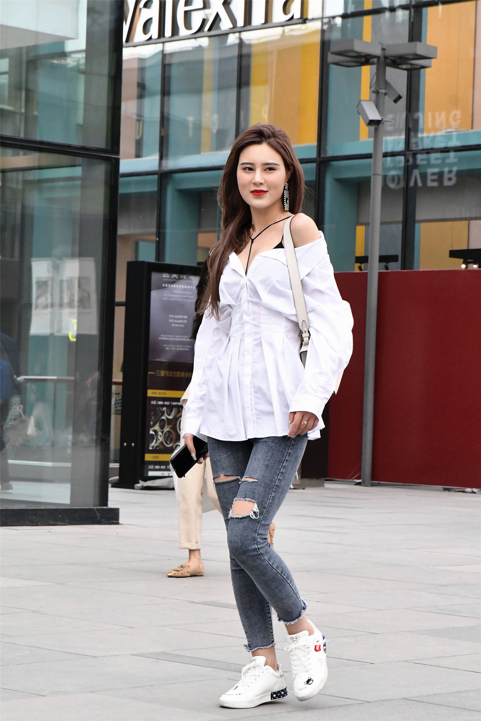 这位姑娘选择一款破洞的牛仔裤,修身效果很好,浅灰色显得低调一些,一件衬衫款式的上衣,还有这连衣裙的效果,姑娘特意露出一侧肩膀,展示自己的美感,一双白色平底鞋,显得很清新,还有休闲的搭配效果。