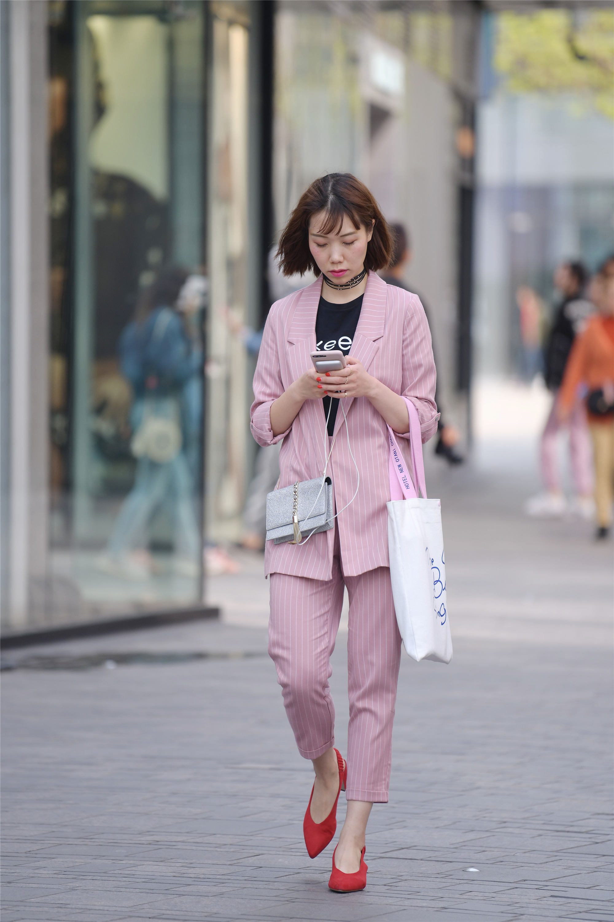 到了春天,很多时尚的姑娘走在街头,那么如何搭配出自己的风格,每个时尚的姑娘都有不同的想法,也展现处不一样的风格,这位姑娘选择西装,色彩是浅粉色的,很不错的色彩,春天要搭配的有色彩,会有很不错的效果,大码西服和九分西裤,有着休闲的感觉,一双红色尖头粗跟鞋,显得非常大方。