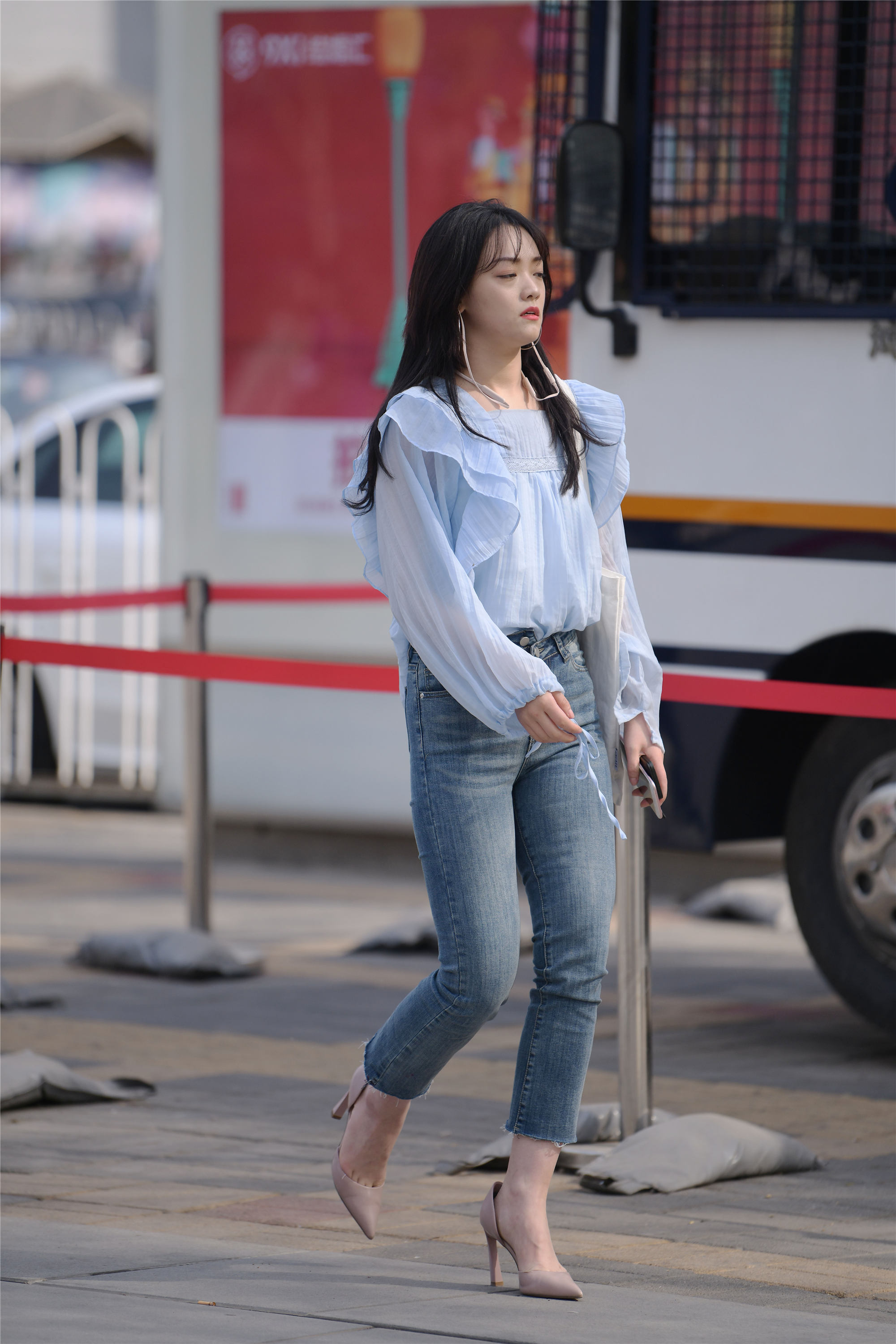 春天的北京,已经很暖和了,很多人开始穿着单鞋出来逛街,而且也会好好搭配一下,这位姑娘穿着高腰蓝色牛仔裤,九分的裤脚,展现出她的纤细脚踝,搭配一双血色尖头细跟浅口鞋,露出脚面,非常时尚,还显身材高挑,搭配一件蓝色透视衬衫,肩膀处设计的飞子,非常有层次,也显得有立体感。