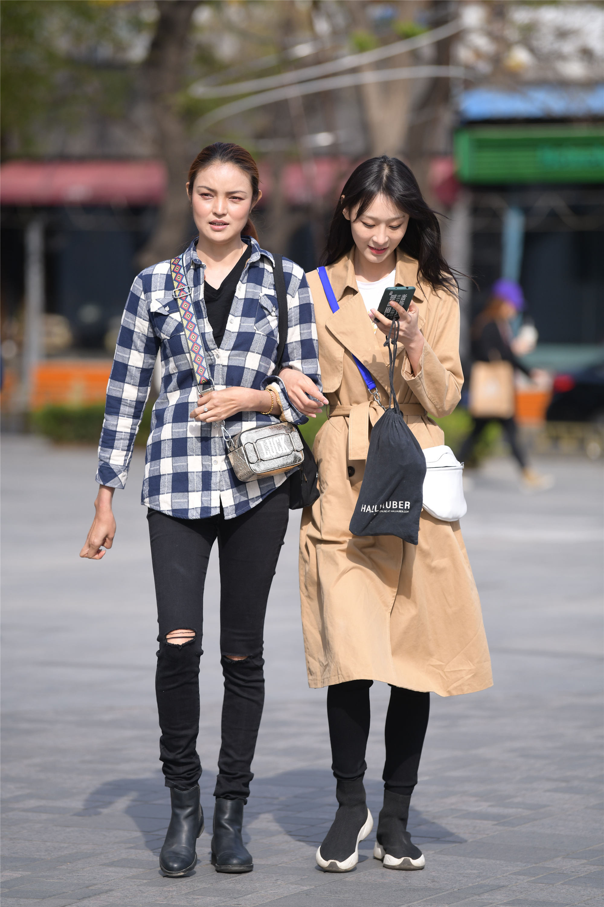 春天约着闺蜜去逛街,要搭配得不一样的才好,这样会各自展现自己的风格,这一对模特身材的姑娘,很会搭配,一位是卡其色风衣,腰带系个蝴蝶节,这样看着很显身材比例,修身的黑色裤子搭配一双运动运动袜靴,她的闺蜜是一件白色兰蓝色相间的格子衬衫,搭配黑色修身破洞牛仔裤,一双黑色皮质短靴,却搭配出大长腿的效果。