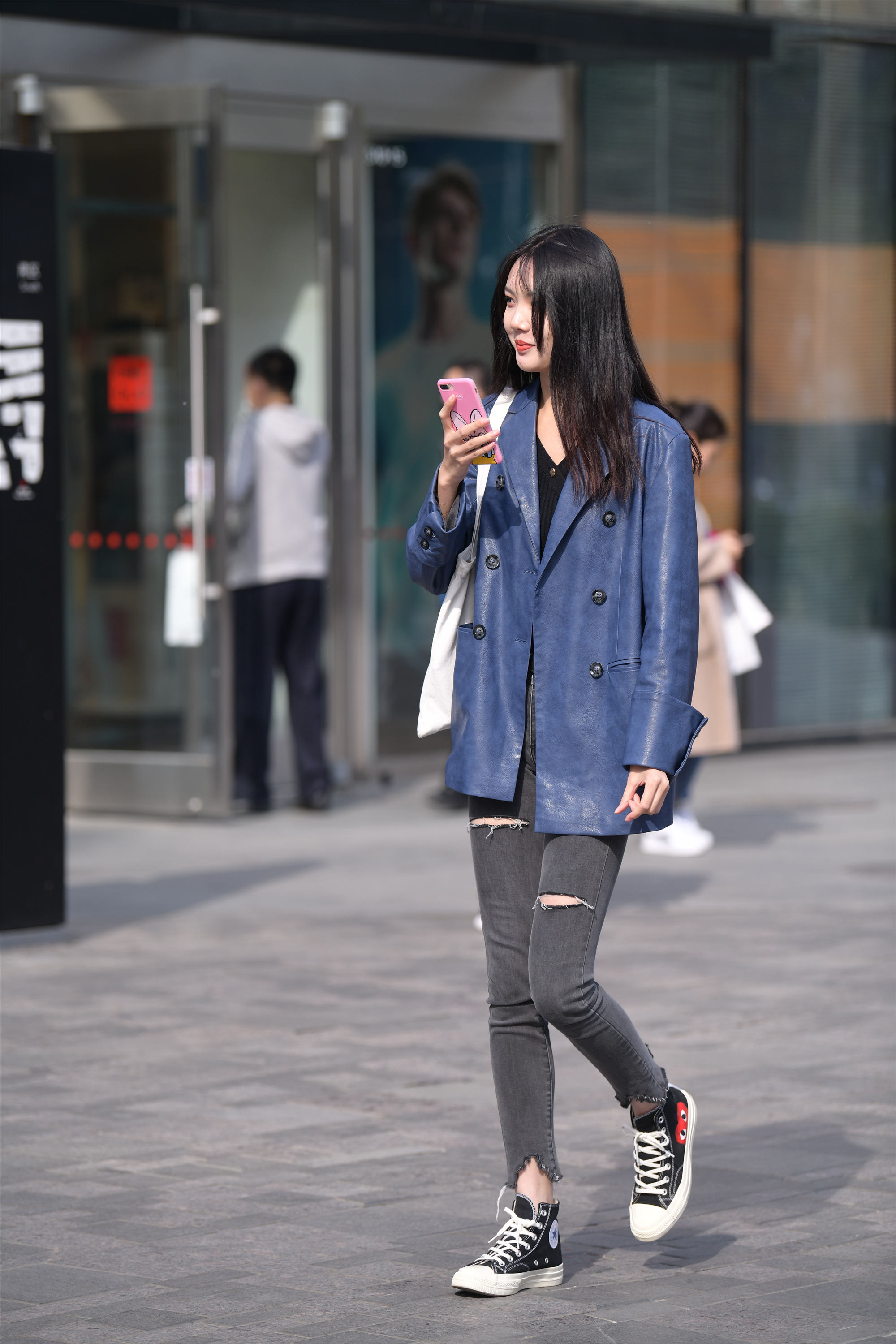 春天也可以搭配出混搭风格,看一下这位小姐姐的搭配,灰色的修身牛仔裤,大腿的部分割了一下,有着破洞得效果,非常有个性,毛边的裤脚,让牛仔裤有了九分的长度,一双黑色高帮帆布鞋,休闲味道十足,穿着一件蓝色皮质西装,和休闲的搭配组合在一起,有着很好的减龄的效果。