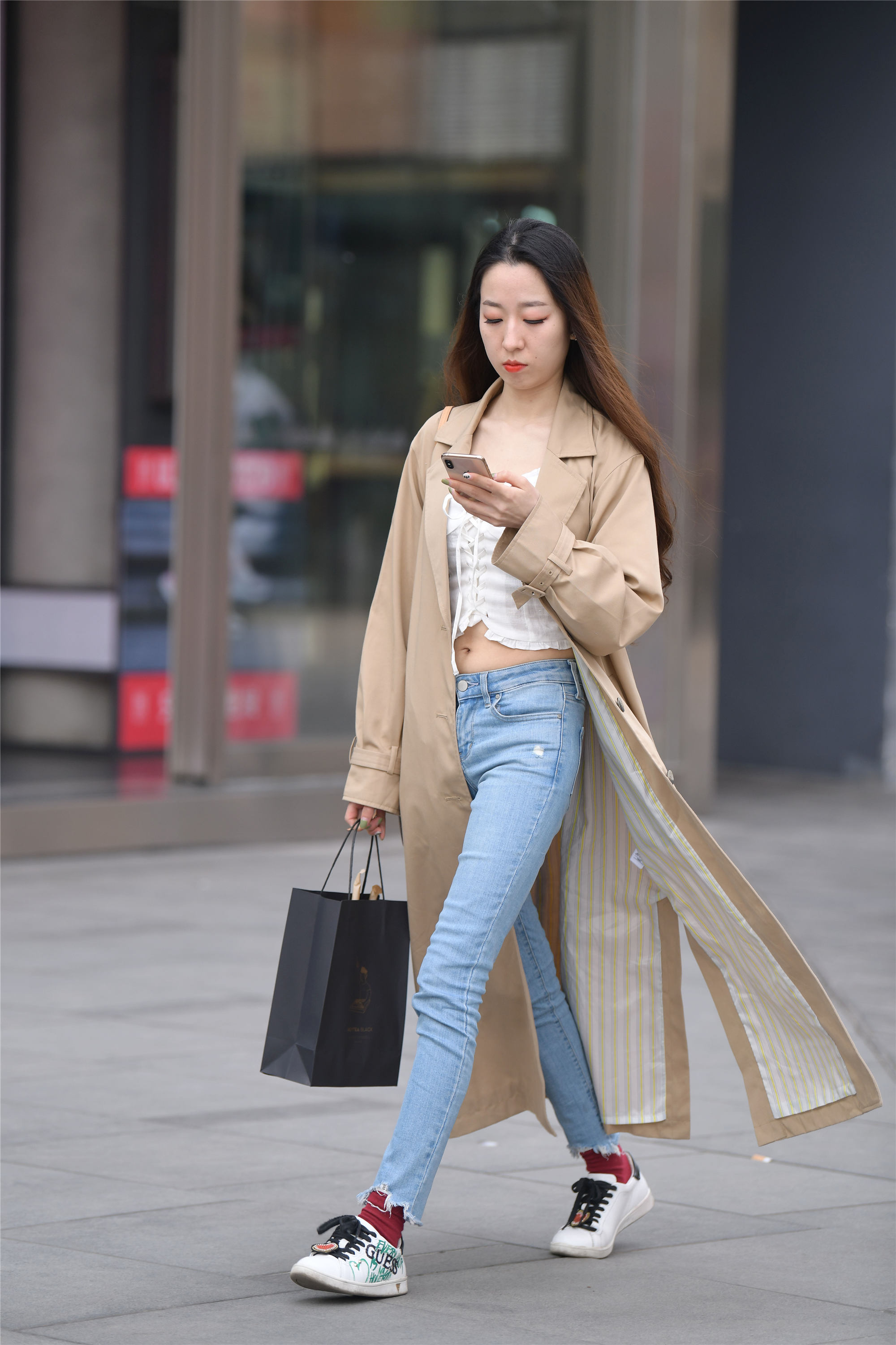 春天如果想穿着风衣,你会如何搭配呢?先看一下时尚街区的姑娘是如何搭配的,卡其色的风衣,扣子不要系上,一侧衣摆飘在后面,这样会有风度,一件白色小吊带,搭配低腰修身牛仔裤,露出腰部,这样显得身材高挑,也很显瘦,穿着一双平底的运动鞋,有着十足的运动休闲的风格。