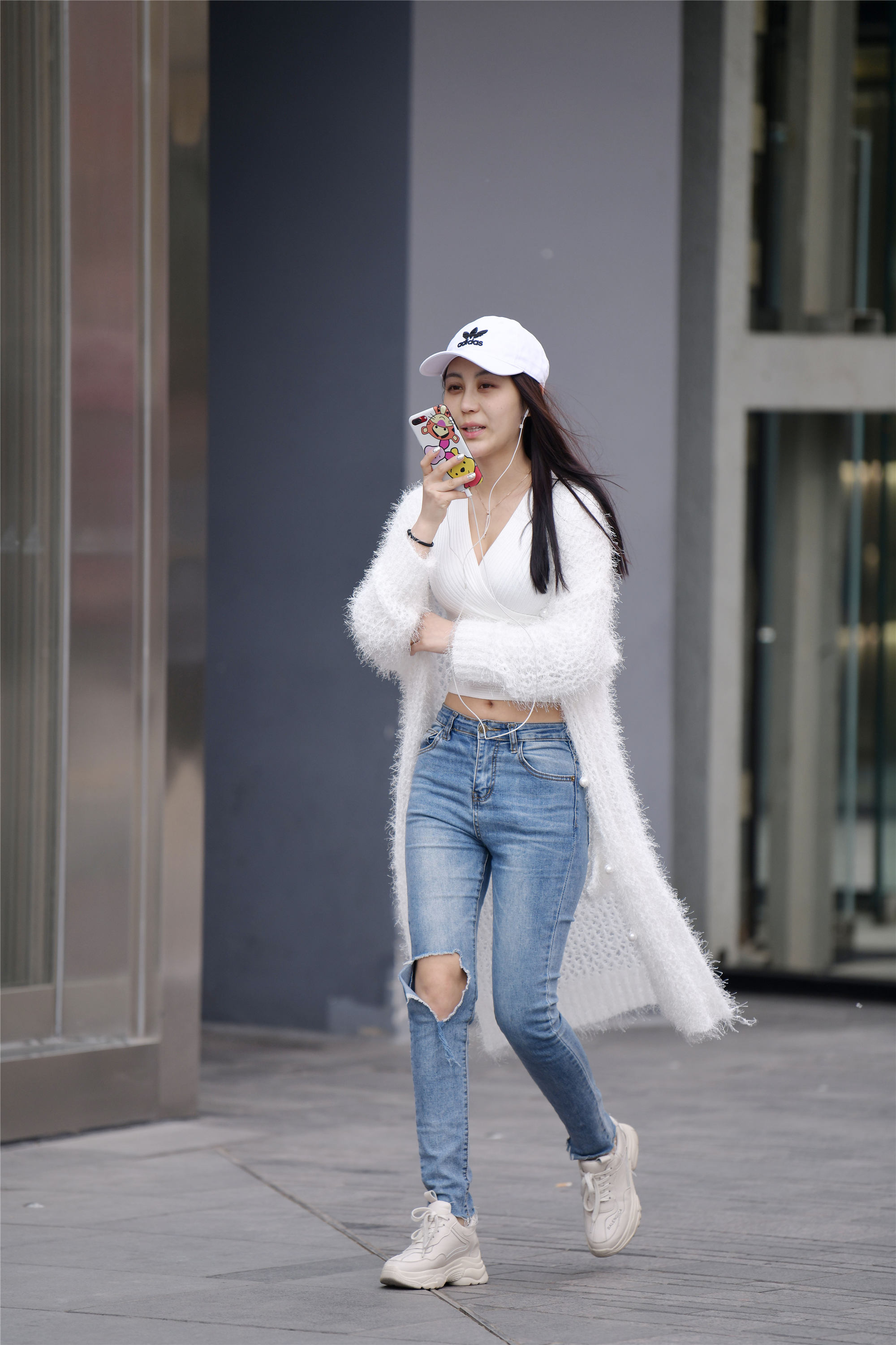 每一位时尚的姑娘,在春天都会有很不错效果,在春天要搭配的有层次感,这位姑娘选择一款针织风衣,衣摆飘在后面,非常个性,V领的休闲小衫,修身效果很好,中腰的修身牛仔裤,一个膝盖位置还有着着破洞,搭配一双运动鞋,一身休闲时尚的逛街搭配。