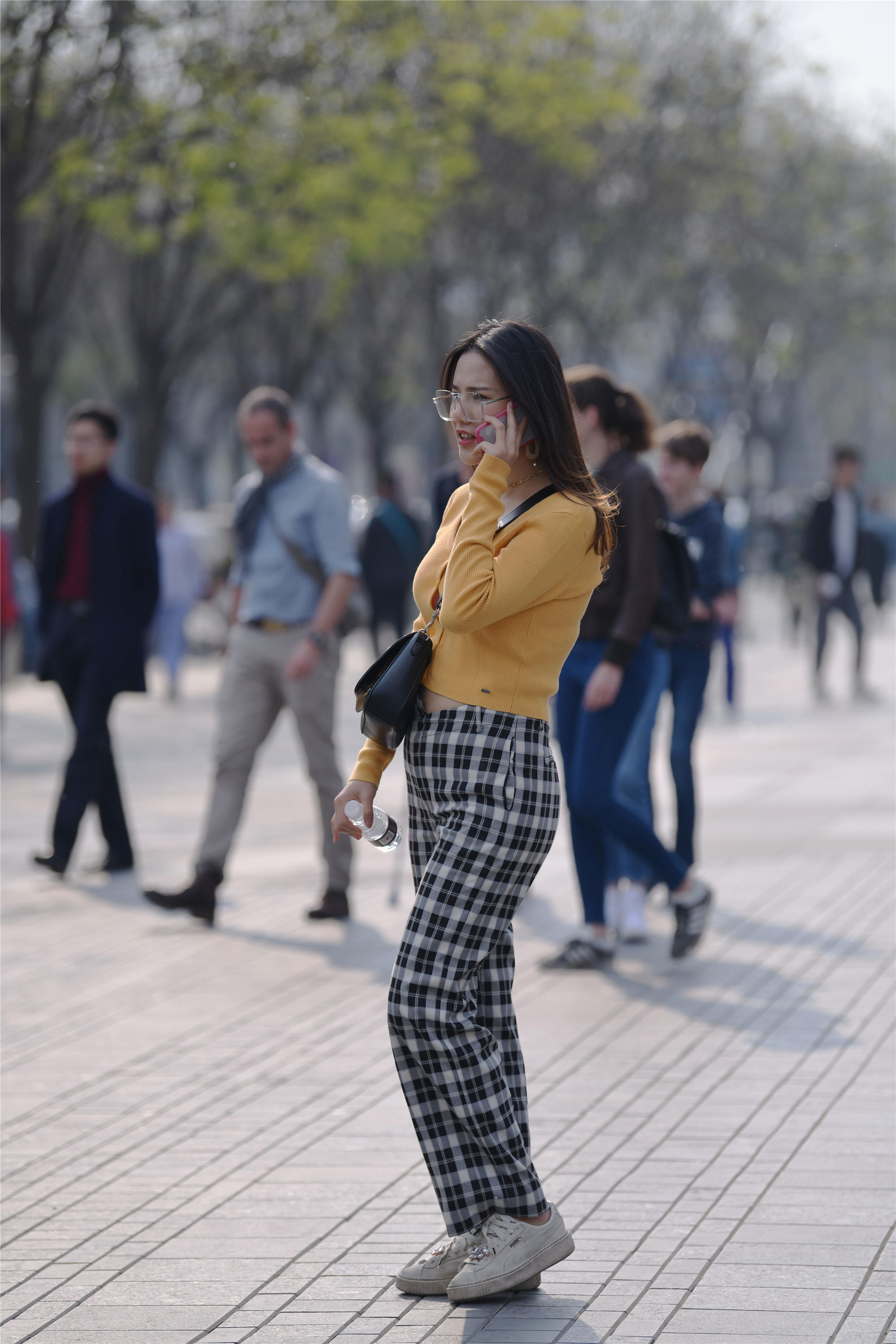 在春天,休闲的搭配更多一下,让逛街变得像春游一样放松,也搭配小女生的感觉,姑娘这款黑白色格子长裤,搭配一件黄色针织修身上衣,身材略显丰腴,也搭配出很好的身材比例效果,穿着一双脏脏鞋,就是特意带着这样一点味道来搭配。
